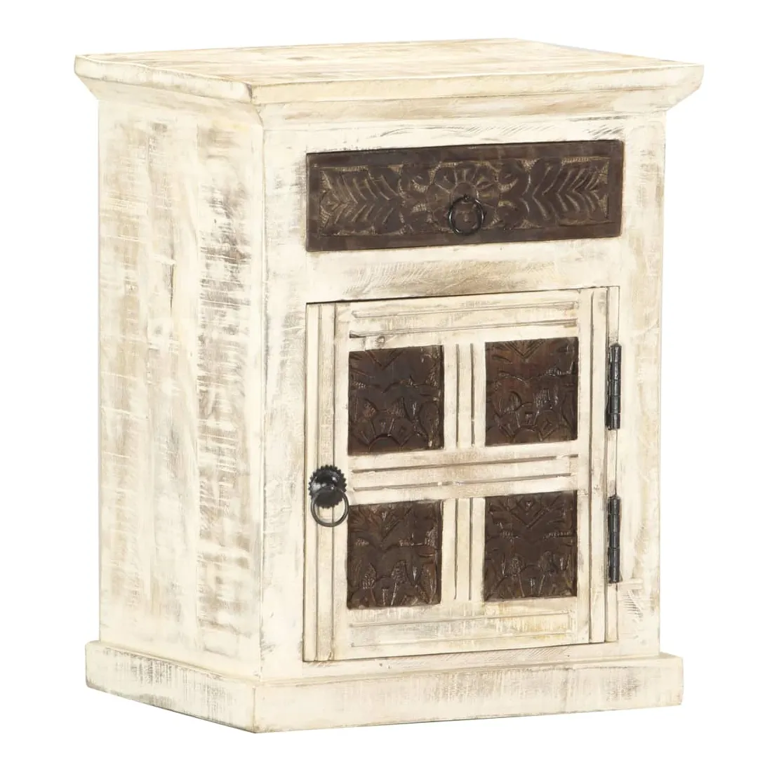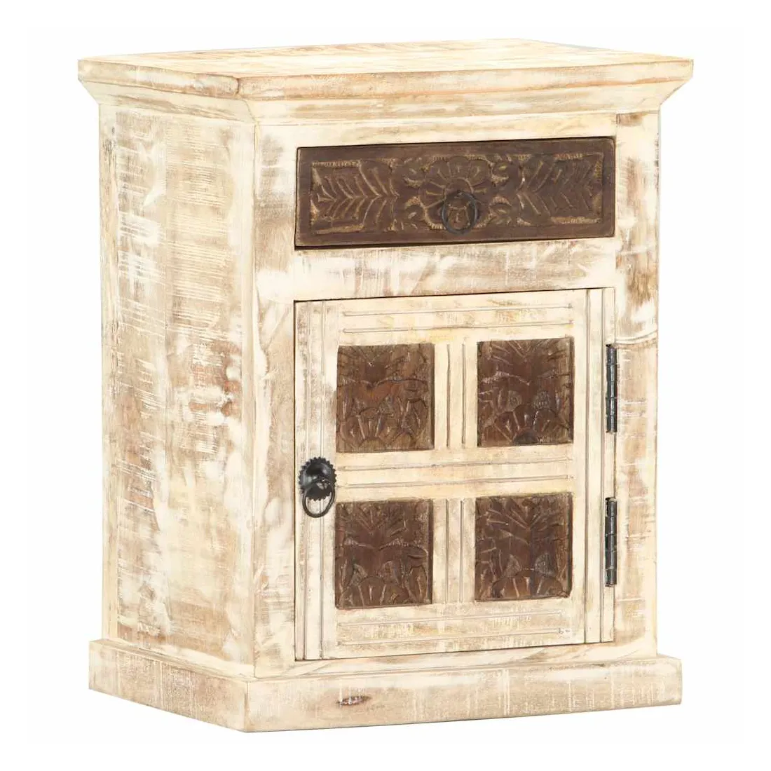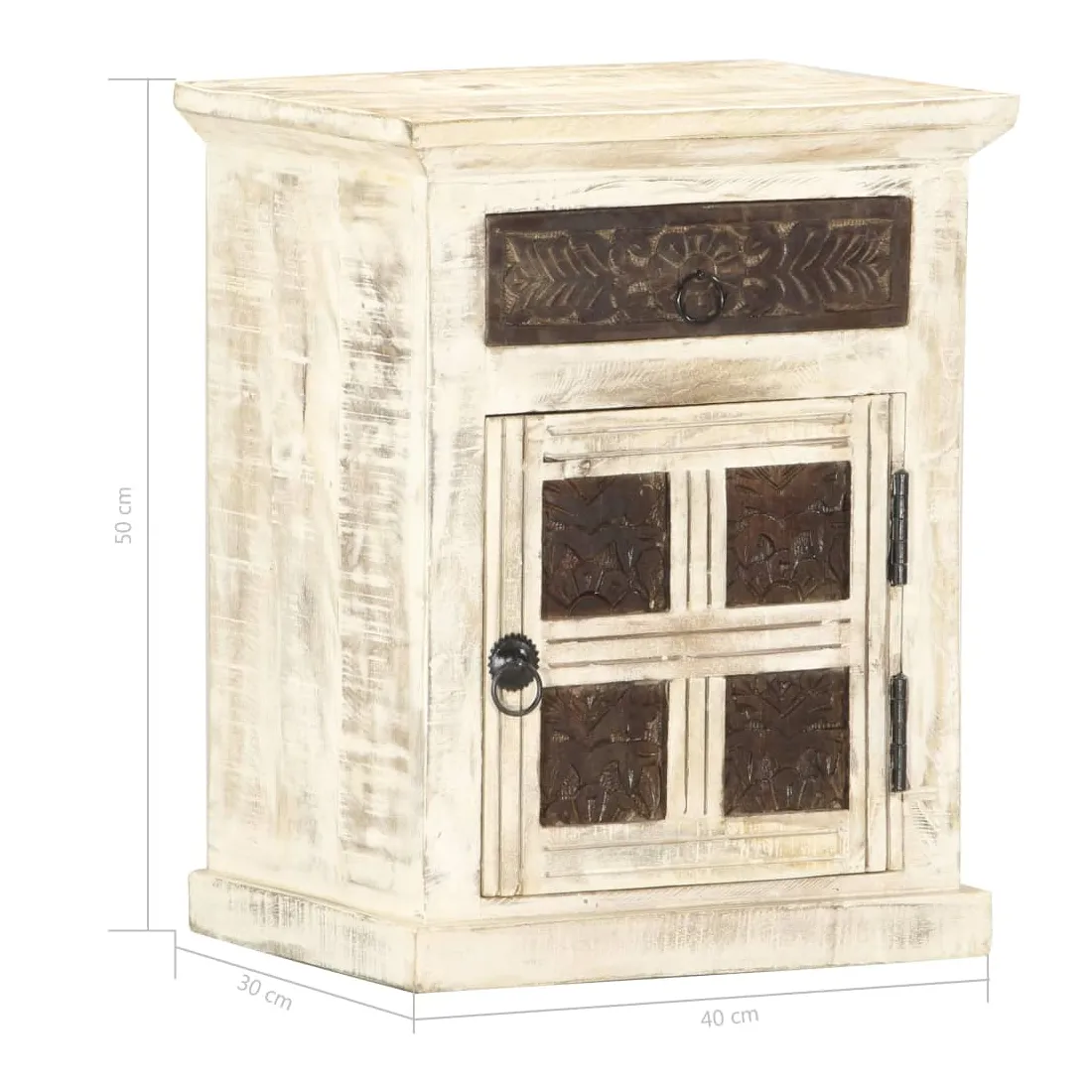 vidaXLCe meuble de chevet de style antique dégage un charme vintage et sera un supplément parfait à votre intérieur. Cette table de chevet est faite de bois de manguier massif, qui est un bois dur aux grains denses. Le bois de manguier brut a non seulement la force de supporter le poids, mais il résiste aussi à l'usure du temps. C'est pourquoi ce meuble de chambre à coucher, au design élégant, est stable, durable et attrayant. La fabrication parfaite garantit que chaque étape du processus est réalisée avec le plus grand soin, que ce soit le polissage, la peinture ou le laquage. En outre, cette armoire a 1 porte et 1 tiroir avec motif sculpté offre suffisamment d'espace pour ranger vos blocs-notes, livres et divers autres articles. Cet article est déjà assemblé ; aucun assemblage n'est requis. Remarque importante : les couleurs et les grains varient d'une pièce à l'autre, rendant chaque pièce unique. La livraison est aléatoire, ce qui garantit l'exclusivité et l'individualité de votre produit.