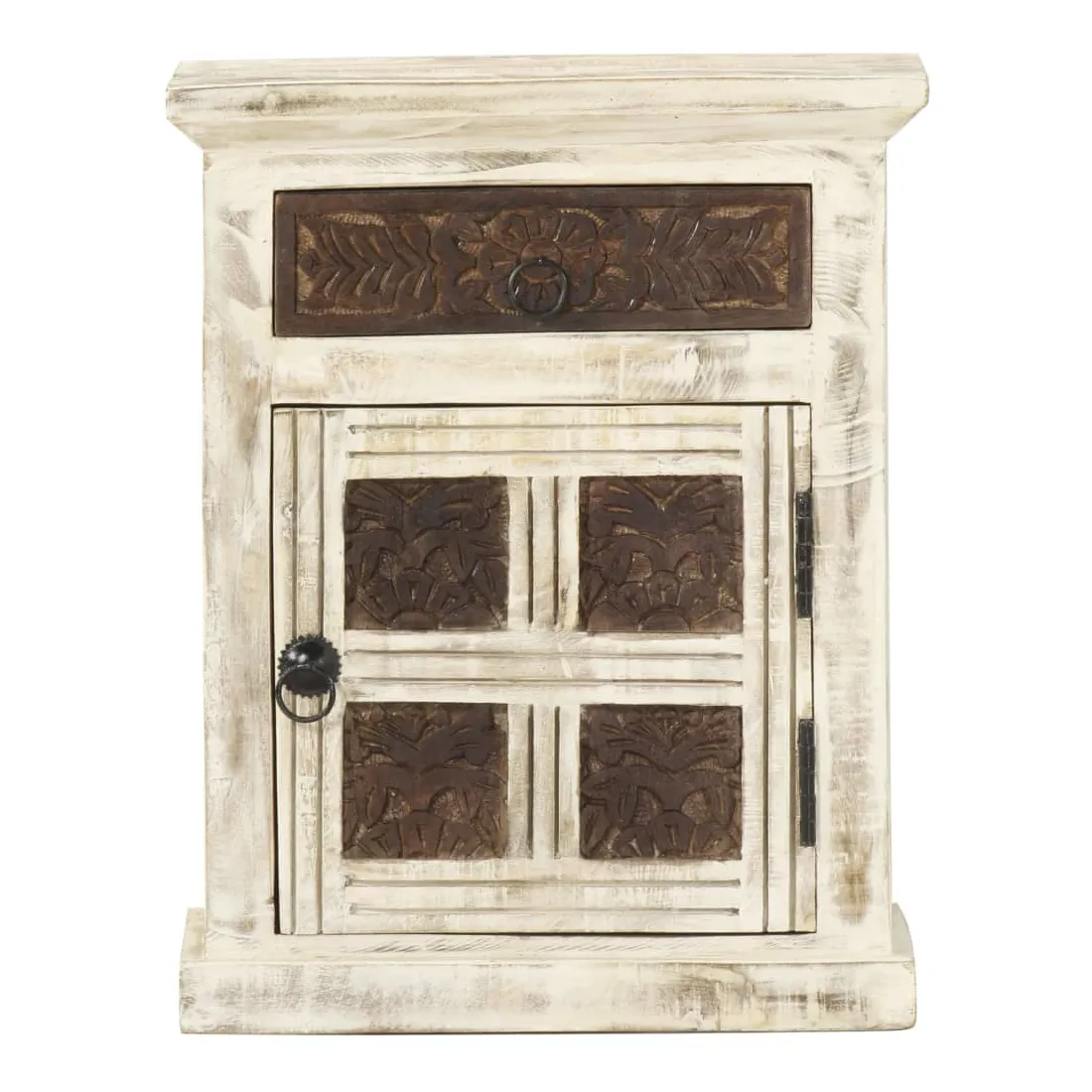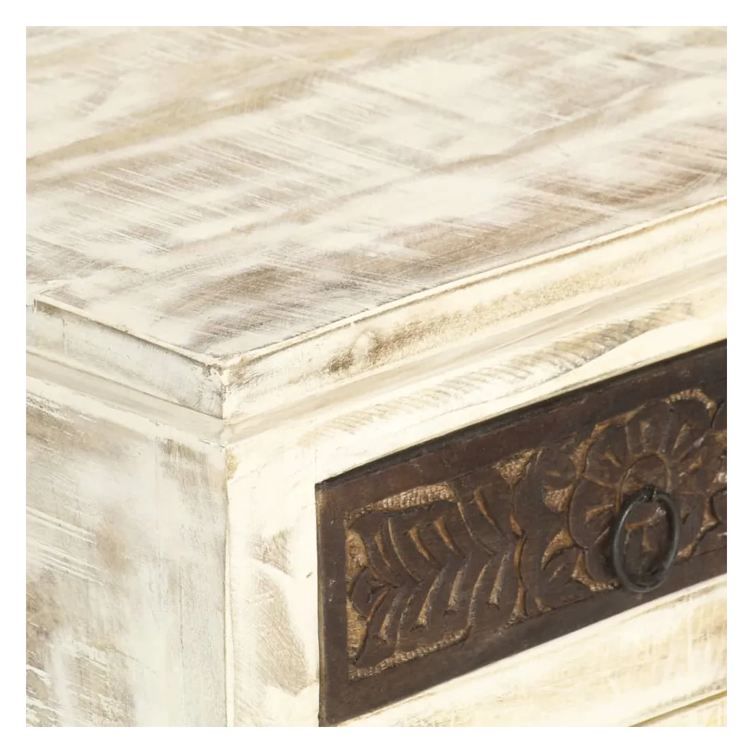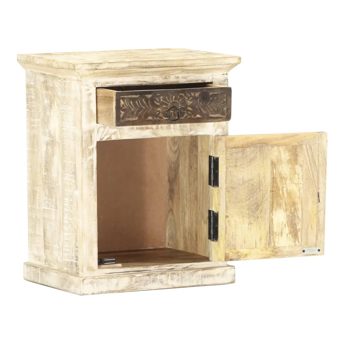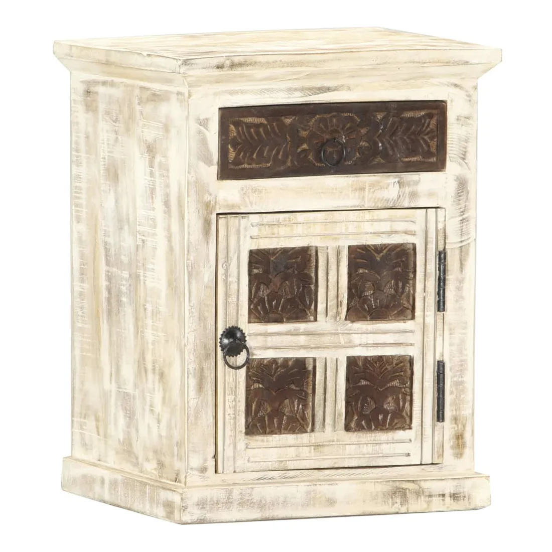 vidaXLCe meuble de chevet de style antique dégage un charme vintage et sera un supplément parfait à votre intérieur. Cette table de chevet est faite de bois de manguier massif, qui est un bois dur aux grains denses. Le bois de manguier brut a non seulement la force de supporter le poids, mais il résiste aussi à l'usure du temps. C'est pourquoi ce meuble de chambre à coucher, au design élégant, est stable, durable et attrayant. La fabrication parfaite garantit que chaque étape du processus est réalisée avec le plus grand soin, que ce soit le polissage, la peinture ou le laquage. En outre, cette armoire a 1 porte et 1 tiroir avec motif sculpté offre suffisamment d'espace pour ranger vos blocs-notes, livres et divers autres articles. Cet article est déjà assemblé ; aucun assemblage n'est requis. Remarque importante : les couleurs et les grains varient d'une pièce à l'autre, rendant chaque pièce unique. La livraison est aléatoire, ce qui garantit l'exclusivité et l'individualité de votre produit.