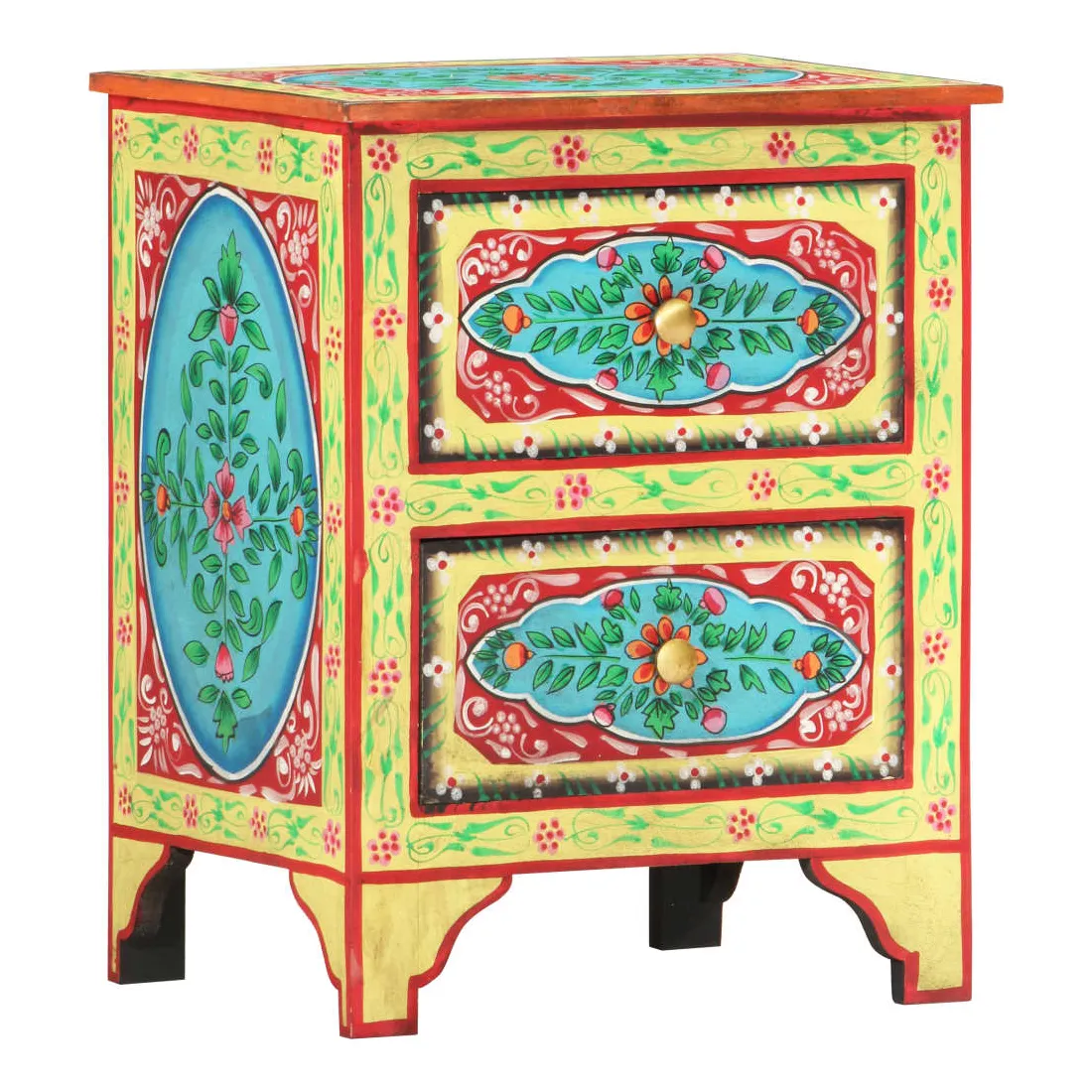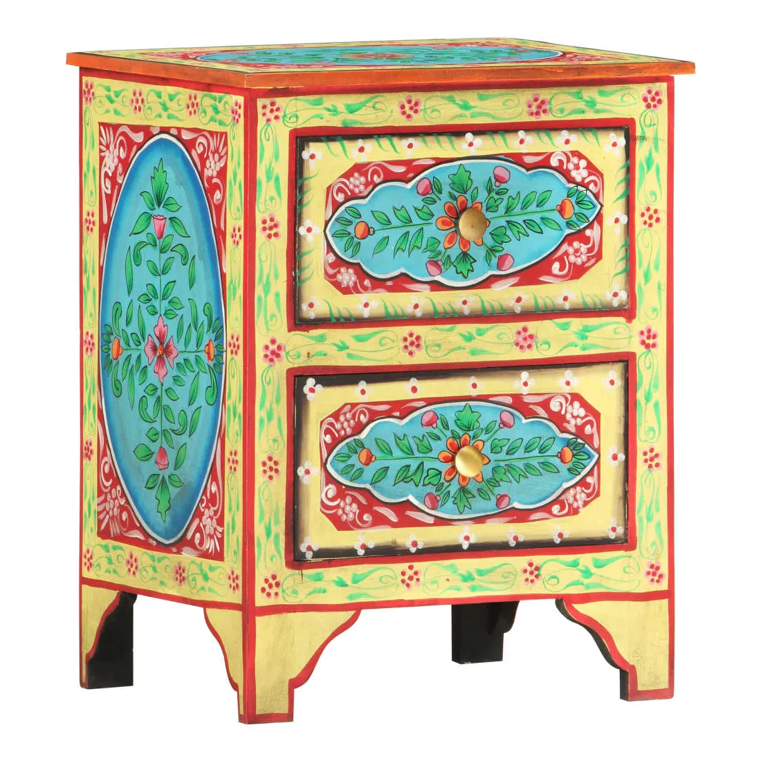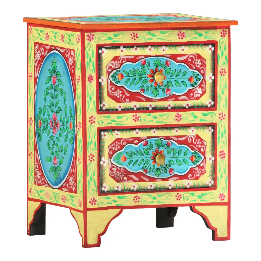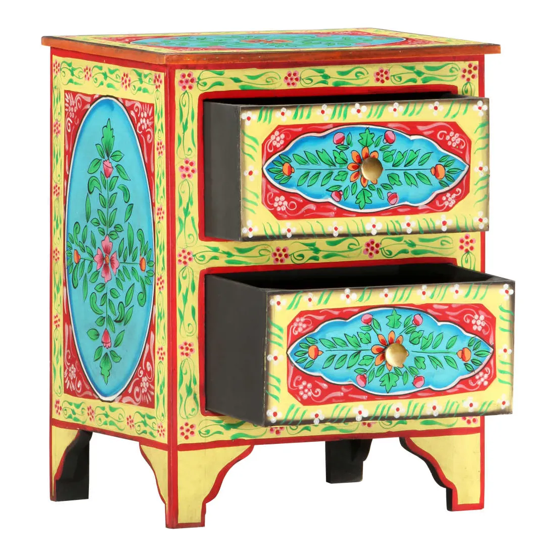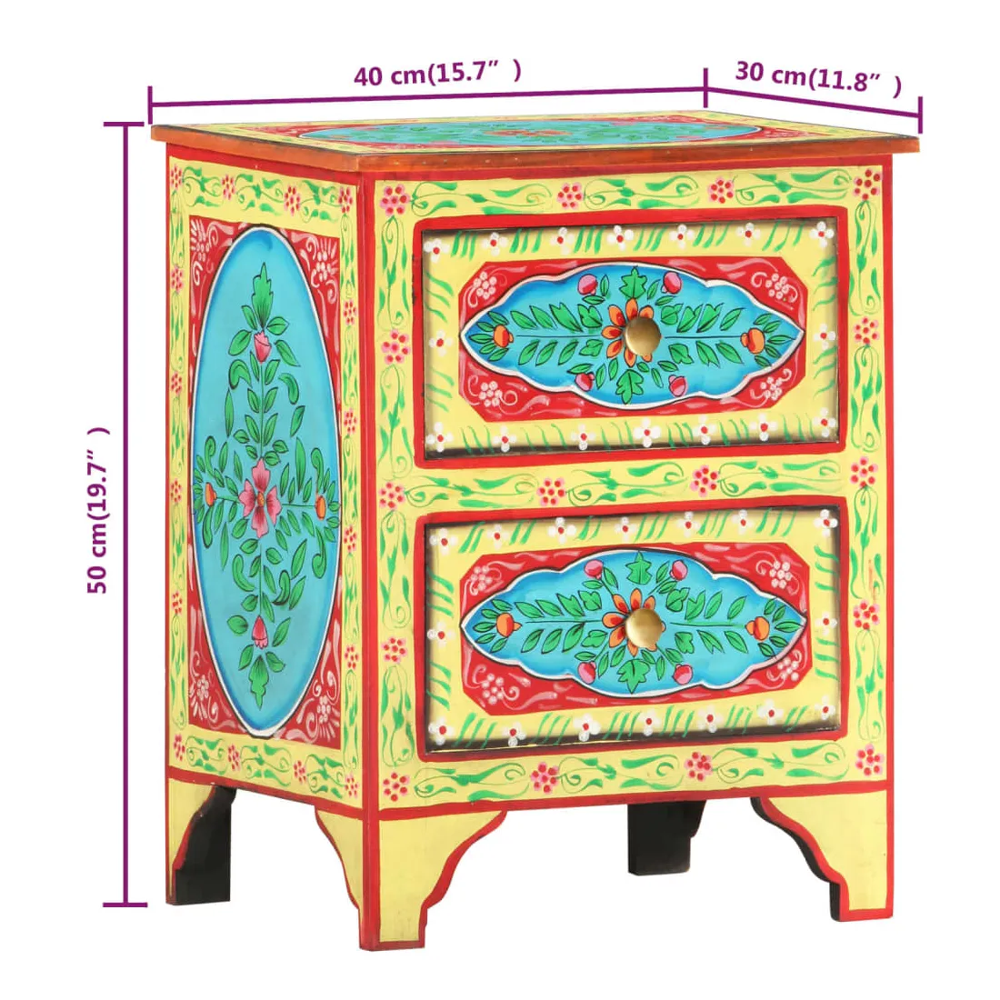 Cette belle table de chevet, ornée de riches décorations peintes à la main, sera un supplément accrocheur à votre chambre à coucher avec son design coloré. La table de chevet est fabriquée en bois de manguier et en MDF qui est à la fois durable et beau, et l'artisanat ajoute à son style rétro spectaculaire. Chaque étape du processus est réalisée avec le plus grand soin, que ce soit le polissage, la peinture ou le laquage. La table de chevet comporte de nombreux détails décoratifs peints à la main, ce qui crée un effet chaleureux et riche. Cette table de chevet a un dessus robuste, sur lequel vous pouvez placer une lampe de chevet, un réveil ou tout ce dont vous pourriez avoir besoin près de votre lit. Les tiroirs offrent suffisamment d'espace pour garder toutes sortes de petits objets organisés et à portée de main. L'article est déjà assemblé ; aucun assemblage n'est requis.