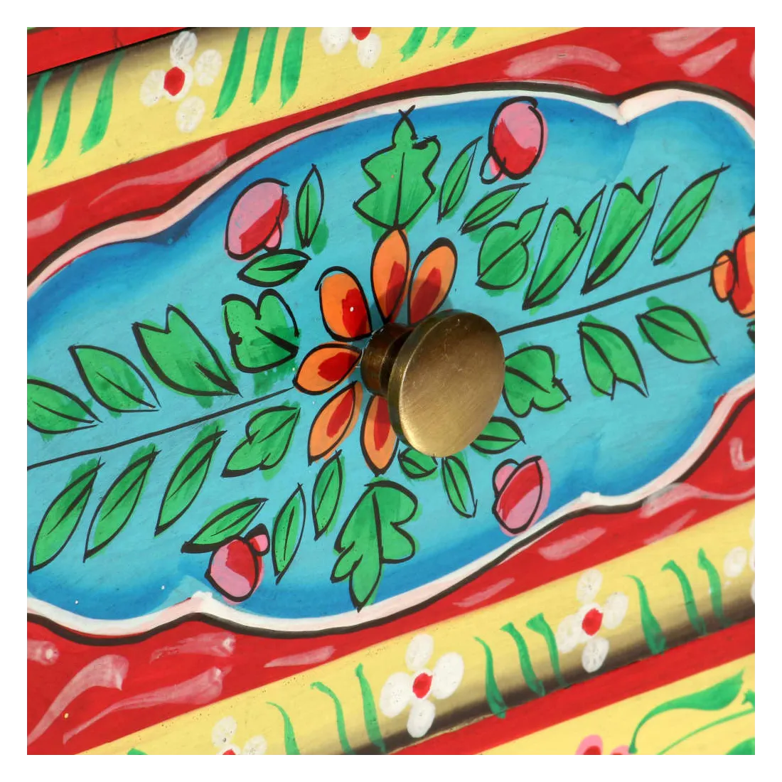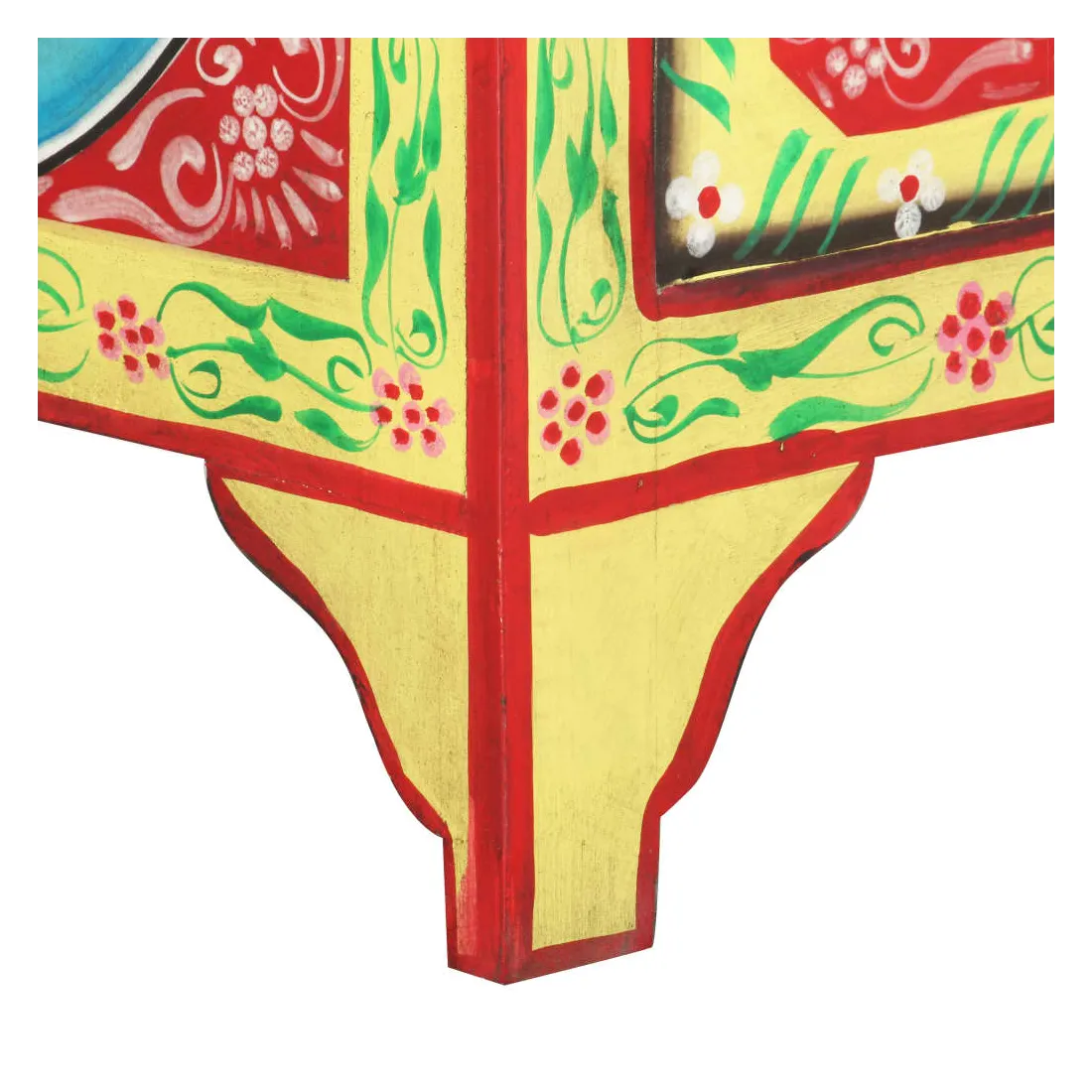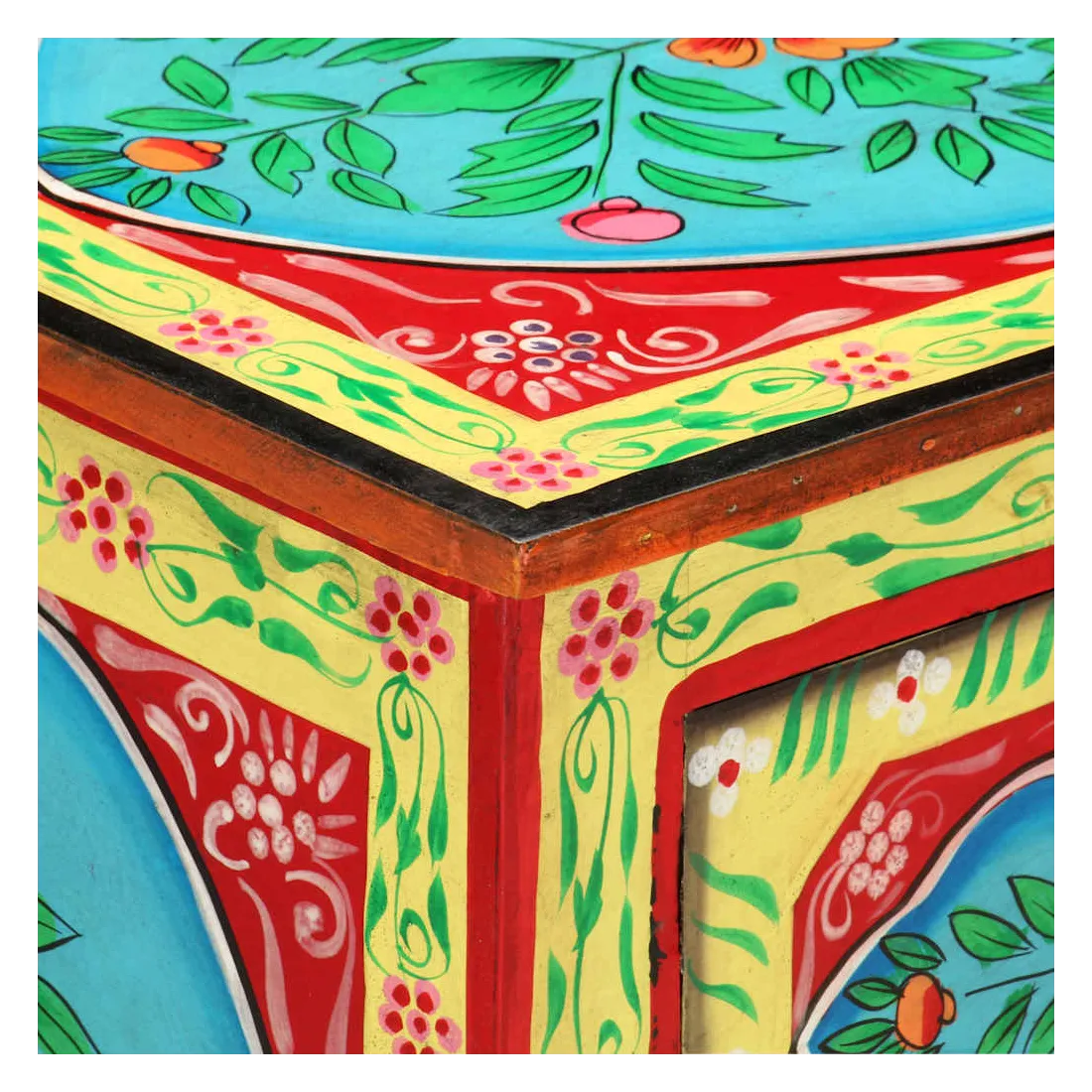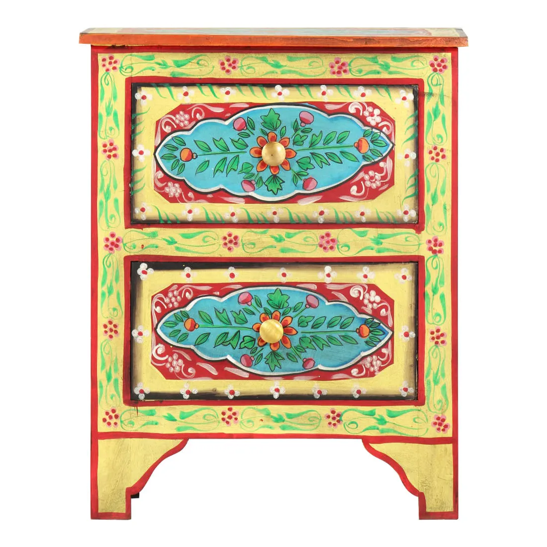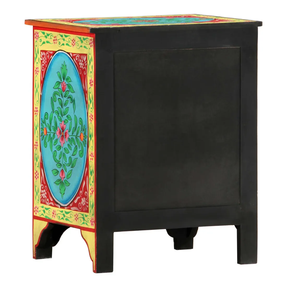 Cette belle table de chevet, ornée de riches décorations peintes à la main, sera un supplément accrocheur à votre chambre à coucher avec son design coloré. La table de chevet est fabriquée en bois de manguier et en MDF qui est à la fois durable et beau, et l'artisanat ajoute à son style rétro spectaculaire. Chaque étape du processus est réalisée avec le plus grand soin, que ce soit le polissage, la peinture ou le laquage. La table de chevet comporte de nombreux détails décoratifs peints à la main, ce qui crée un effet chaleureux et riche. Cette table de chevet a un dessus robuste, sur lequel vous pouvez placer une lampe de chevet, un réveil ou tout ce dont vous pourriez avoir besoin près de votre lit. Les tiroirs offrent suffisamment d'espace pour garder toutes sortes de petits objets organisés et à portée de main. L'article est déjà assemblé ; aucun assemblage n'est requis.