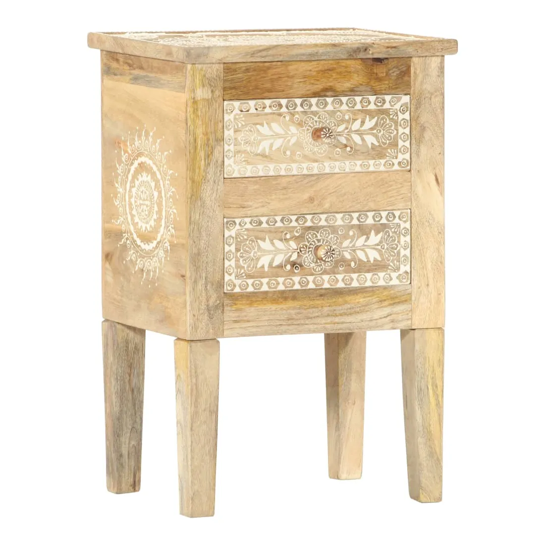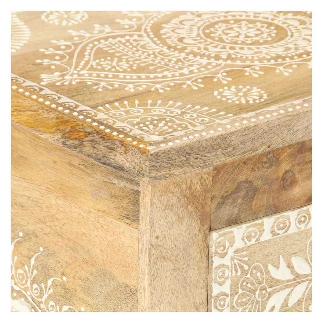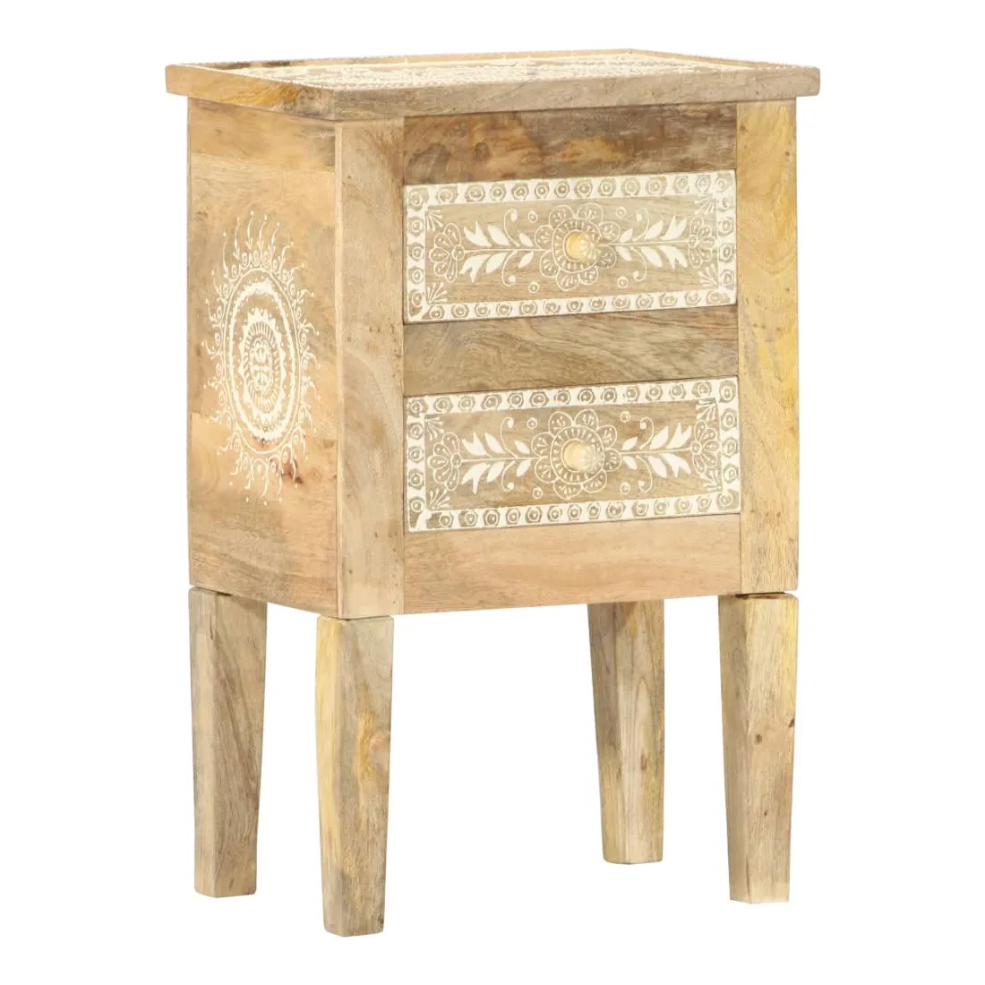 Cette table de chevet de style vintage et pratique sera un supplément intemporel à votre décoration intérieure. La table de chevet, avec des pièces peintes à la main à l'avant, est faite à la main en bois de manguier massif qui est un bois dur dense et robuste avec des belles stries et des contours bruns ou dorés sur sa surface. Chaque étape du processus est réalisée avec le plus grand soin, qu'il s'agisse de polissage ou de laquage, et le savoir-faire ajoute au style rétro spectaculaire. Les beaux grains de bois rendent chaque meuble unique et légèrement différent l'un de l'autre. Cette armoire de chevet a un dessus robuste, sur lequel vous pouvez placer une lampe de chevet, un réveil ou tout ce dont vous pourriez avoir besoin près de votre lit. Les tiroirs offrent suffisamment d'espace pour garder toutes sortes de petits objets organisés et à portée de main. Cet article est facile à assembler. Remarque importante : les couleurs varient d'une pièce à l'autre, rendant chaque pièce unique. La livraison est aléatoire, ce qui garantit l'exclusivité et l'individualité de votre produit.