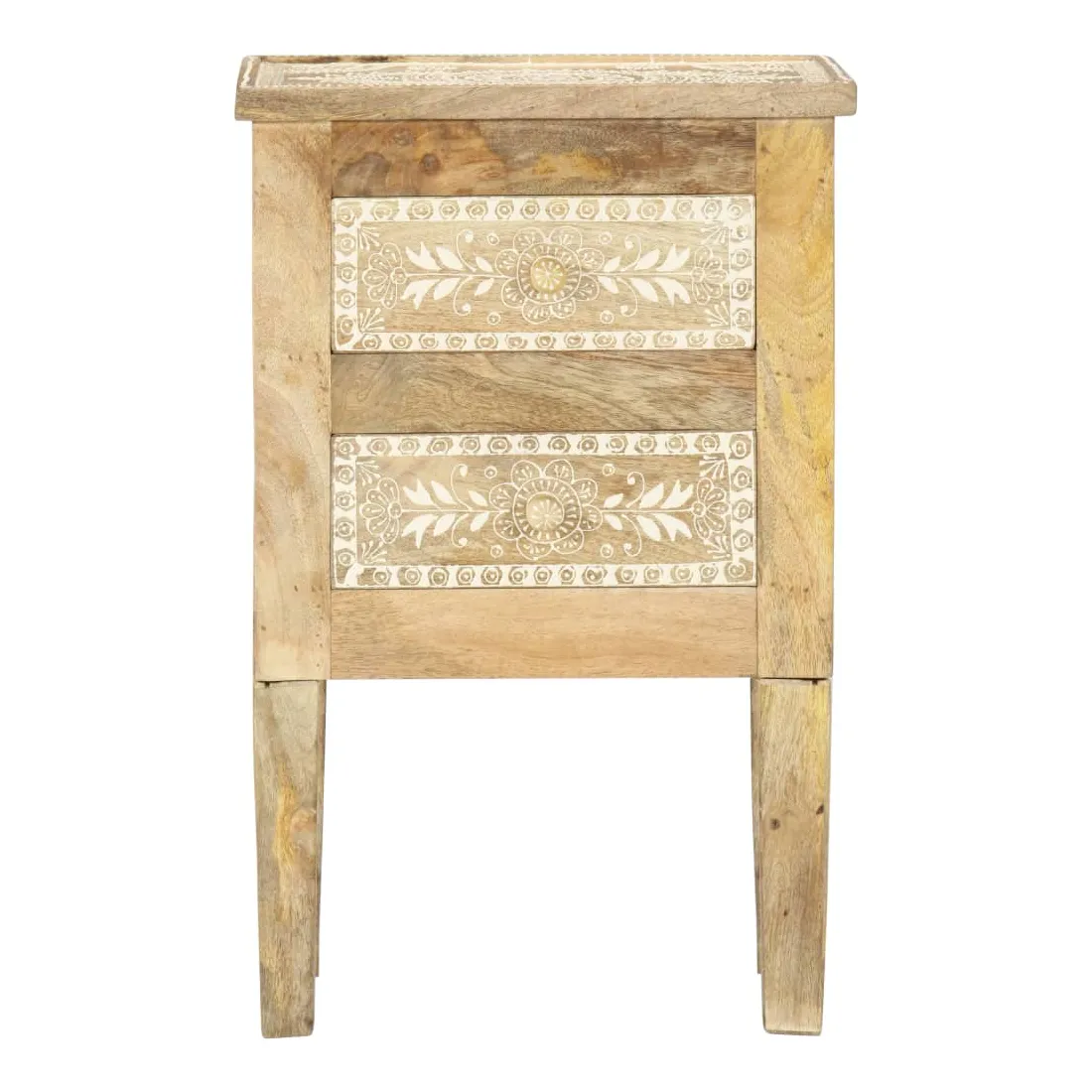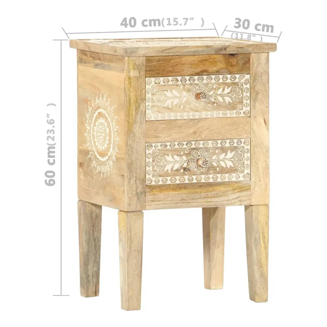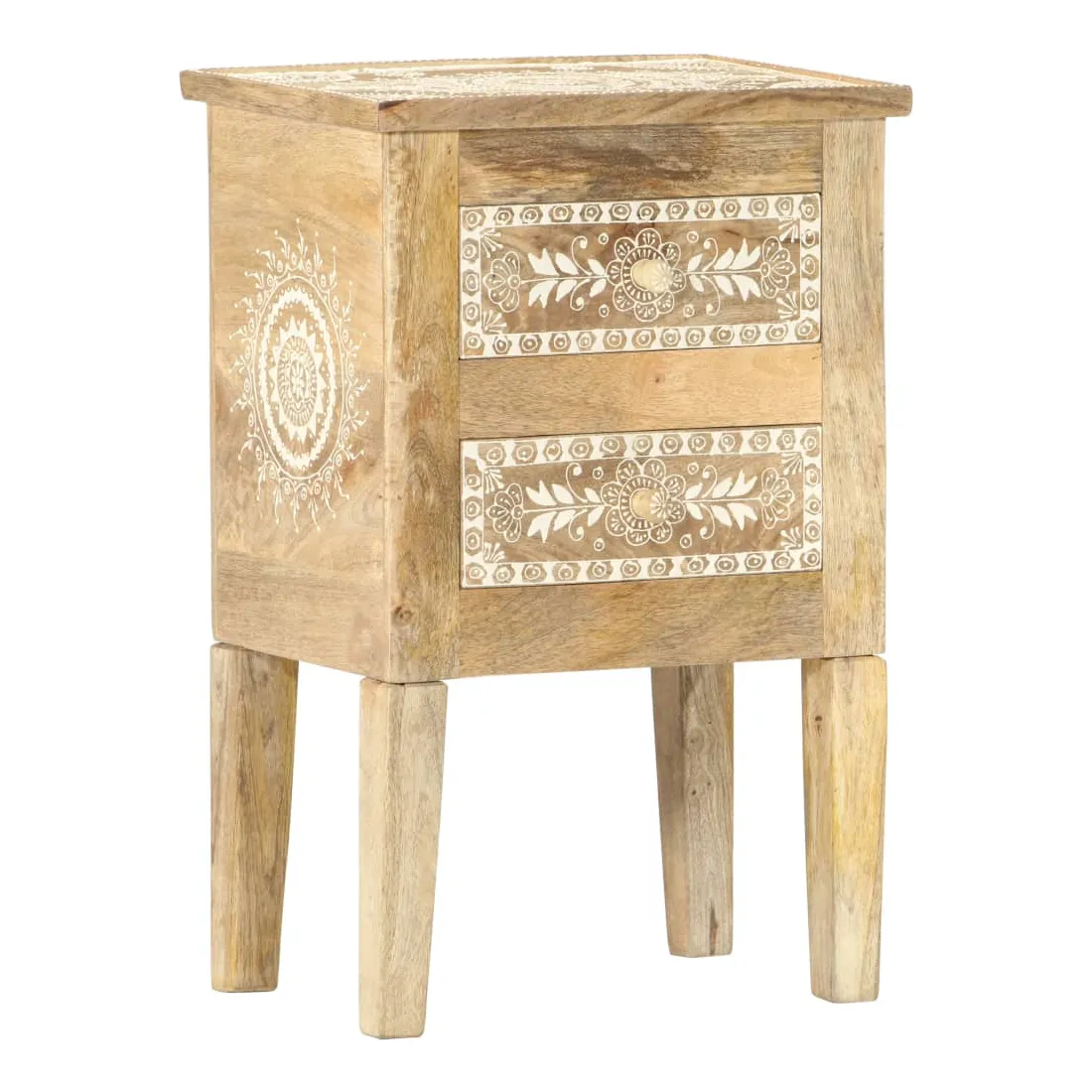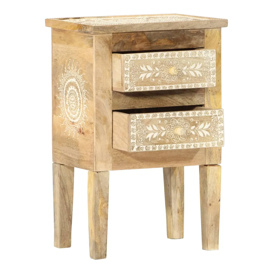 Cette table de chevet de style vintage et pratique sera un supplément intemporel à votre décoration intérieure. La table de chevet, avec des pièces peintes à la main à l'avant, est faite à la main en bois de manguier massif qui est un bois dur dense et robuste avec des belles stries et des contours bruns ou dorés sur sa surface. Chaque étape du processus est réalisée avec le plus grand soin, qu'il s'agisse de polissage ou de laquage, et le savoir-faire ajoute au style rétro spectaculaire. Les beaux grains de bois rendent chaque meuble unique et légèrement différent l'un de l'autre. Cette armoire de chevet a un dessus robuste, sur lequel vous pouvez placer une lampe de chevet, un réveil ou tout ce dont vous pourriez avoir besoin près de votre lit. Les tiroirs offrent suffisamment d'espace pour garder toutes sortes de petits objets organisés et à portée de main. Cet article est facile à assembler. Remarque importante : les couleurs varient d'une pièce à l'autre, rendant chaque pièce unique. La livraison est aléatoire, ce qui garantit l'exclusivité et l'individualité de votre produit.
