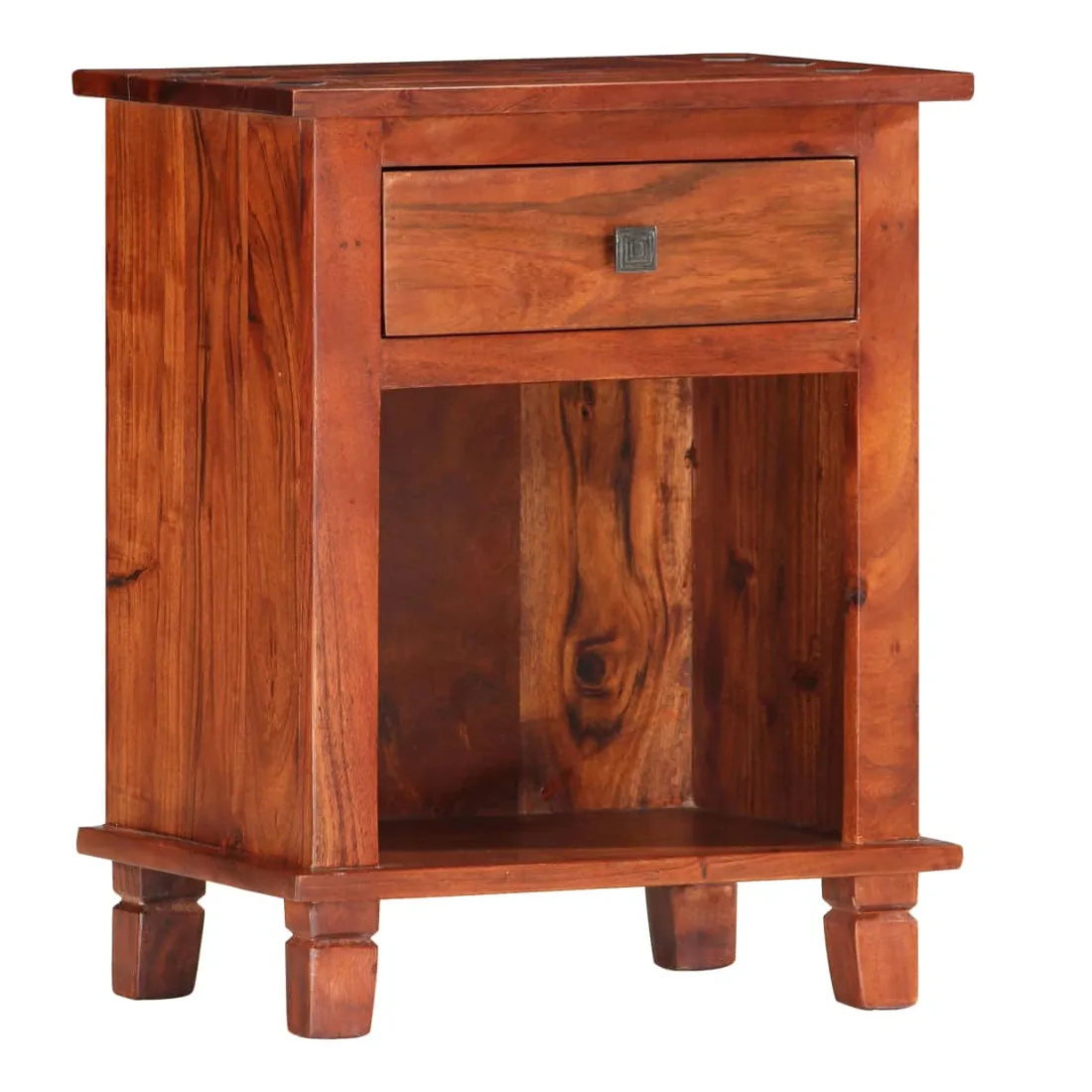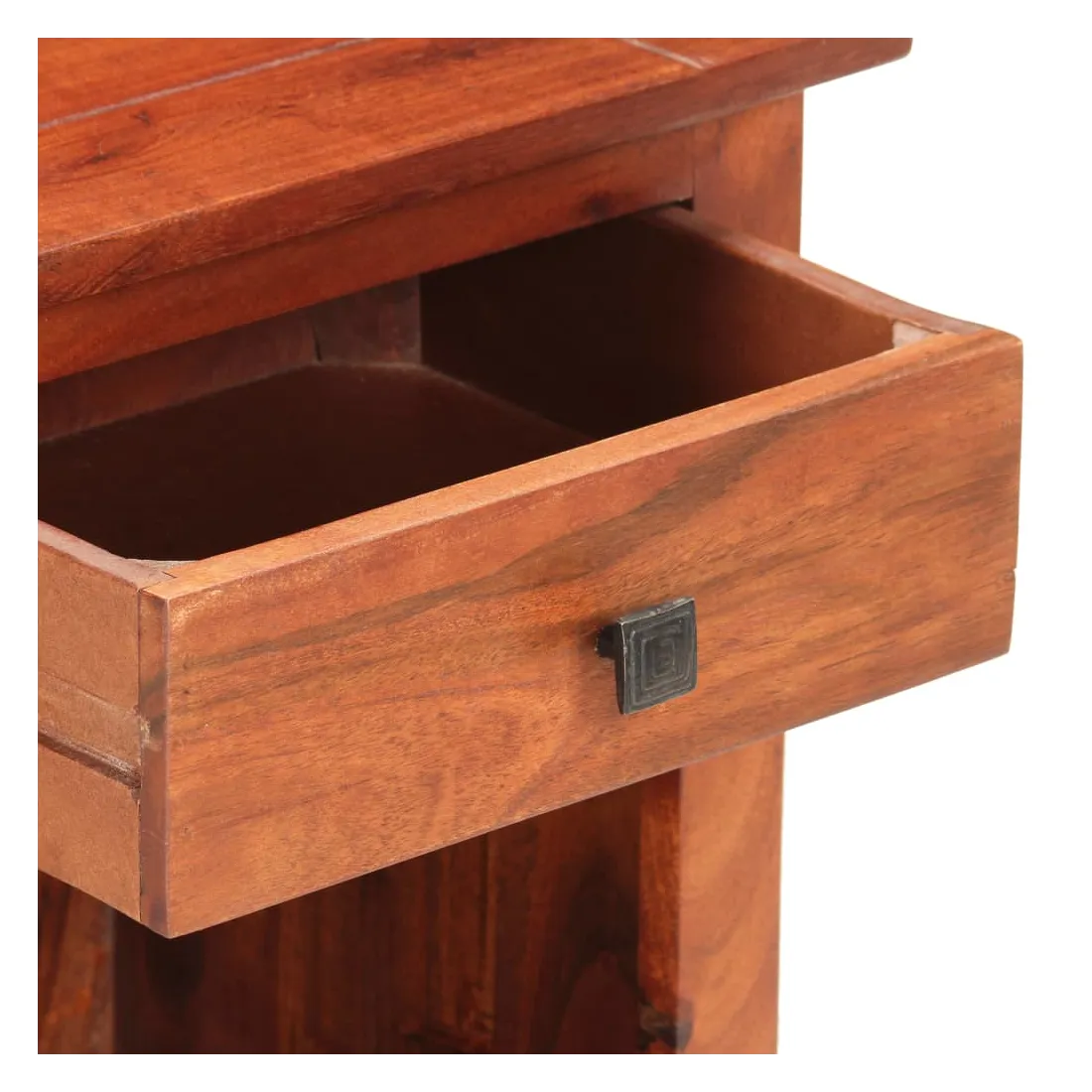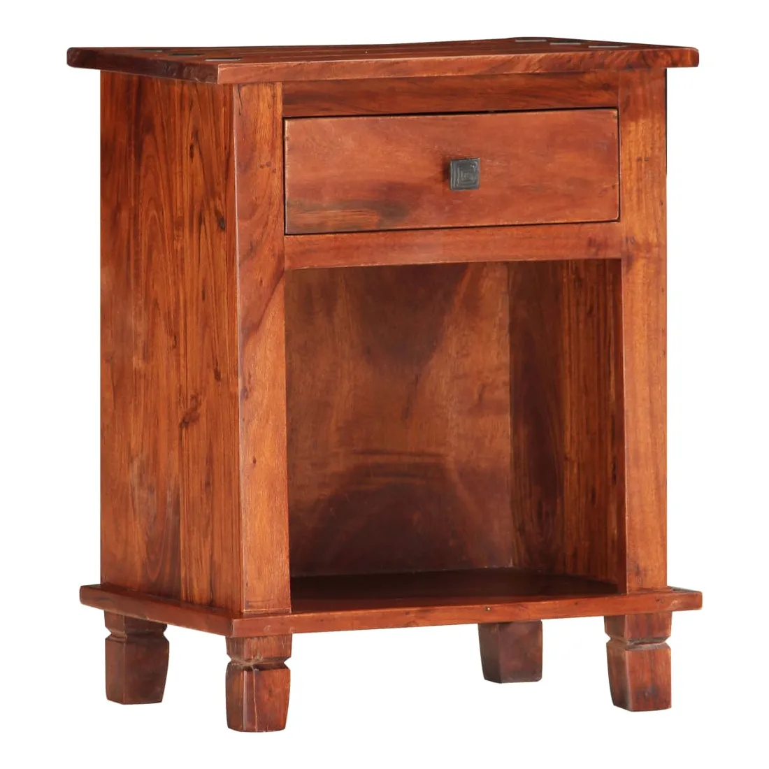 Introduisez une touche de charme rustique dans votre décoration intérieure avec notre table de chevet en bois d'acacia solide ! La table de chevet est en bois d'acacia massif qui a été appliqué sur une finition de noyer pour lui donner un aspect raffiné. Le dessus robuste est idéal pour ranger un réveil, une lampe de lecture, des livres, etc ou pour exposer des cadres photo ou d'autres objets décoratifs. Un tiroir et un compartiment offrent suffisamment d'espace pour garder toutes sortes de petits objets organisés et à portée de main. Cette armoire latérale en bois est fabriquée à la main avec le plus grand soin, que ce soit par polissage, peinture ou laquage. Remarque importante : les couleurs varient d'une pièce à l'autre, rendant chacune de nos tables de chevet unique. La livraison est aléatoire, ce qui garantit l'exclusivité et l'individualité de votre produit.