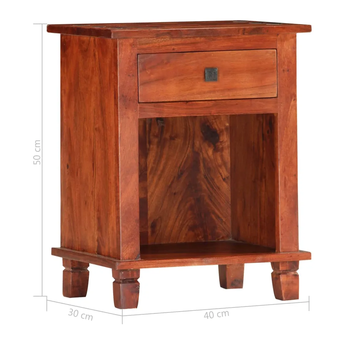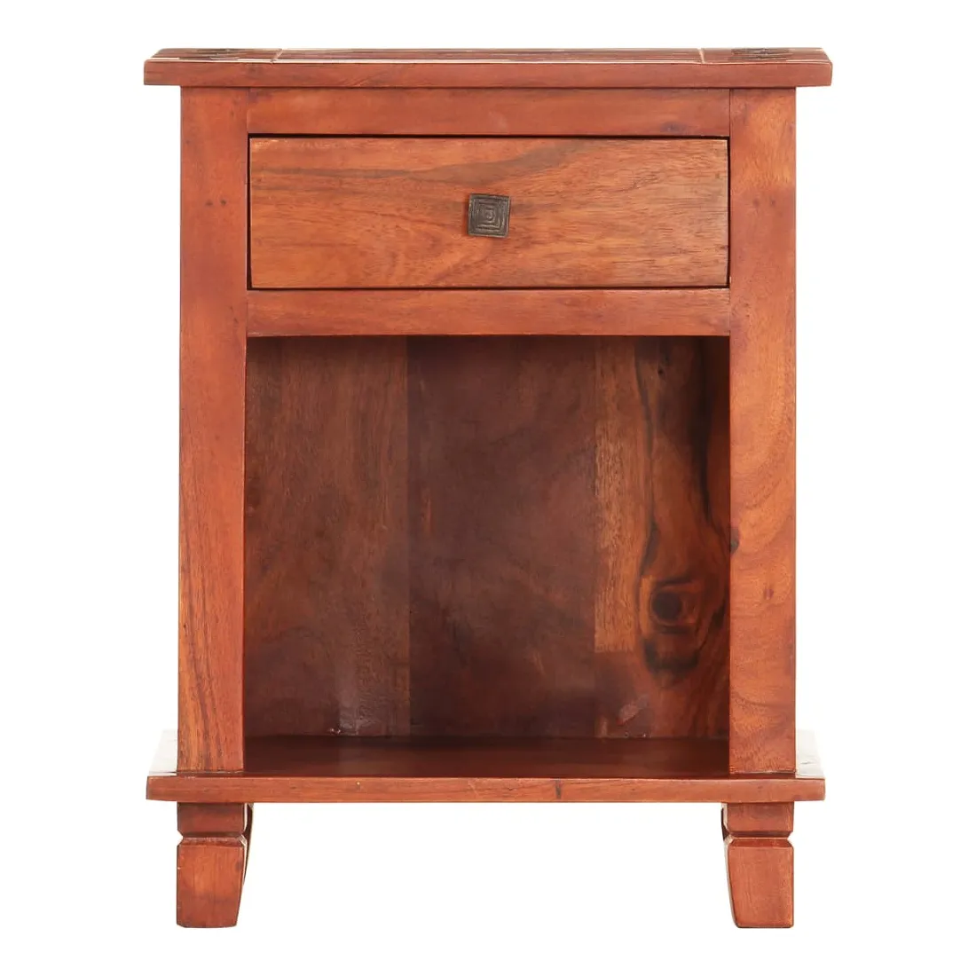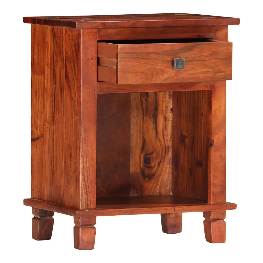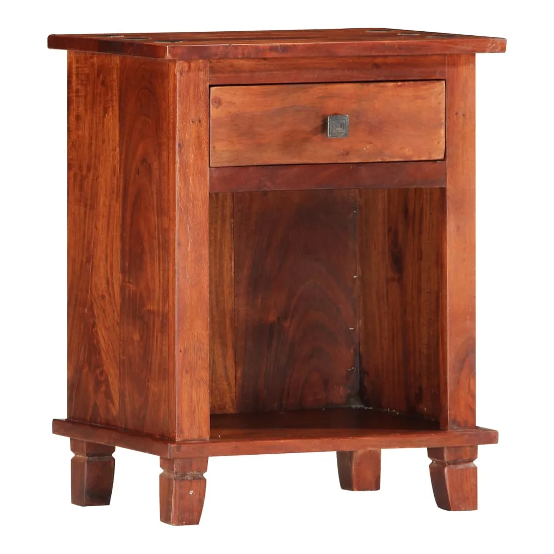 Introduisez une touche de charme rustique dans votre décoration intérieure avec notre table de chevet en bois d'acacia solide ! La table de chevet est en bois d'acacia massif qui a été appliqué sur une finition de noyer pour lui donner un aspect raffiné. Le dessus robuste est idéal pour ranger un réveil, une lampe de lecture, des livres, etc ou pour exposer des cadres photo ou d'autres objets décoratifs. Un tiroir et un compartiment offrent suffisamment d'espace pour garder toutes sortes de petits objets organisés et à portée de main. Cette armoire latérale en bois est fabriquée à la main avec le plus grand soin, que ce soit par polissage, peinture ou laquage. Remarque importante : les couleurs varient d'une pièce à l'autre, rendant chacune de nos tables de chevet unique. La livraison est aléatoire, ce qui garantit l'exclusivité et l'individualité de votre produit.