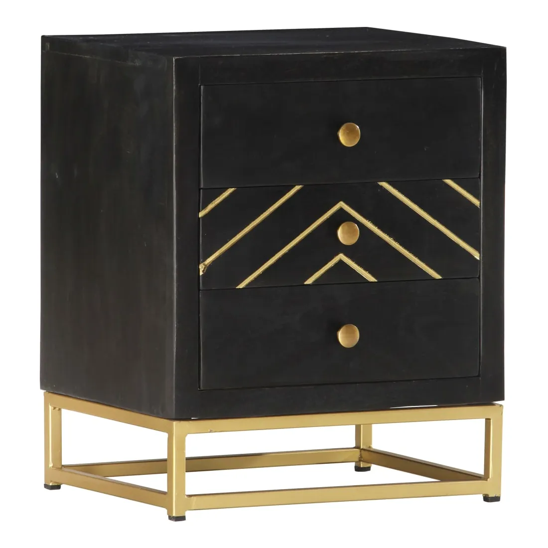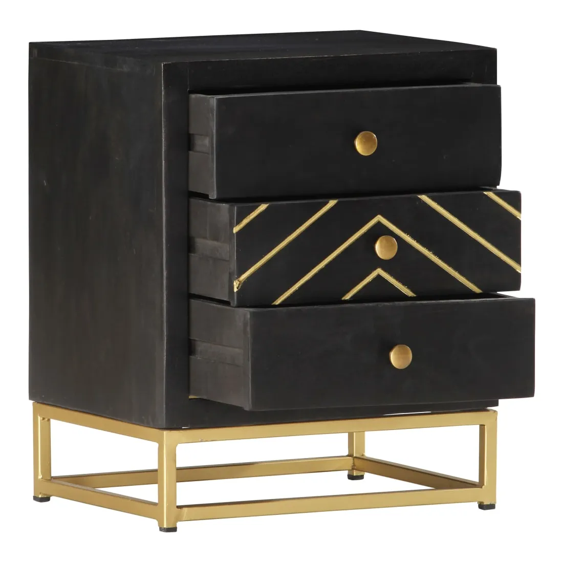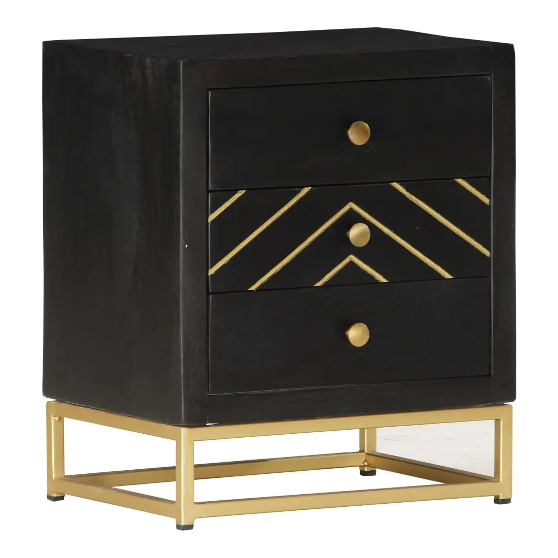 Notre table de chevet en bois a une finition noire et dorée et sera un supplément décoratif à votre chambre à coucher. La table de chevet est fabriquée à la main en bois de manguier, un bois solide, stable, durable et beau, et le savoir-faire artisanal ajoute à son spectaculaire style rétro. Chaque étape du processus est réalisée avec le plus grand soin, qu'il s'agisse de polissage, de peinture ou de laquage. Le savoir-faire artisanal et les magnifiques veines du bois font que chaque meuble est unique et légèrement différent l'un de l'autre. En outre, il est doté d'un dessus robuste et de trois tiroirs qui offrent suffisamment d'espace pour que vous puissiez garder divers objets tels que livres, lunettes, télécommandes, etc. Bien organisés et à portée de main. Cet article est facile à assembler. Remarque importante : les couleurs peuvent varier d'une pièce à l'autre, ce qui rend chaque pièce unique et légèrement différente l'une de l'autre ; La livraison est aléatoire, ce qui garantit l'exclusivité et l'individualité de votre produit.
