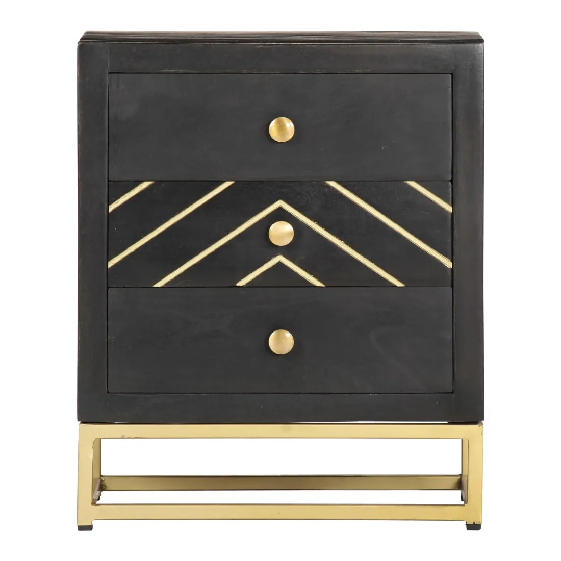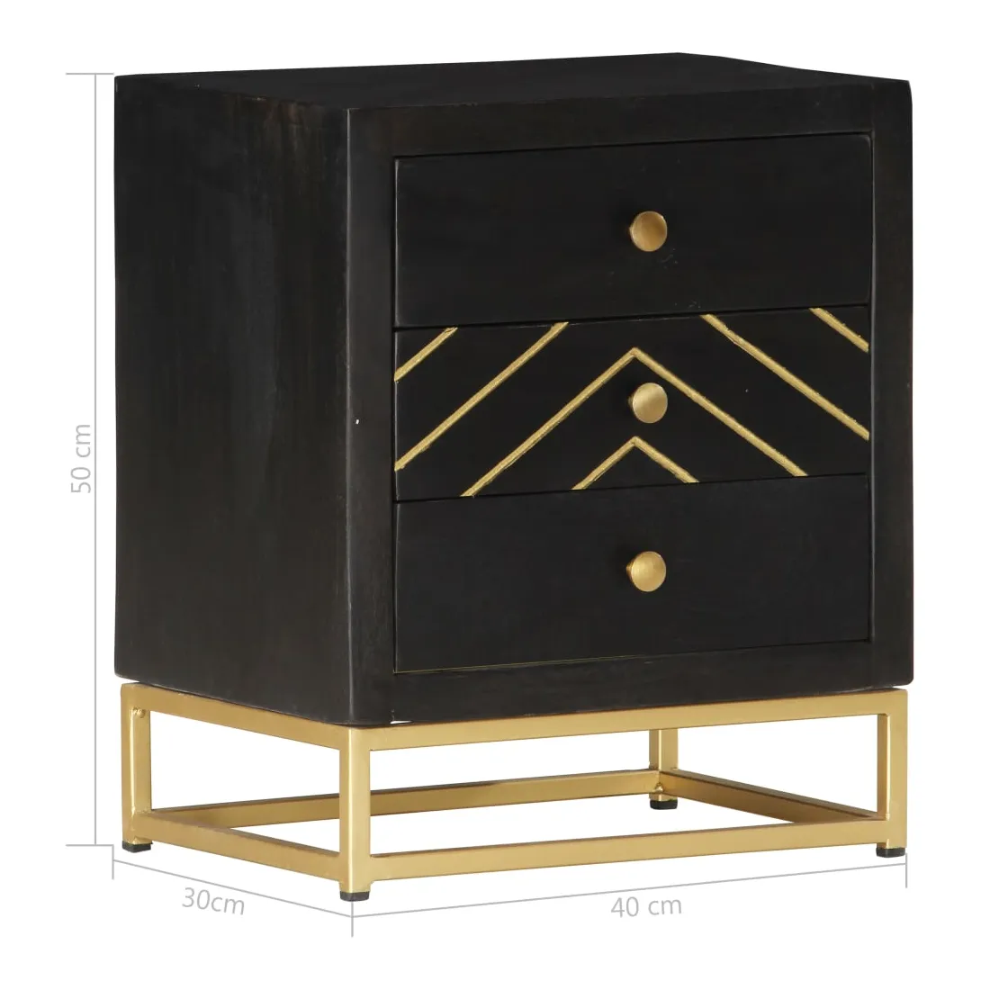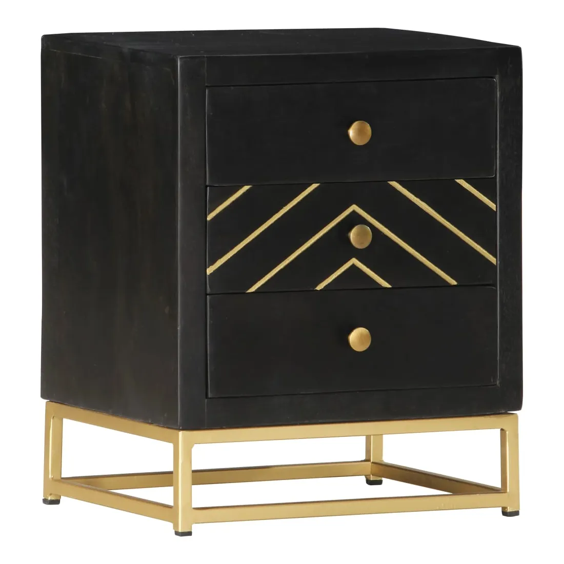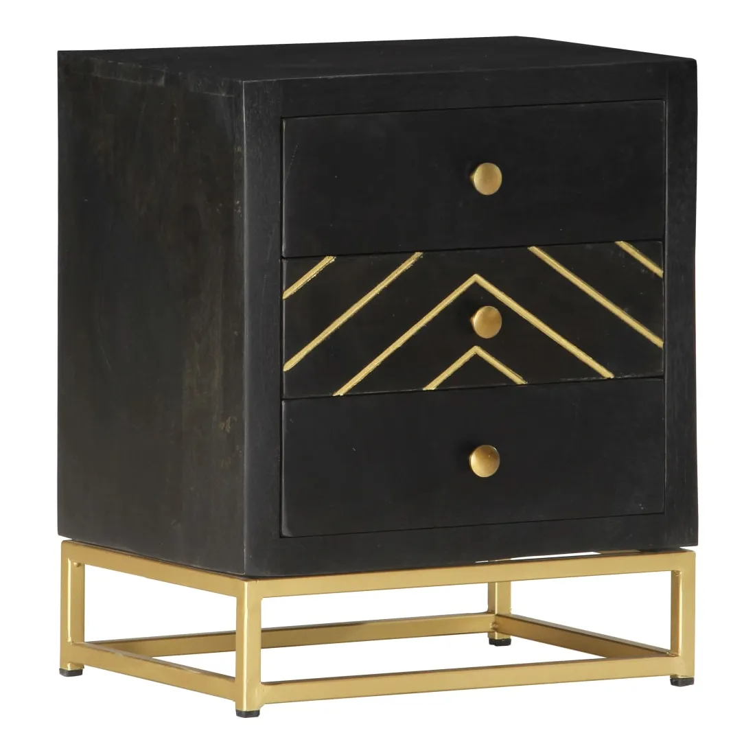 Notre table de chevet en bois a une finition noire et dorée et sera un supplément décoratif à votre chambre à coucher. La table de chevet est fabriquée à la main en bois de manguier, un bois solide, stable, durable et beau, et le savoir-faire artisanal ajoute à son spectaculaire style rétro. Chaque étape du processus est réalisée avec le plus grand soin, qu'il s'agisse de polissage, de peinture ou de laquage. Le savoir-faire artisanal et les magnifiques veines du bois font que chaque meuble est unique et légèrement différent l'un de l'autre. En outre, il est doté d'un dessus robuste et de trois tiroirs qui offrent suffisamment d'espace pour que vous puissiez garder divers objets tels que livres, lunettes, télécommandes, etc. Bien organisés et à portée de main. Cet article est facile à assembler. Remarque importante : les couleurs peuvent varier d'une pièce à l'autre, ce qui rend chaque pièce unique et légèrement différente l'une de l'autre ; La livraison est aléatoire, ce qui garantit l'exclusivité et l'individualité de votre produit.