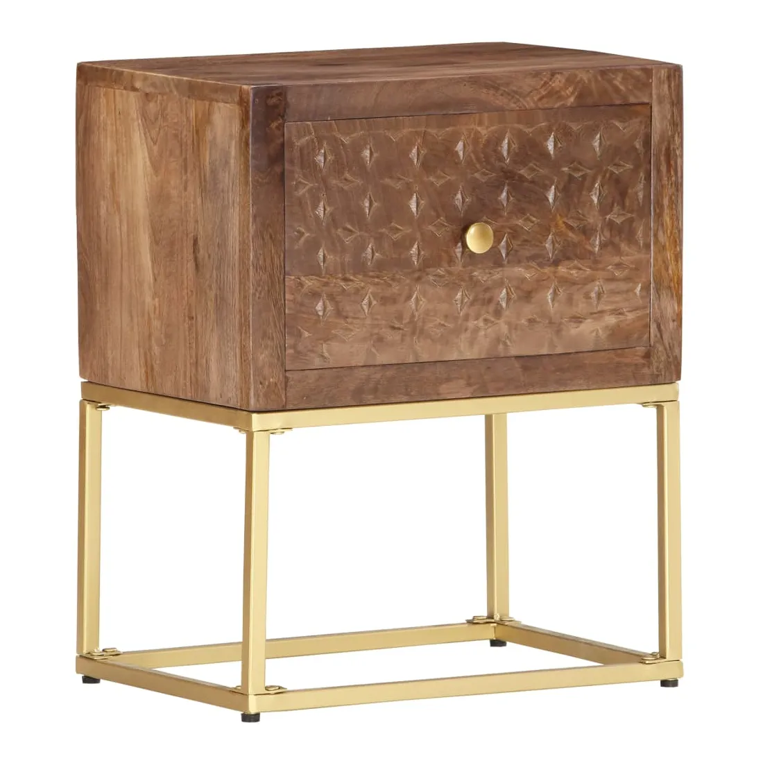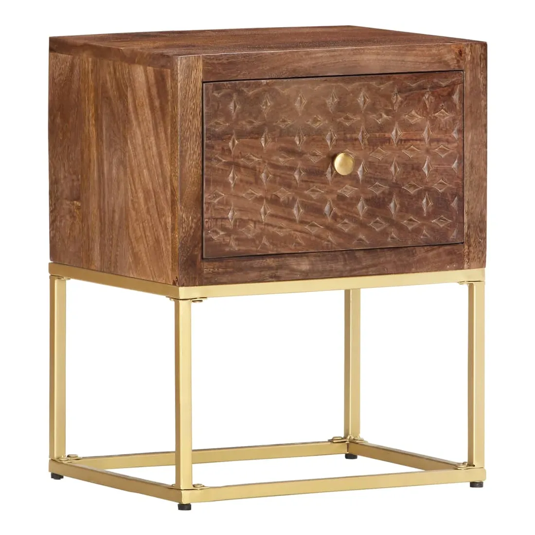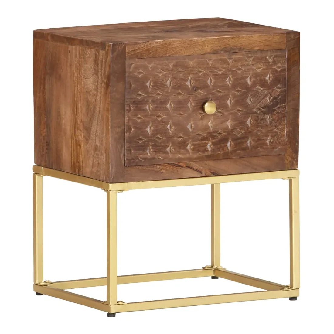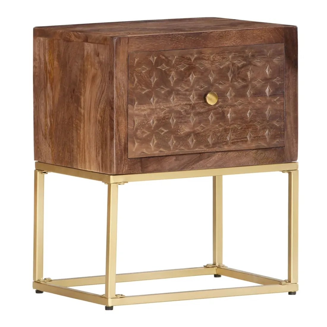 Cette table de chevet de style vintage et pratique sera un supplément intemporel à votre décoration intérieure. La table de chevet, avec des parties sculptées à la main à l'avant, est faite à la main en bois de manguier massif qui est un bois dur dense et robuste avec des belles stries et des contours bruns ou dorés sur sa surface. Chaque étape du processus est réalisée avec le plus grand soin, qu'il s'agisse de polissage ou de laquage, et le savoir-faire ajoute au style rétro spectaculaire. Les beaux grains de bois rendent chaque meuble unique et légèrement différent l'un de l'autre. Le cadre en acier enduit de poudre ajoute au style industriel de l'armoire en bois. En outre, cette armoire comprend 1 tiroir, offrant suffisamment d'espace pour garder toutes sortes de petits objets organisés et à portée de main. L'article est facile à assembler. Remarque importante : les couleurs varient d'une pièce à l'autre, rendant chaque pièce unique. La livraison est aléatoire, garantissant l'exclusivité et l'individualité de votre produit.