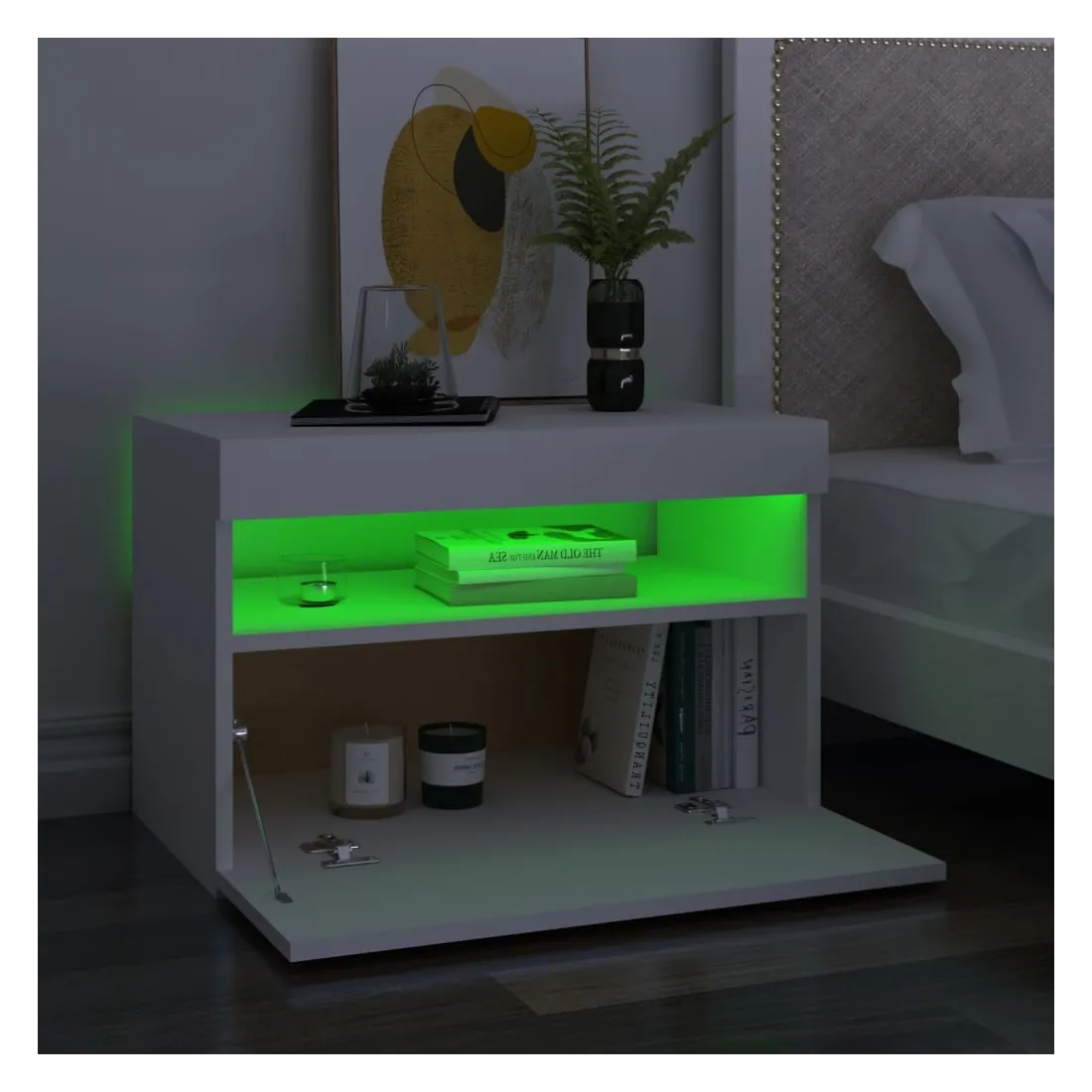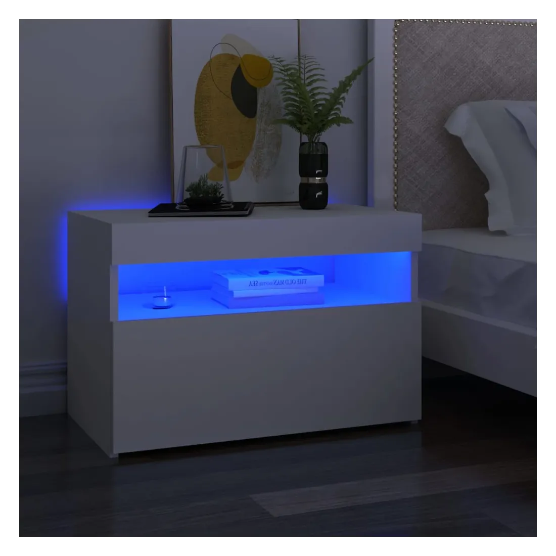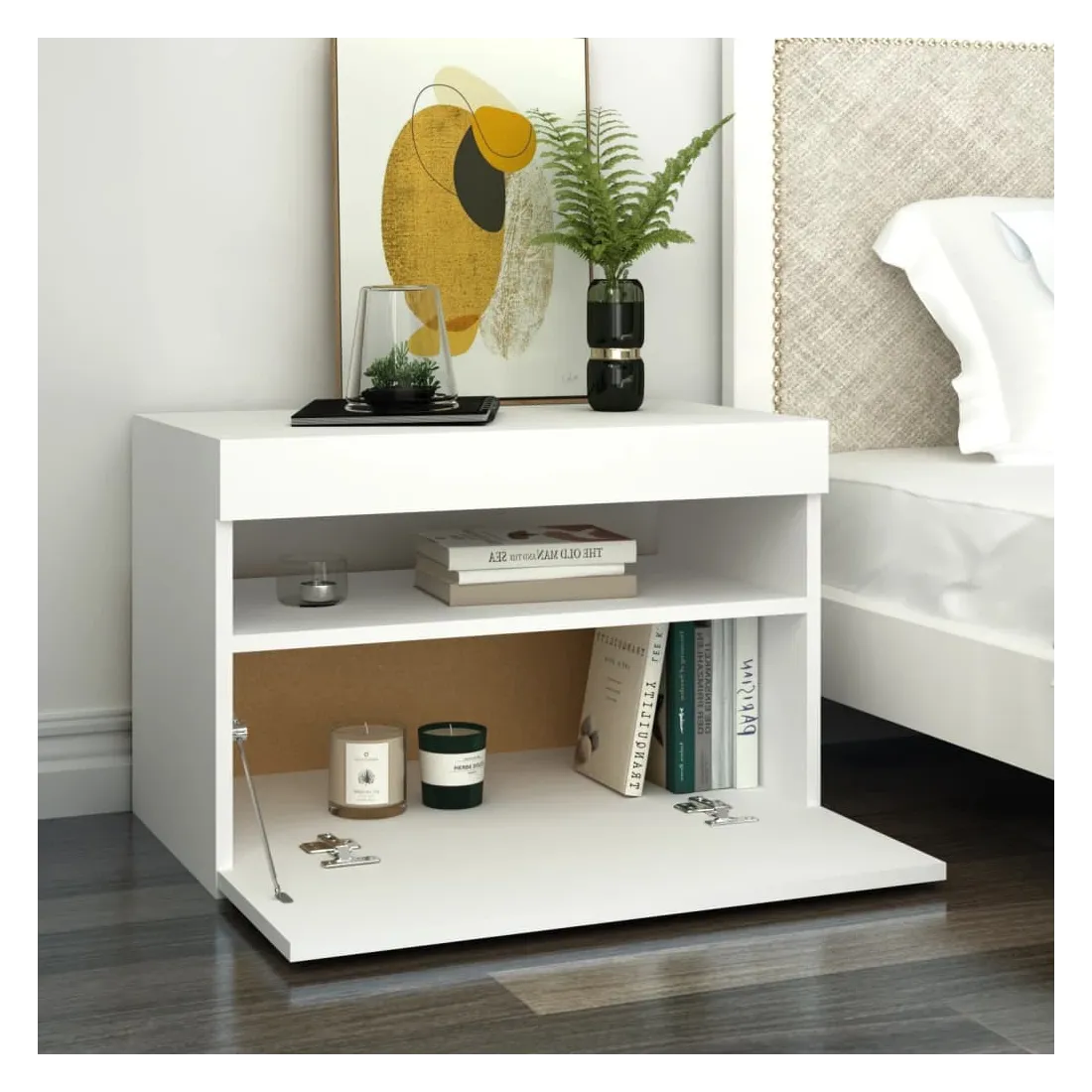 Avec un design à la fois tendance et pratique, cette table de chevet avec éclairage LED devient certainement un point central de votre pièce. La construction robuste de l'armoire latérale la rend très durable. Il vous reste suffisamment d'espace pour garder vos magazines, livres, télécommandes et autres petits articles bien organisés et à portée de main. Cette table de chevet est dotée de lumières LED RVB qui ont différents menus pour changer la couleur des lumières et laisser la couleur s'ajuster automatiquement différemment. Les lumières LED soulignent le look moderne et contribuent au sentiment tendance. De plus, cette table de chevet est facile à nettoyer avec un chiffon humide. Remarque : ce produit est doté d'un connecteur USB, mais la source d'alimentation certifiée de USB 5V n'est pas incluse.