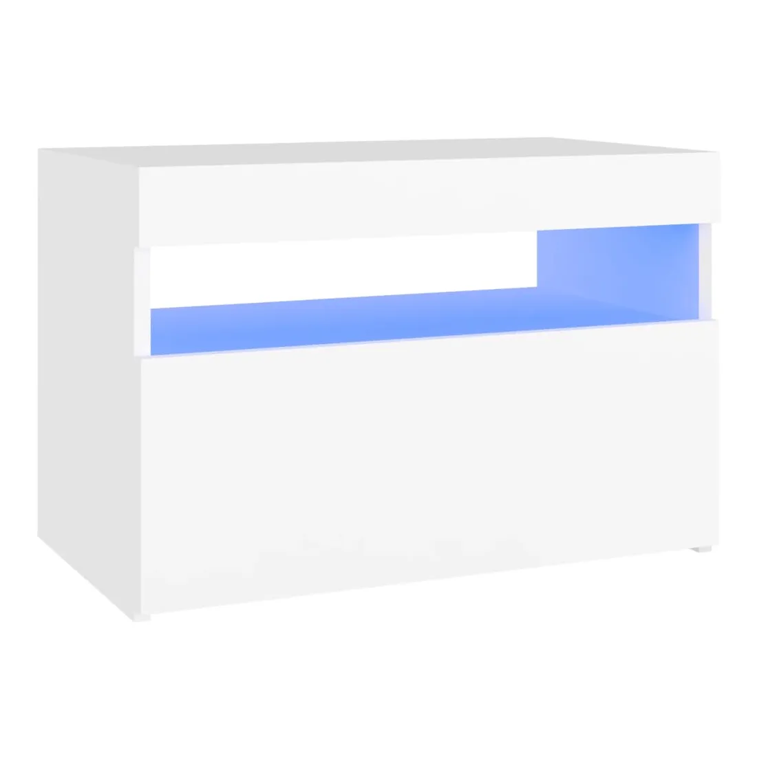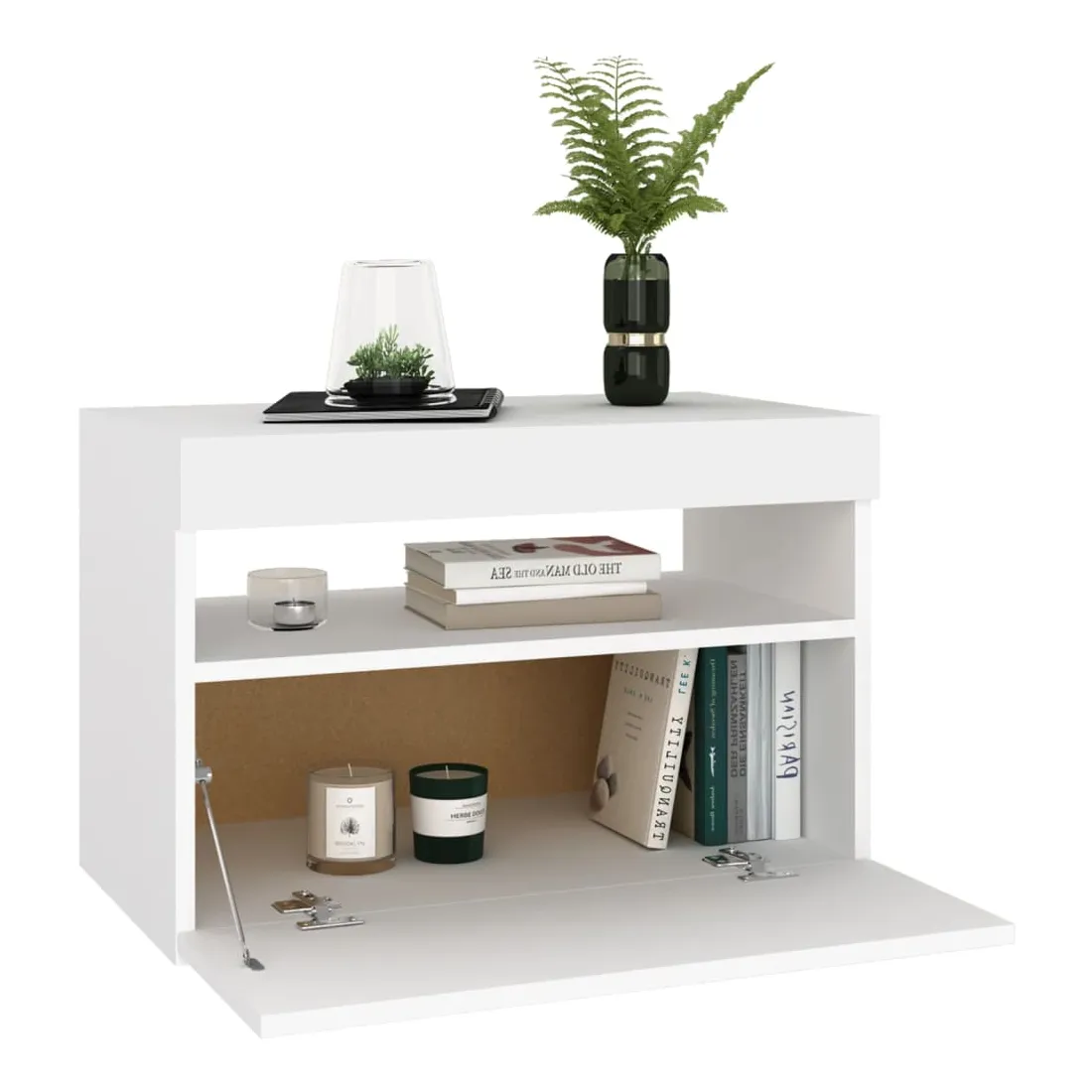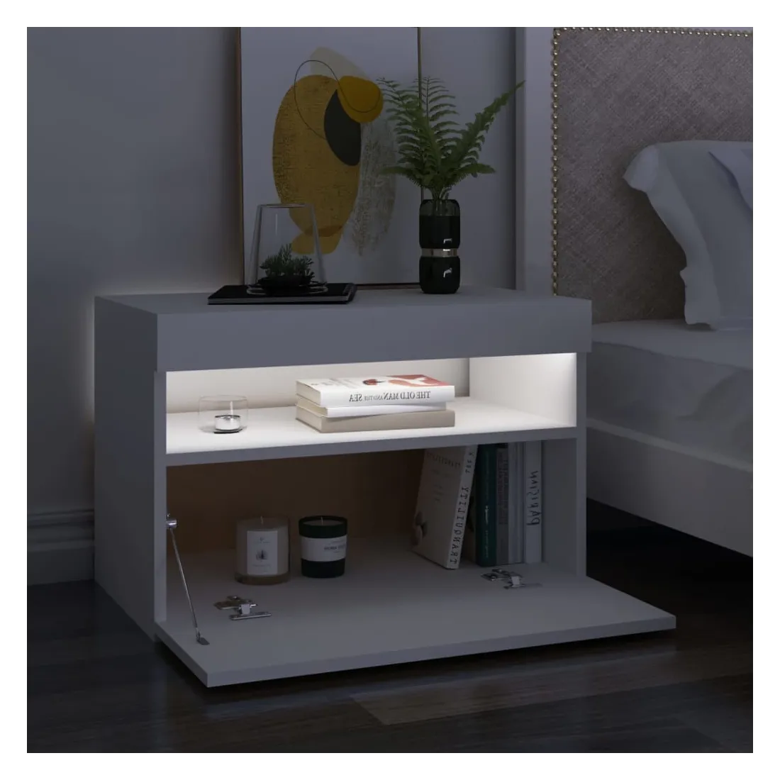 Avec un design à la fois tendance et pratique, cette table de chevet avec éclairage LED devient certainement un point central de votre pièce. La construction robuste de l'armoire latérale la rend très durable. Il vous reste suffisamment d'espace pour garder vos magazines, livres, télécommandes et autres petits articles bien organisés et à portée de main. Cette table de chevet est dotée de lumières LED RVB qui ont différents menus pour changer la couleur des lumières et laisser la couleur s'ajuster automatiquement différemment. Les lumières LED soulignent le look moderne et contribuent au sentiment tendance. De plus, cette table de chevet est facile à nettoyer avec un chiffon humide. Remarque : ce produit est doté d'un connecteur USB, mais la source d'alimentation certifiée de USB 5V n'est pas incluse.