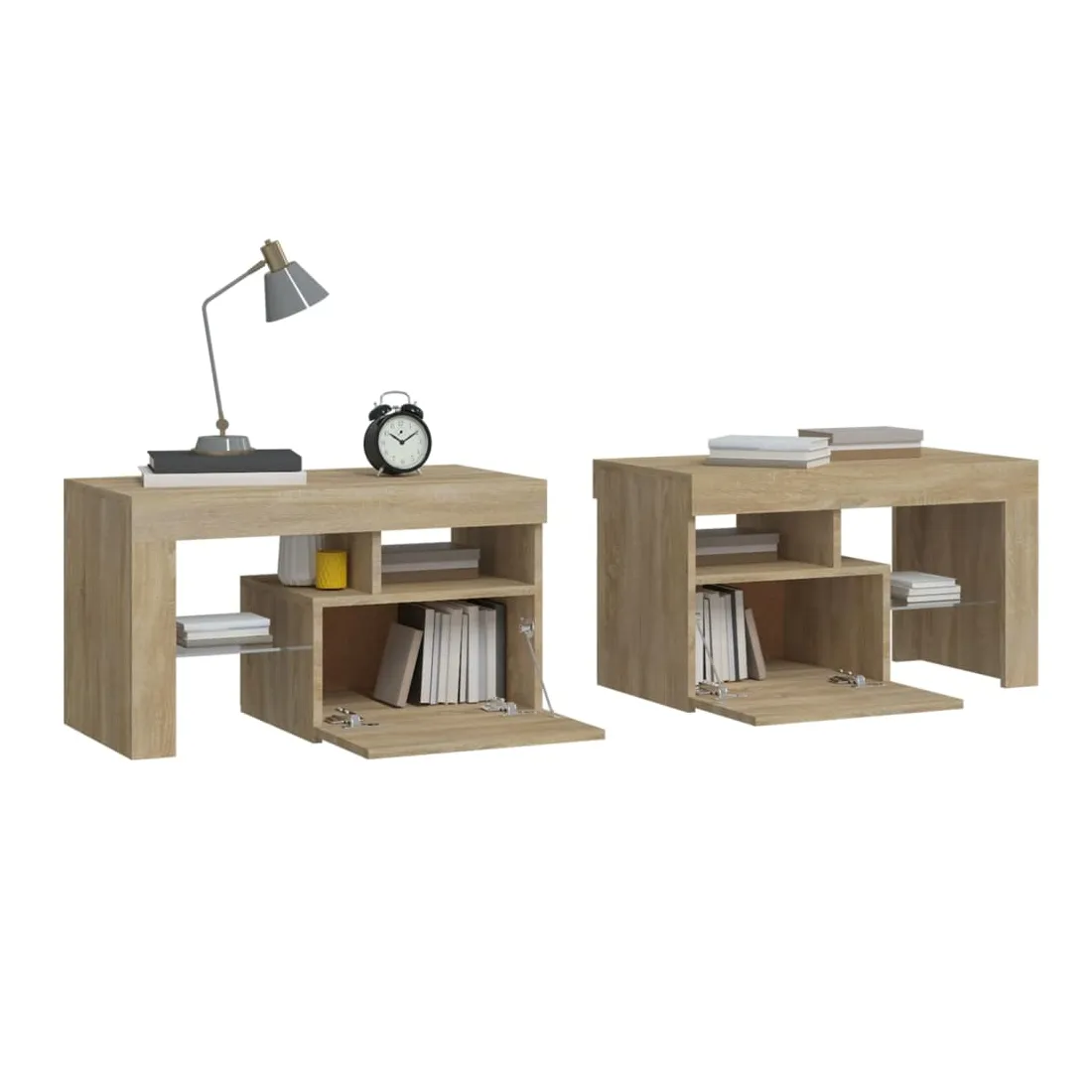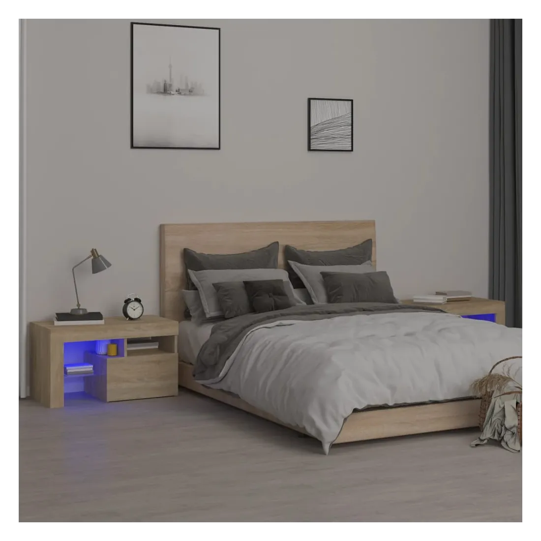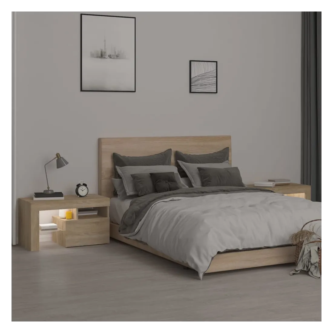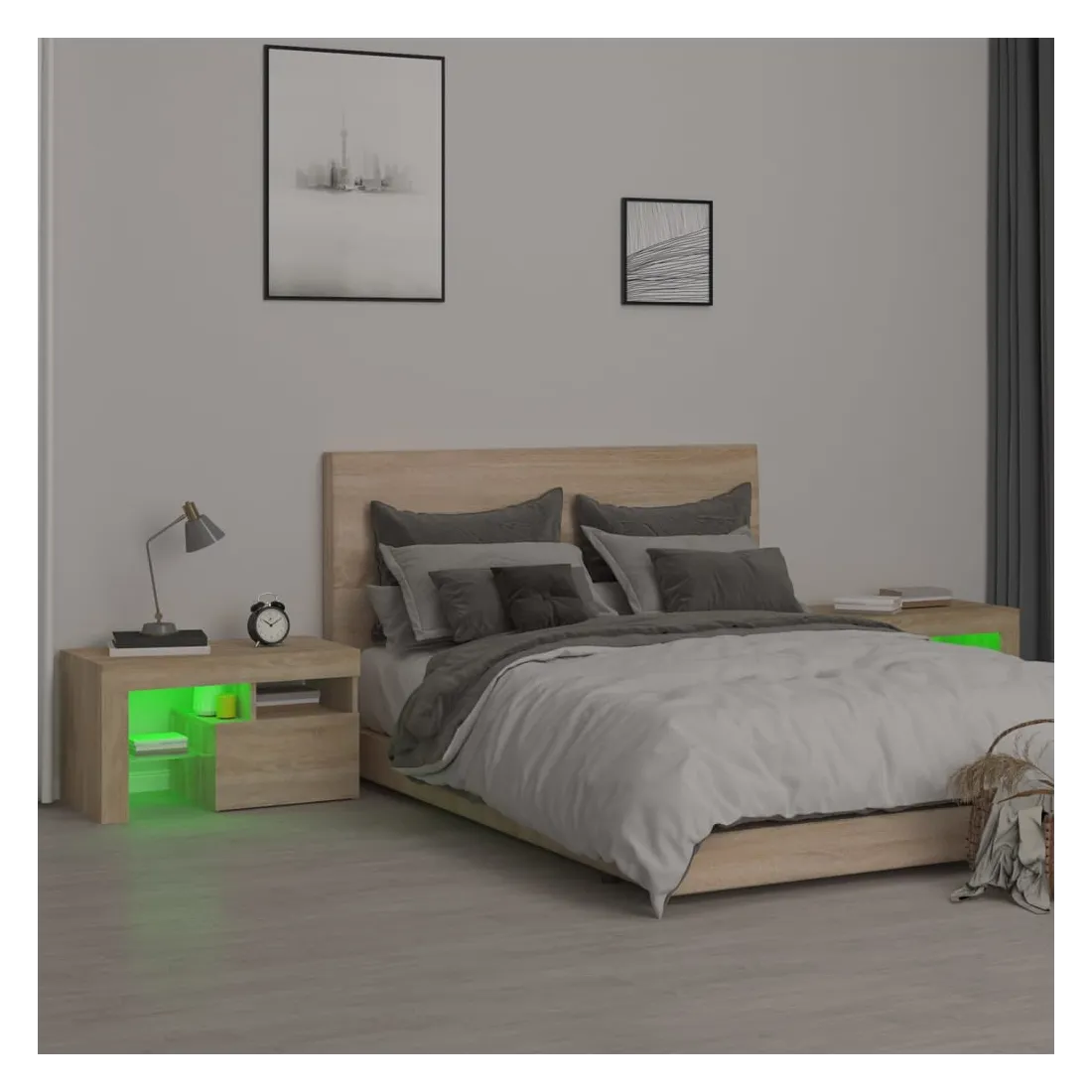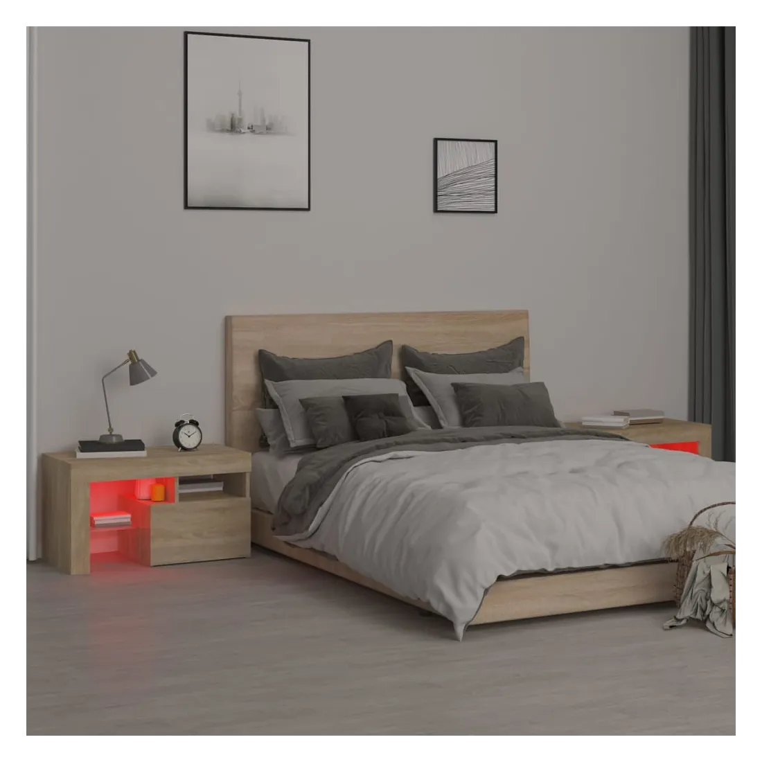 Ancrez votre espace de vie dans un charme contemporain avec ces tables de chevet élégantes ! Avec un design à la fois tendance et pratique, ces tables de chevet avec éclairage LED deviendront certainement le point de mire de votre pièce. Matériau durable : le bois d'ingénierie est d'une qualité exceptionnelle avec une surface lisse et présente également résistance, stabilité et résistance à l'humidité. Lumières LED RVB : l'armoire est équipée de lumières LED RVB, qui disposent de différents menus pour changer la couleur des lumières et laisser la couleur s'ajuster automatiquement de manière différente. Les lumières LED soulignent l'aspect moderne et contribuent à la sensation de tendance.Grand espace de rangement : la table de chevet offre un grand espace de rangement pour garder vos magazines, livres, télécommandes et autres petits objets bien organisés et à portée de main.Fonction d'affichage : le dessus robuste de l'armoire latérale est idéal pour exposer des objets décoratifs, des cadres photo ou des plantes en pot. Remarque :Ce produit est doté d'un connecteur USB, mais la source d'alimentation certifiée de USB 5V n'est pas incluse.Chaque produit est livré avec un manuel de montage dans la boîte pour un montage facile.