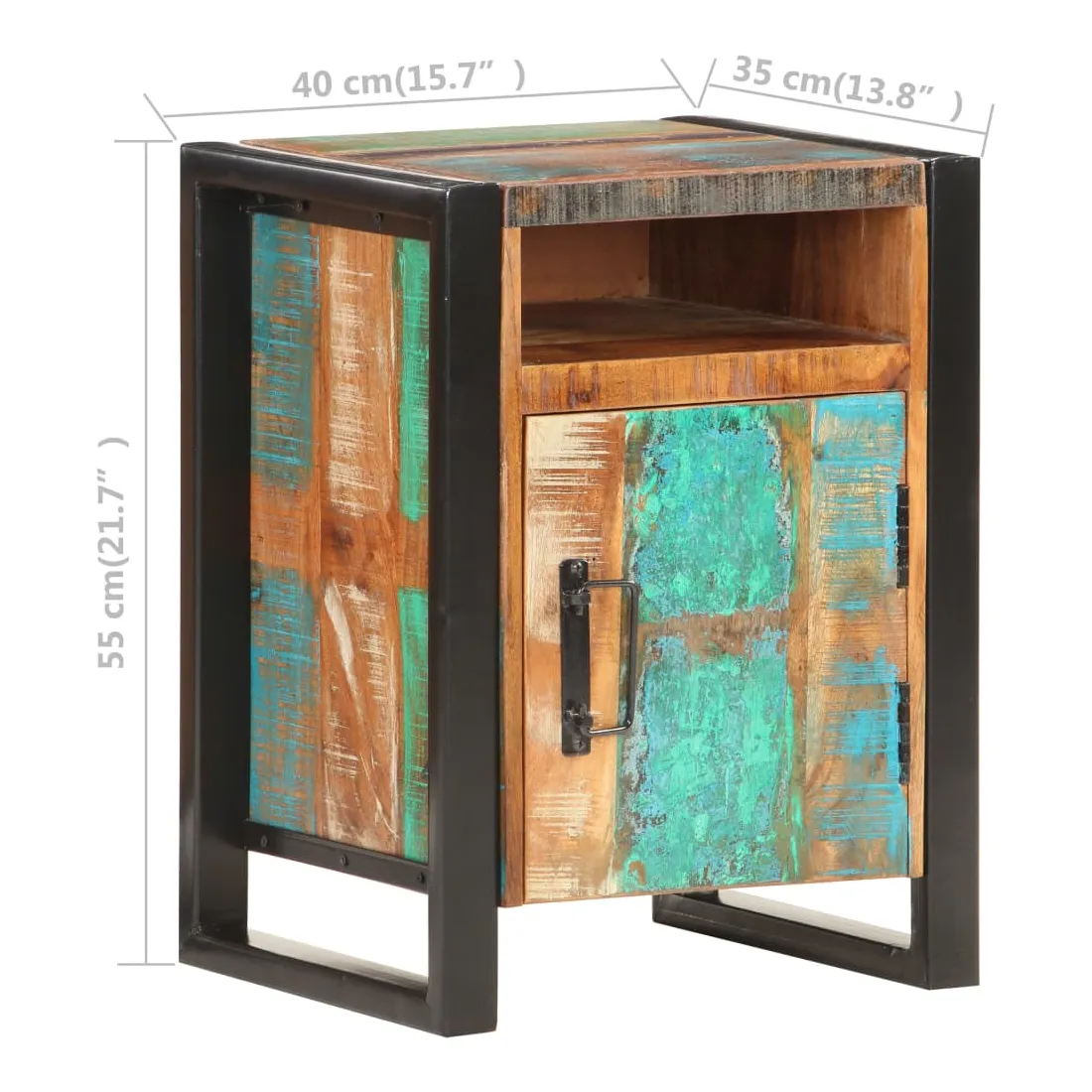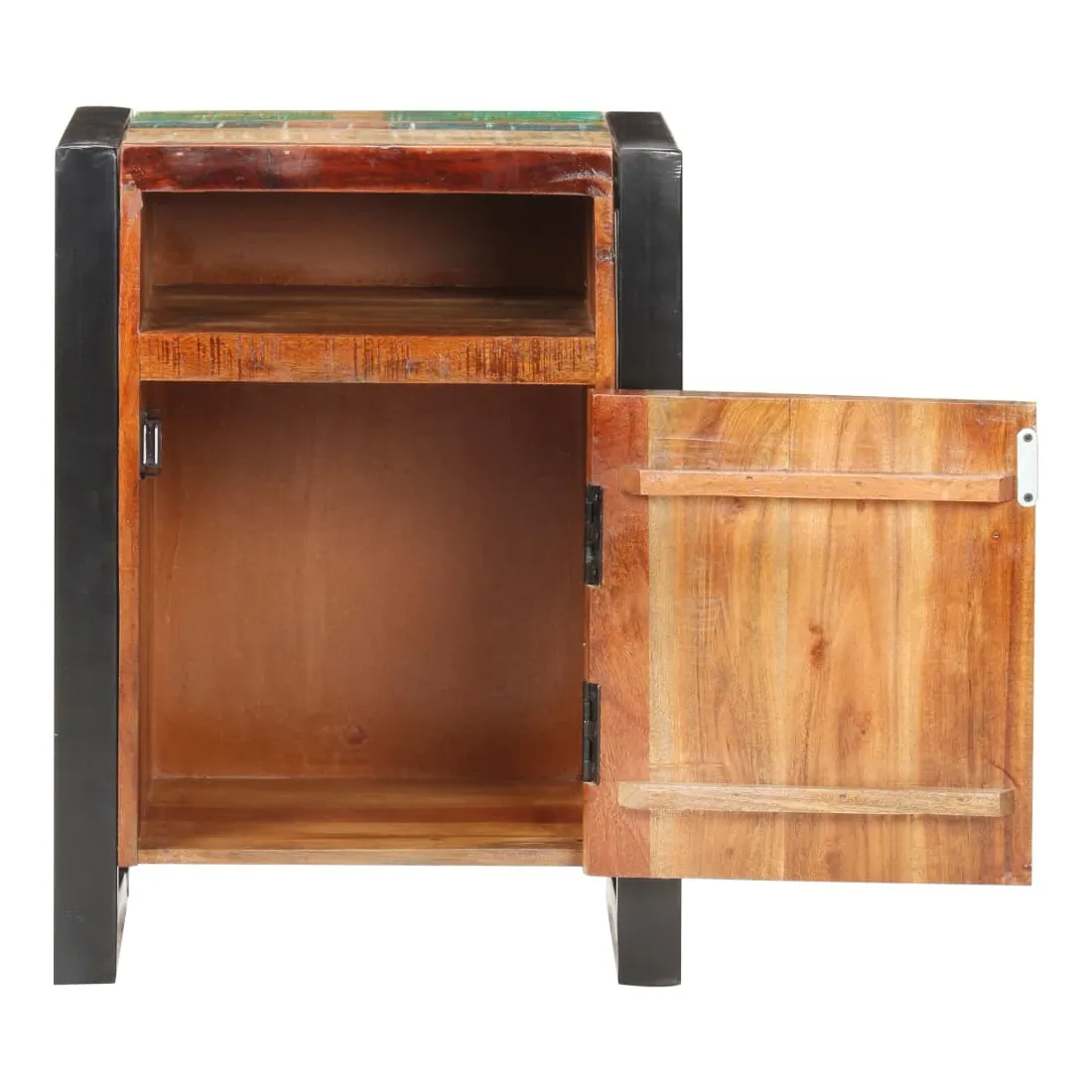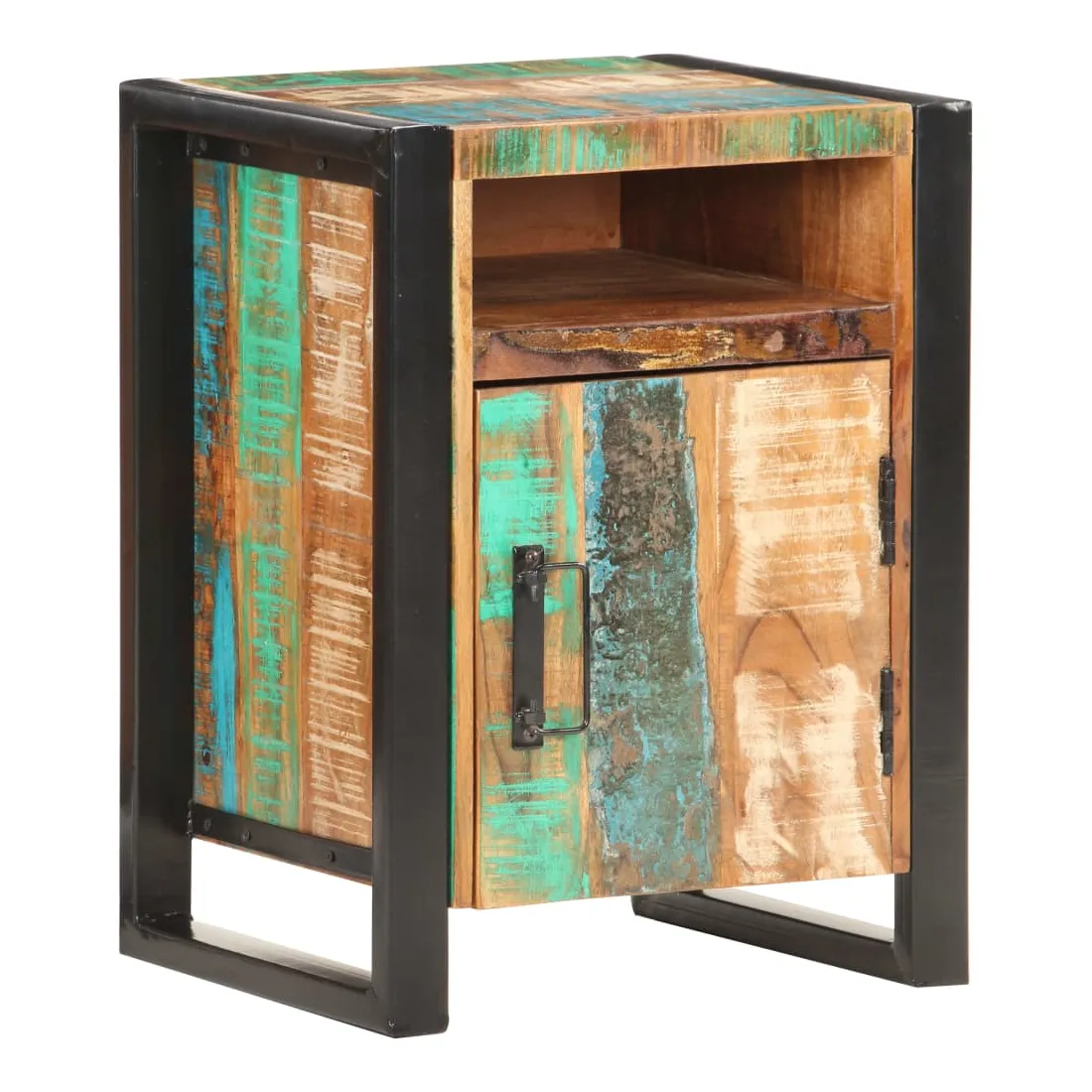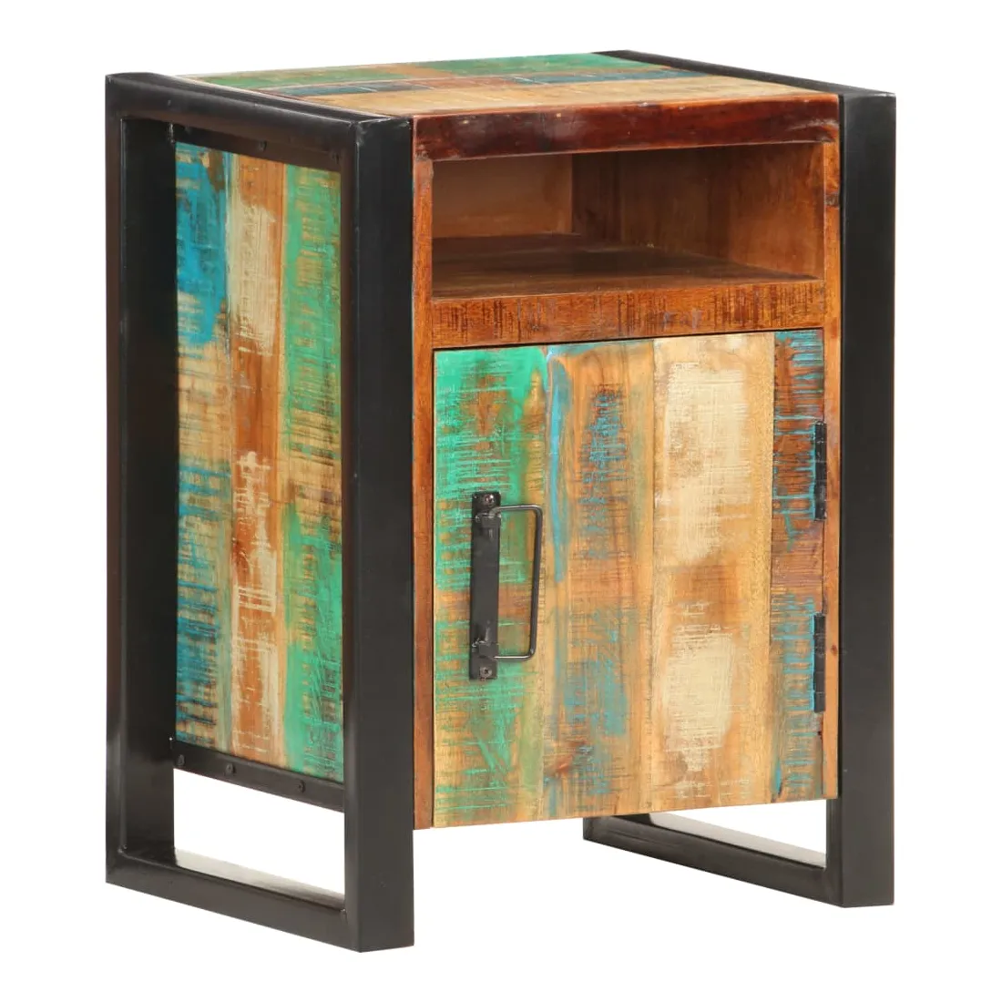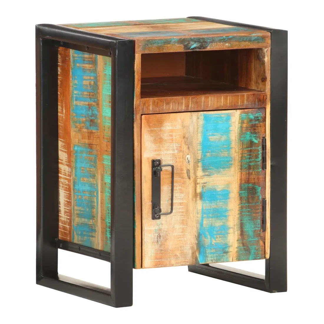 Cette table de chevet de style industriel ajoute une touche de charme rustique à votre intérieur. Elle peut également être utilisée comme table de nuit ou armoire latérale. Cette table de chevet est faite de bois de récupération massif avec une finition naturelle, ce qui signifie que chaque meuble est unique et légèrement différent l'un de l'autre. Les meubles faits de bois de récupération possèdent les caractéristiques de bois différents tels que le bois de teck, de manguier, d'acacia, etc. Le bois de récupération est solide, stable, durable et magnifique. Les signes d'usure et la structure des fibres visibles donnent à chaque meuble une apparence unique et leur propre histoire. Grâce à son cadre en acier solide, cette armoire est solide et stable. La table de chevet dispose d’un dessus en bois dur solide pour placer une lampe de chevet, un réveil ou tout ce dont vous pourriez avoir besoin. Cette armoire de lit dispose de 2 compartiments et d'1 porte, offrant amplement d’espace pour garder toutes sortes de petits articles organisés et à portée de main. Remarque importante : les couleurs varient d'une pièce à l'autre, rendant chaque table unique. La livraison est aléatoire, ce qui garantit l'exclusivité et l'individualité de votre produit.