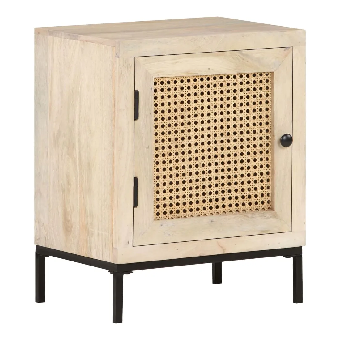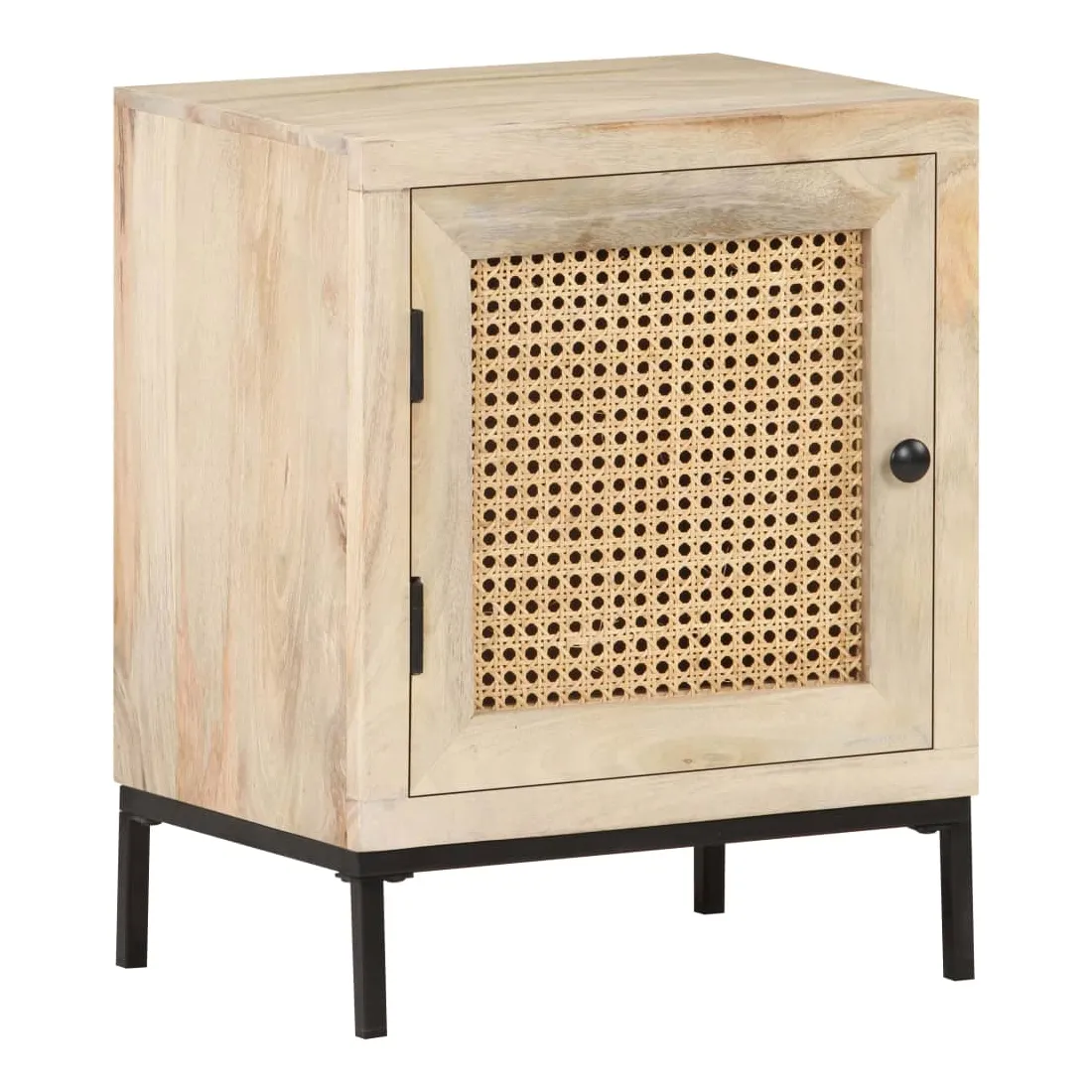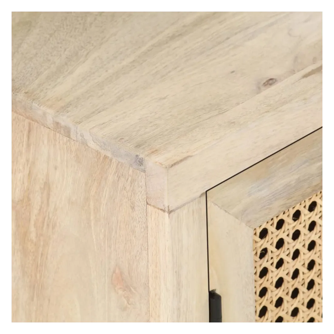 - Matériau : bois de manguier massif avec une finition blanchie, canne naturelle, acier enduit de poudre