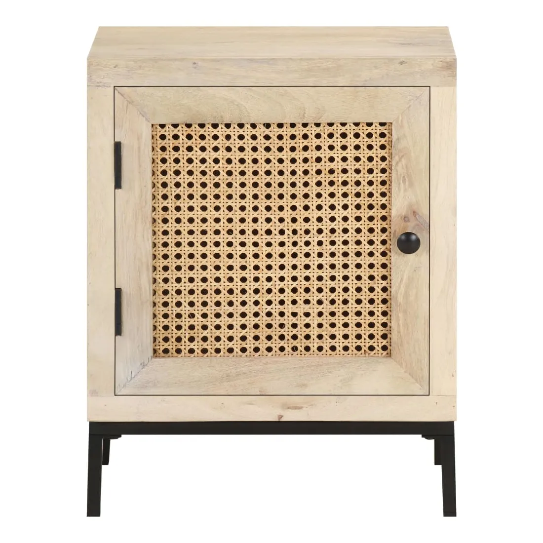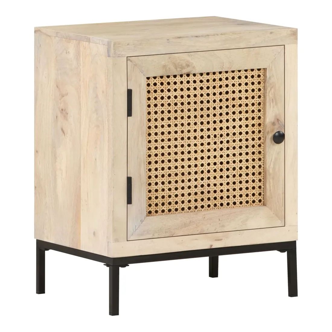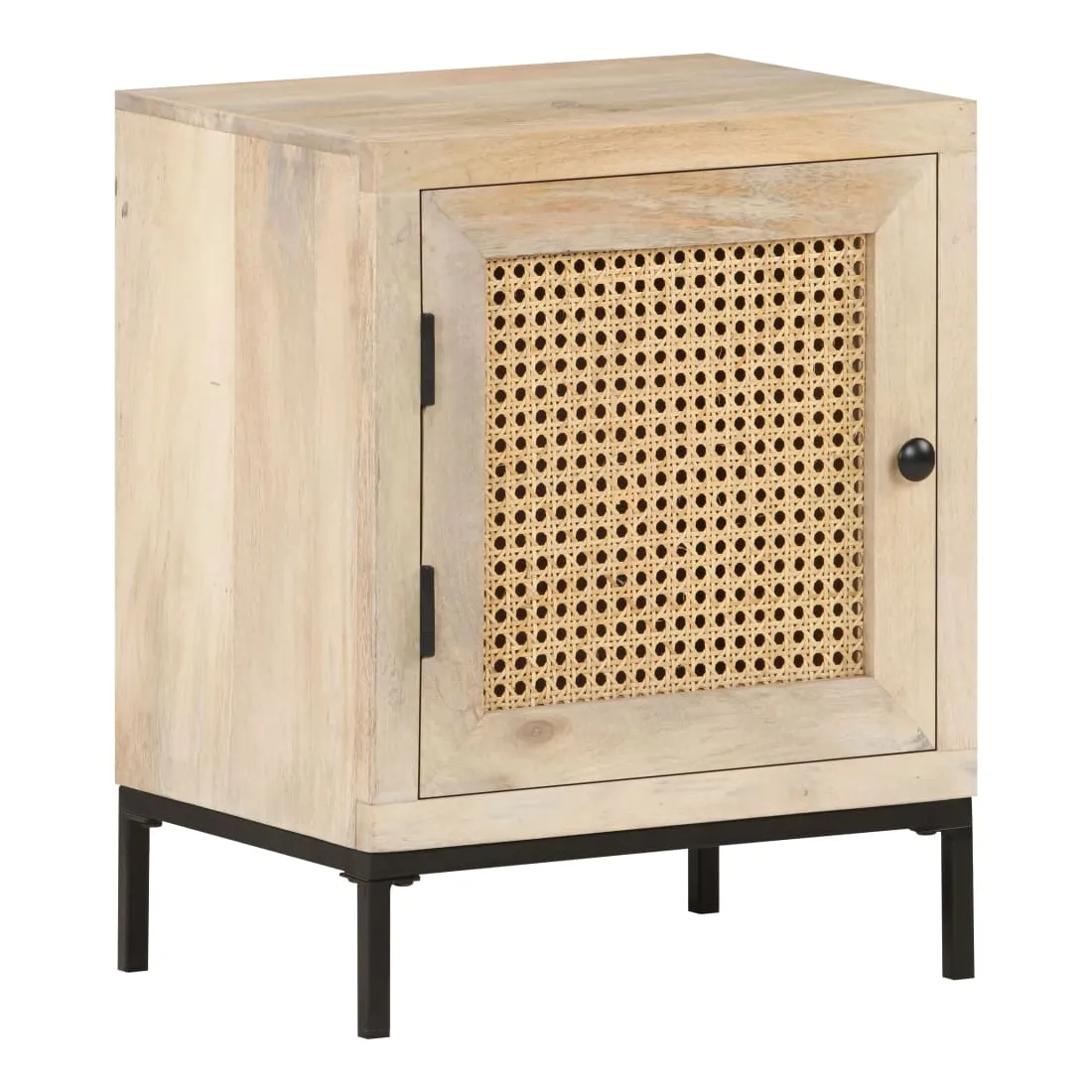 - Matériau : bois de manguier massif avec une finition blanchie, canne naturelle, acier enduit de poudre