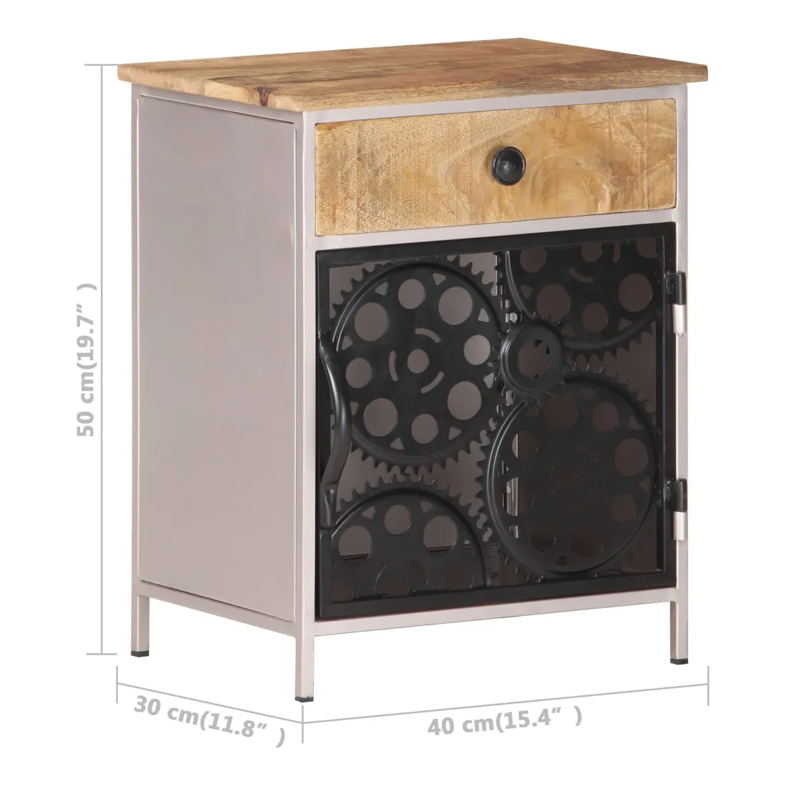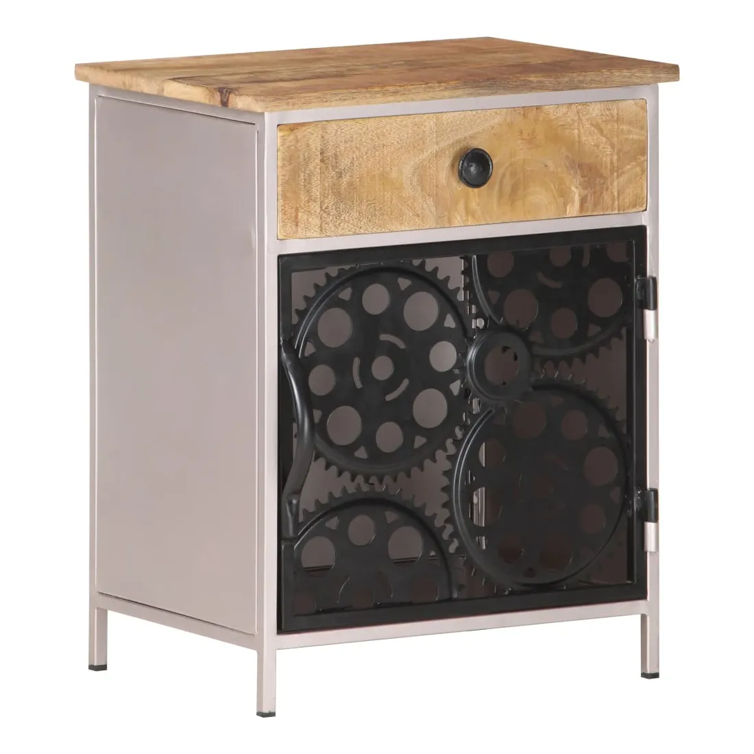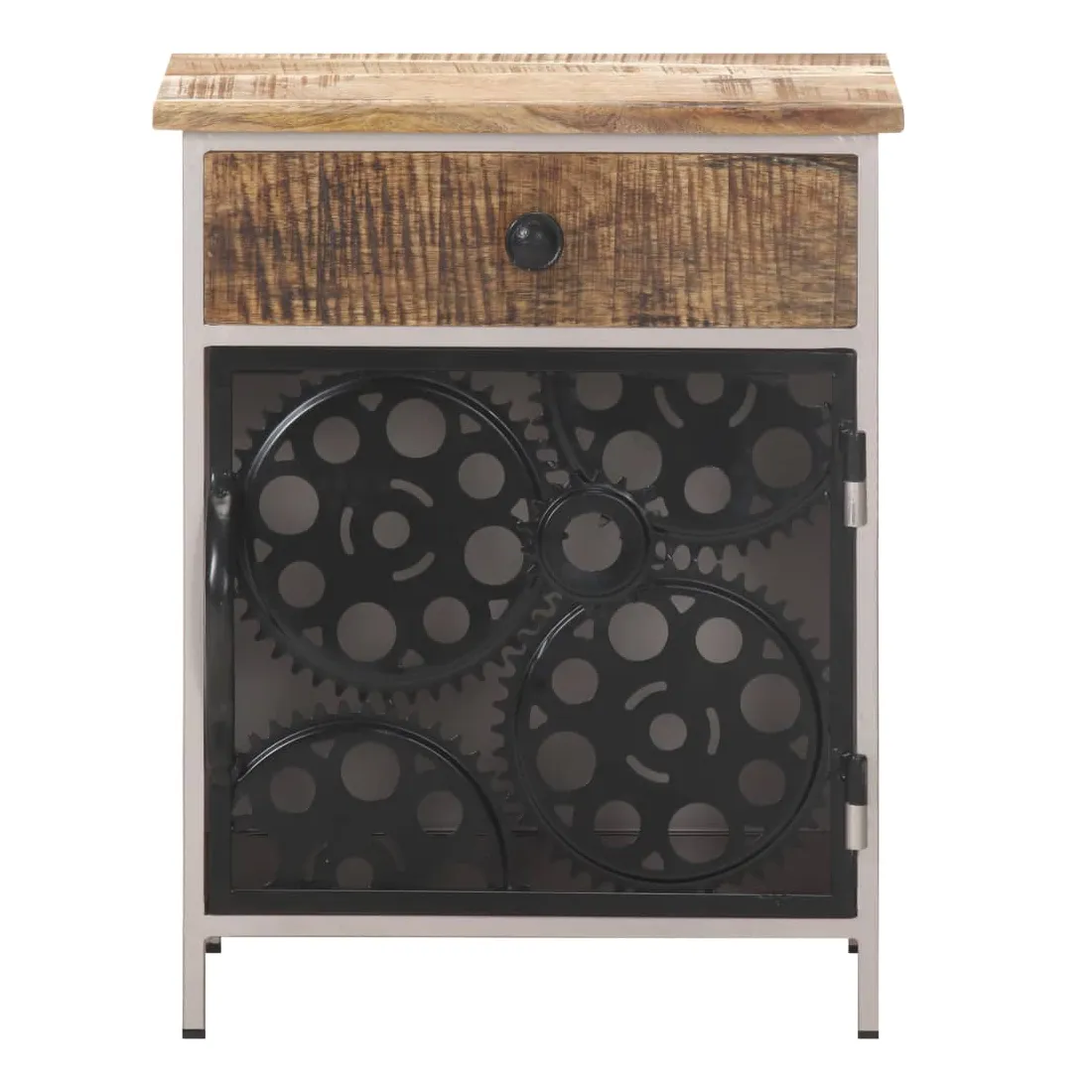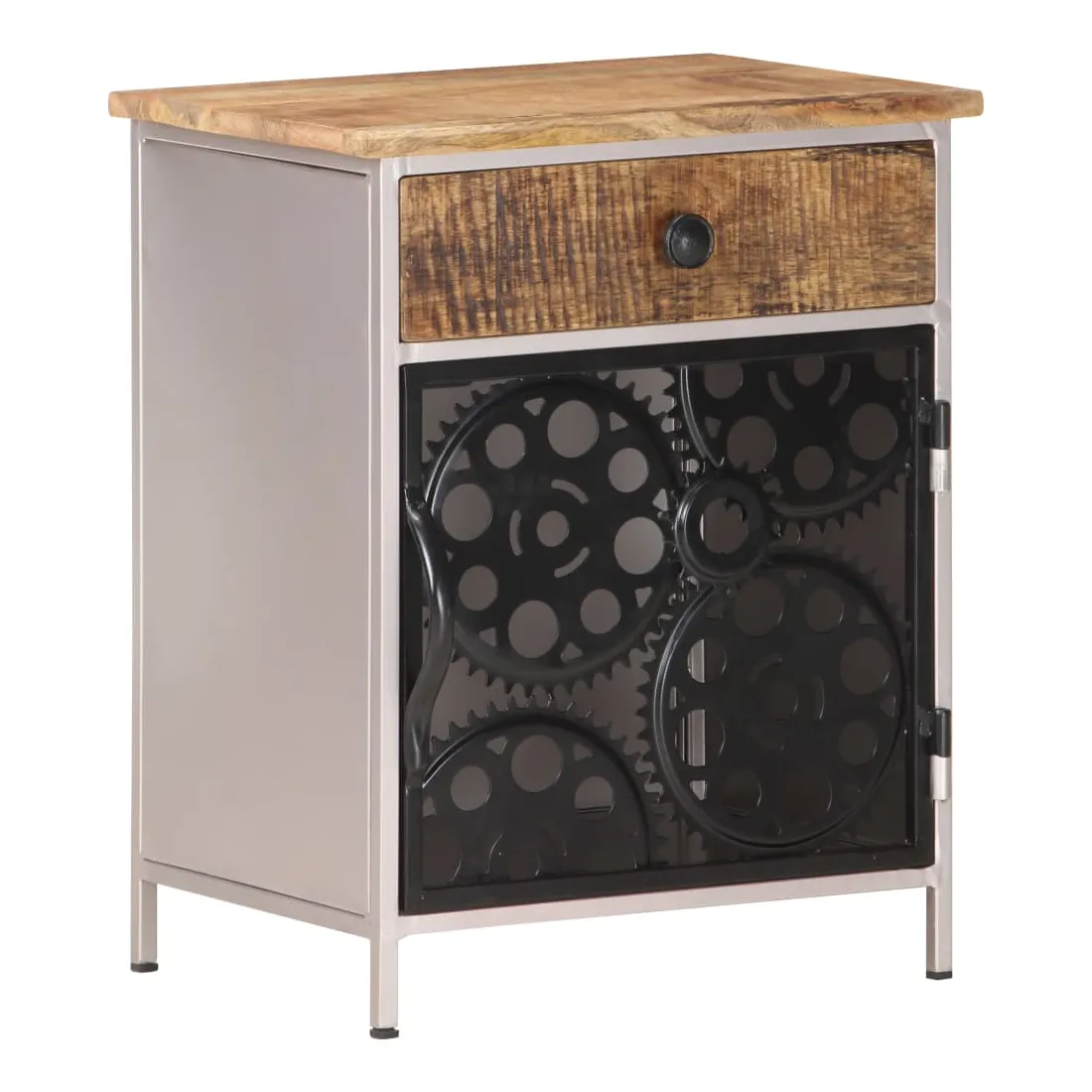 La table de chevet unique est faite de bois de manguier brut et comporte une porte et un tiroir, un choix parfait pour votre chambre à coucher ! La table de chevet est faite de bois de manguier brut, un bois dur tropical avec la force de soutenir le poids. Il résiste également à l'usure du temps, ce qui le rend stable et durable. Le savoir-faire et les beaux grains de bois rendent chaque meuble unique et légèrement différent l'un de l'autre. Cette table de chevet comprend également 1 porte et 1 tiroir, offrant un espace de rangement suffisant pour garder vos articles essentiels organisés et à portée de main. De plus, la porte est faite de véritables roues de chaîne de vélo, ce qui la rend élégante et unique. Remarque importante : les couleurs et les grains peuvent varier d'une pièce à l'autre, rendant chaque pièce unique. La livraison est aléatoire, ce qui garantit l'exclusivité et l'individualité de votre produit.
