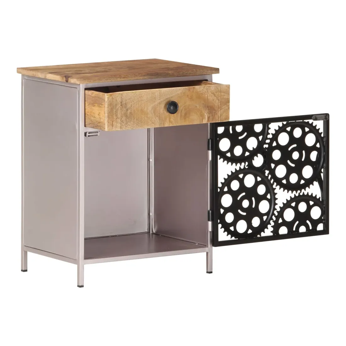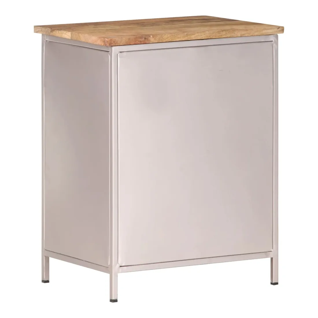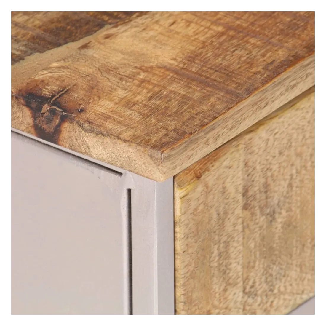- Matériau : bois de manguier brut avec une finition naturelle, fer avec une finition enduite de poudre argentée