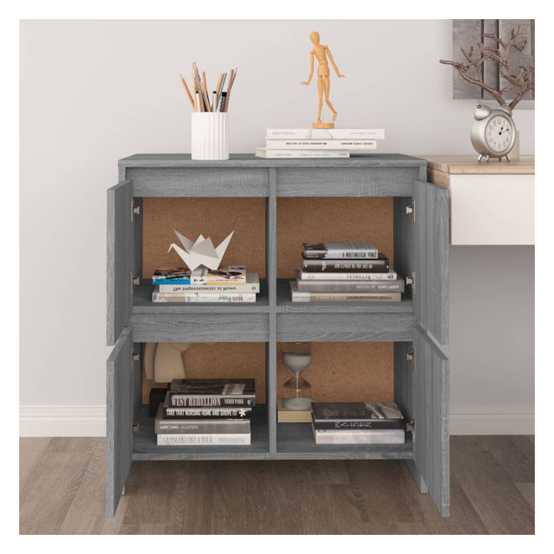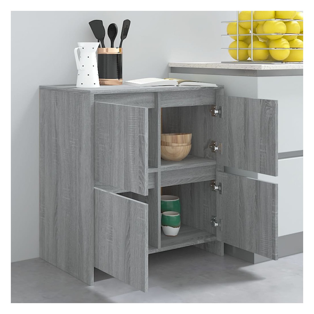 Ces buffets, dotés d'un design minimaliste, sont un supplément pratique mais également décoratif à votre maison. Avec 4 portes, l'armoire latérale offre un grand espace de rangement pour les livres, les appareils multimédia et d'autres articles. Le dessus de table robuste est idéal pour afficher des objets décoratifs, des cadres photo et des plantes en pot. De plus, l'armoire de rangement est facile à nettoyer avec un chiffon humide.