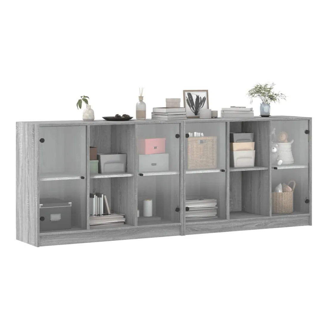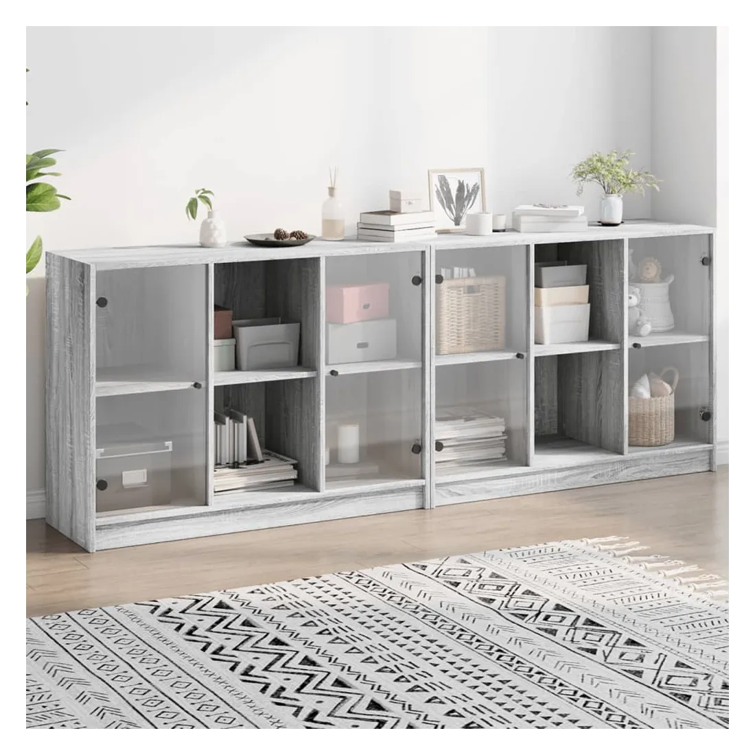 Cette bibliothèque offre une solution idéale pour organiser vos livres et ajoutera une touche de charme moderne à votre intérieur. Matériau robuste et durable : le bois d'ingénierie est d'une qualité exceptionnelle avec une surface lisse et présente également résistance, stabilité et résistance à l'humidité.Grand espace de rangement : la bibliothèque offre suffisamment d'espace de rangement pour garder votre collection de livres, magazines et documents en bon ordre.Dessus stable et robuste : le dessus de l'armoire de rangement est parfait pour exposer vos objets décoratifs, cadres photo et plantes en pot.Design pratique : gardez vos essentiels à l'abri de la poussière en les cachant derrière les portes en verre. De plus, les poignées noires facilitent l'ouverture de la bibliothèque. Attention :Pour éviter qu'il ne bascule, ce produit doit être utilisé avec le dispositif de fixation murale fourni.