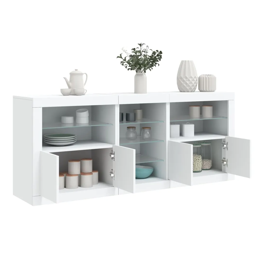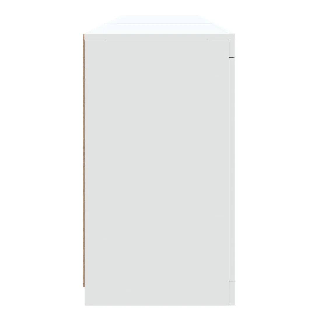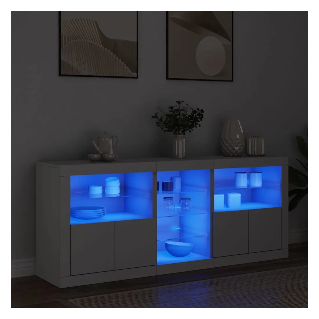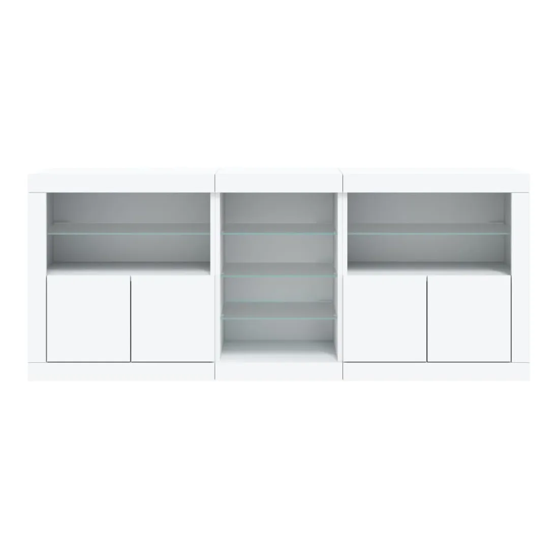 Décorez votre pièce avec ce buffet moderne avec éclairage LED, il s'harmonise facilement avec les meubles de tout style de votre maison. Matériau durable : le bois d'ingénierie est d'une qualité exceptionnelle avec une surface lisse et présente également résistance, stabilité et résistance à l'humidité.Lumières LED RVB : le buffet est équipé de lumières LED RVB vibrantes. Avec divers menus personnalisables, vous pouvez changer sans effort la couleur des lumières et même les régler automatiquement. Ces lumières LED renforcent non seulement l'aspect contemporain du buffet, mais aussi son attrait pour la mode.Grand espace de rangement : l'armoire de rangement offre beaucoup d'espace pour garder vos objets du quotidien bien rangés et facilement accessibles.Fonction d'exposition : la partie supérieure robuste de l'armoire d'entrée est idéale pour exposer des objets décoratifs, des cadres photo ou des plantes en pot.Porte pratiques : gardez vos essentiels à l'abri de la poussière en les cachant derrière les portes de l'armoire latérale. Bon à savoir :Ce produit est doté d'un connecteur USB qui nécessite une source d'alimentation USB de 5V certifiée (non incluse). Attention :Pour éviter qu'il ne soit renversé, ce produit doit être utilisé avec le dispositif de fixation au mur fourni.