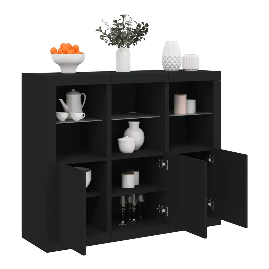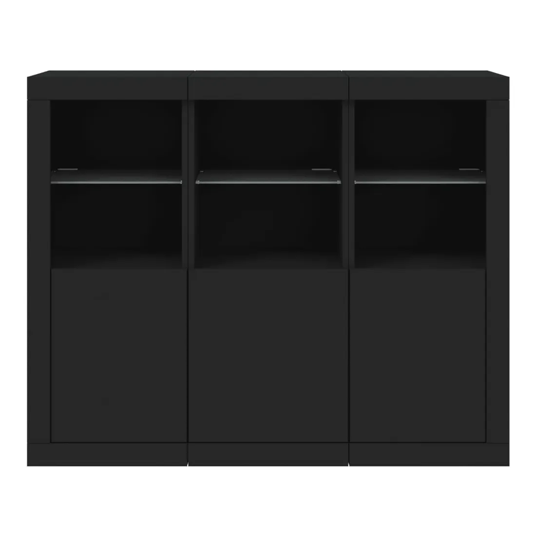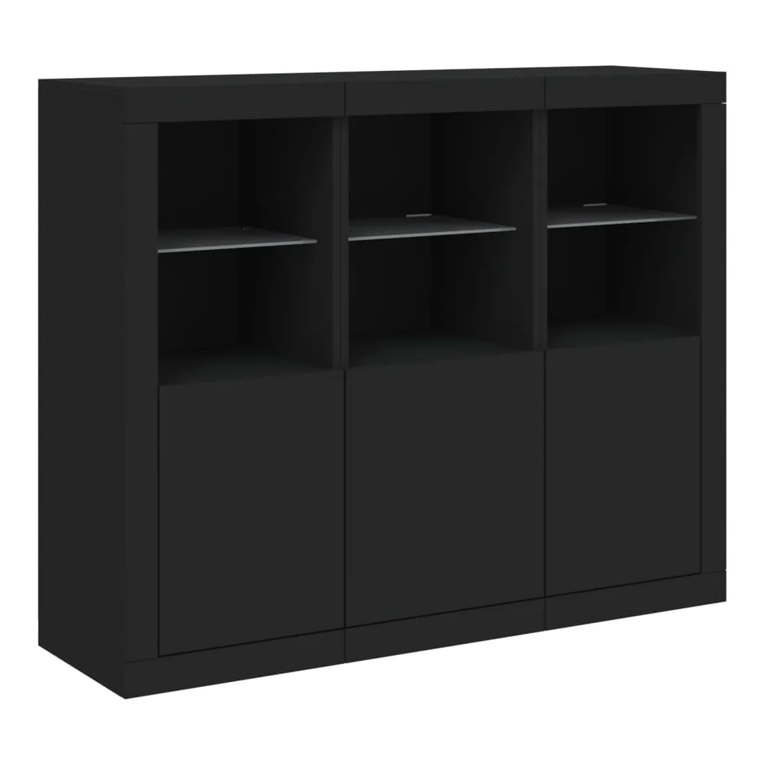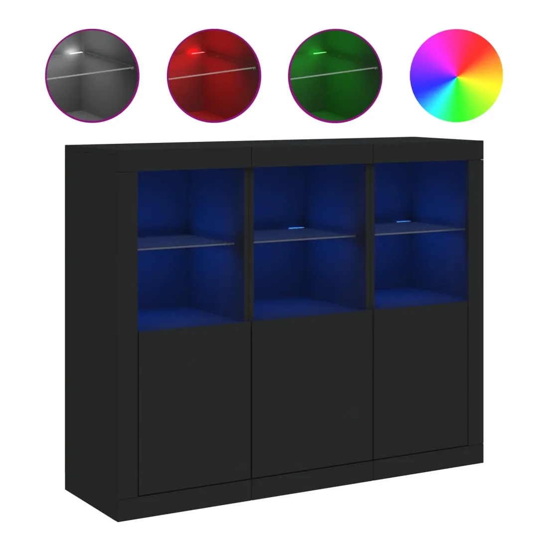 Décorez votre pièce avec ces buffets modernes à éclairage LED qui s'harmonisent facilement avec les meubles de tout style de votre maison. Matériau durable : le bois d'ingénierie est d'une qualité exceptionnelle avec une surface lisse et présente également résistance, stabilité et résistance à l'humidité.Grand espace de rangement : ces buffets offrent un grand espace de rangement pour garder vos magazines, livres, télécommandes et autres petits objets bien organisés et à portée de main.Fonction d'affichage : le dessus de ces buffets est idéal pour afficher des objets décoratifs, des cadres photo ou des plantes en pot.Lumières LED réglables : ces armoires de rangement sont équipées de lumières LED RVB, qui ont différents menus pour changer la couleur de la lumière et l'ajuster automatiquement, décorant votre maison de manière colorée et belle. Attention :Pour éviter qu'il ne soit renversé, ce produit doit être utilisé avec le dispositif de fixation au mur fourni.Bon à savoir :Ce produit est doté d'un connecteur USB qui nécessite une source d'alimentation USB de 5V certifiée (non incluse).