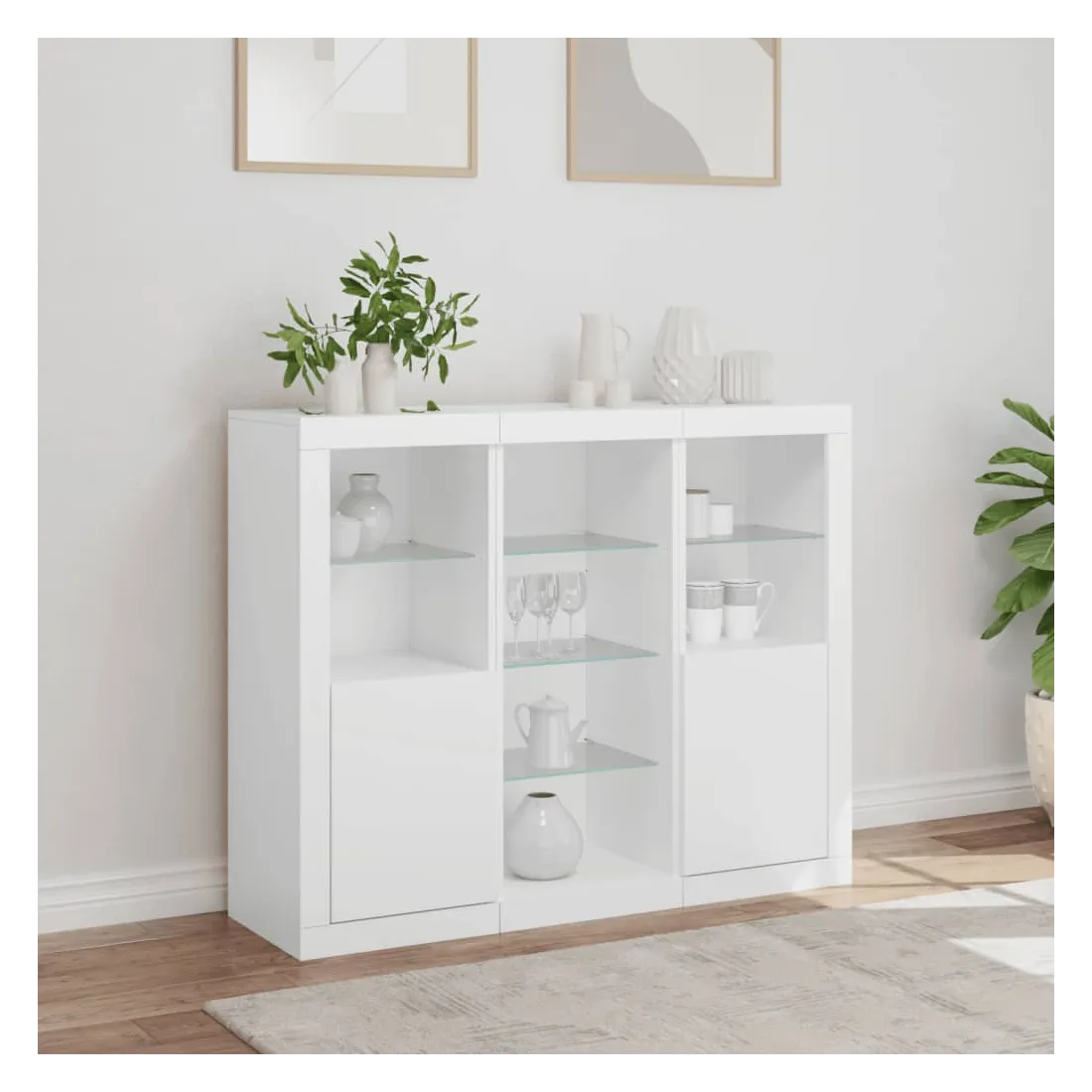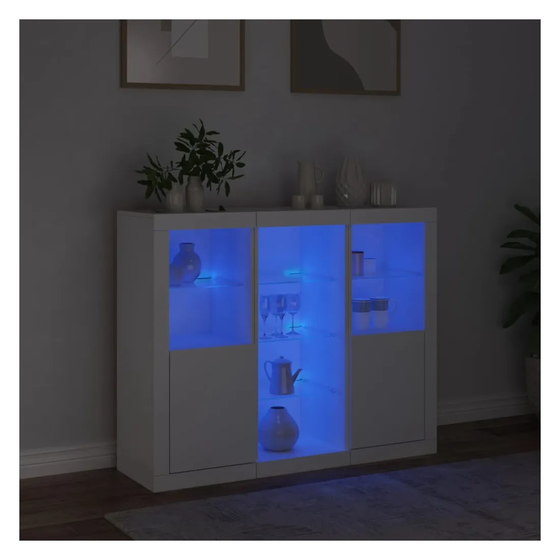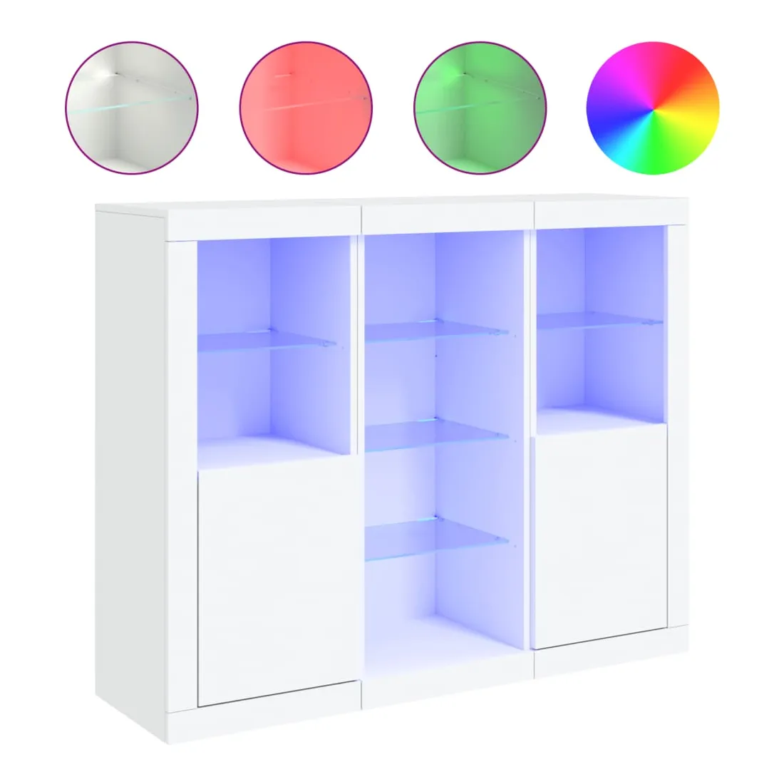 Décorez votre pièce avec ces buffets modernes à éclairage LED qui s'harmonisent facilement avec les meubles de tout style de votre maison. Matériau durable : le bois d'ingénierie est d'une qualité exceptionnelle avec une surface lisse et présente également résistance, stabilité et résistance à l'humidité.Grand espace de rangement : ces buffets offrent un grand espace de rangement pour garder vos magazines, livres, télécommandes et autres petits objets bien organisés et à portée de main.Fonction d'affichage : le dessus de ces buffets est idéal pour afficher des objets décoratifs, des cadres photo ou des plantes en pot.Lumières LED réglables : ces armoires de rangement sont équipées de lumières LED RVB, qui ont différents menus pour changer la couleur de la lumière et l'ajuster automatiquement, décorant votre maison de manière colorée et belle. Attention :Pour éviter qu'il ne soit renversé, ce produit doit être utilisé avec le dispositif de fixation au mur fourni.Bon à savoir :Ce produit est doté d'un connecteur USB qui nécessite une source d'alimentation USB de 5V certifiée (non incluse).