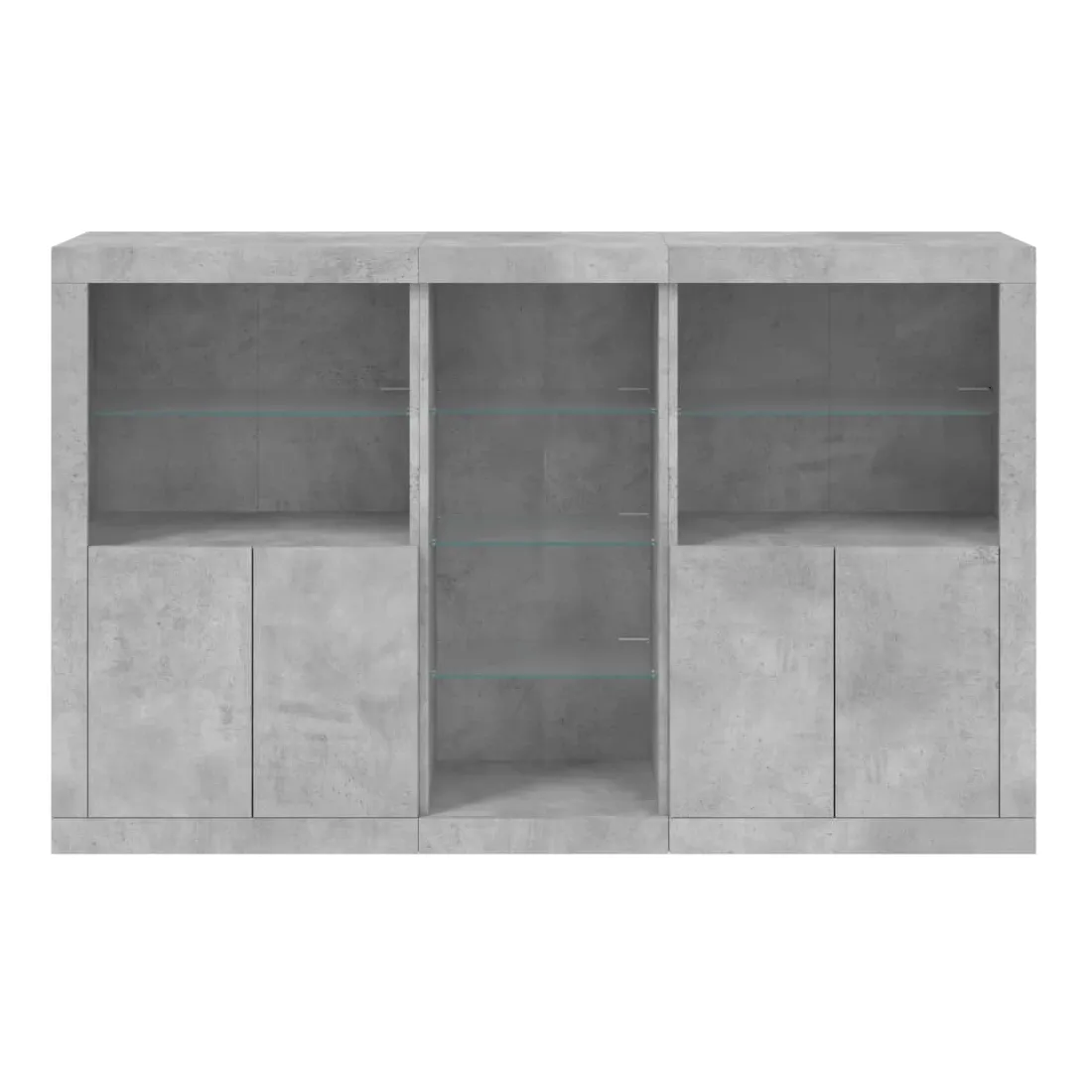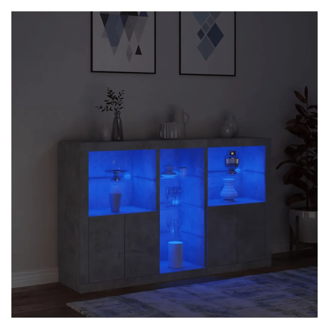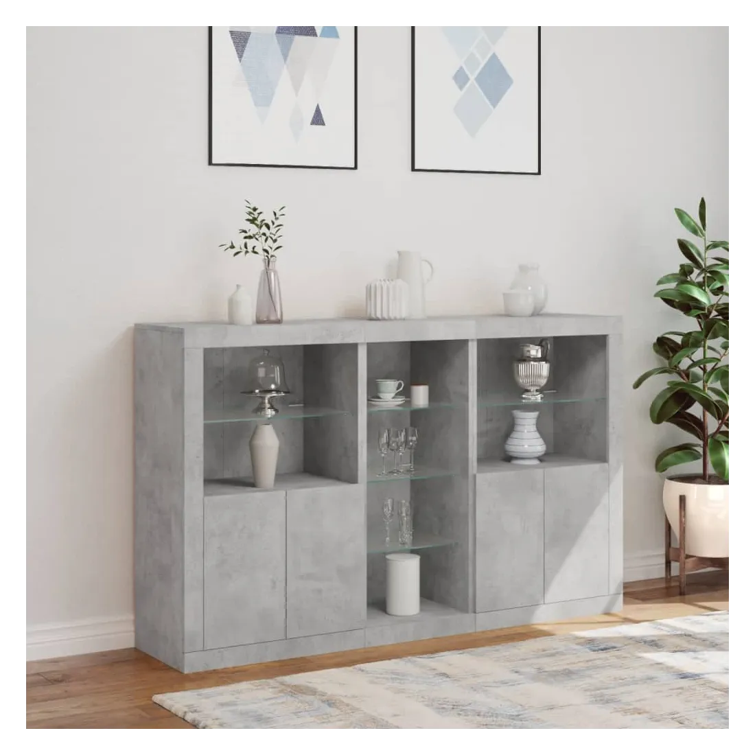 Décorez votre pièce avec ce buffet moderne avec éclairage LED, il s'harmonise facilement avec les meubles de tout style de votre maison. Matériau durable : le bois d'ingénierie est d'une qualité exceptionnelle avec une surface lisse et présente également résistance, stabilité et résistance à l'humidité.Lumières LED RVB : le buffet est équipé de lumières LED RVB vibrantes. Avec divers menus personnalisables, vous pouvez changer sans effort la couleur des lumières et même les régler automatiquement. Ces lumières LED renforcent non seulement l'aspect contemporain du buffet, mais aussi son attrait pour la mode.Grand espace de rangement : l'armoire de rangement offre beaucoup d'espace pour garder vos objets du quotidien bien rangés et facilement accessibles.Fonction d'exposition : la partie supérieure robuste de l'armoire d'entrée est idéale pour exposer des objets décoratifs, des cadres photo ou des plantes en pot.Porte pratiques : gardez vos essentiels à l'abri de la poussière en les cachant derrière les portes de l'armoire latérale. Bon à savoir :Ce produit est doté d'un connecteur USB qui nécessite une source d'alimentation USB de 5V certifiée (non incluse). Attention :Pour éviter qu'il ne soit renversé, ce produit doit être utilisé avec le dispositif de fixation au mur fourni.