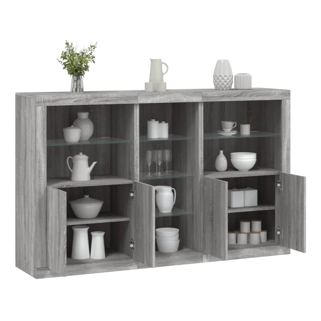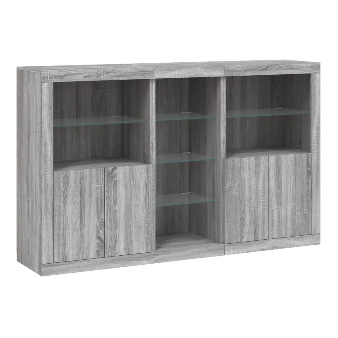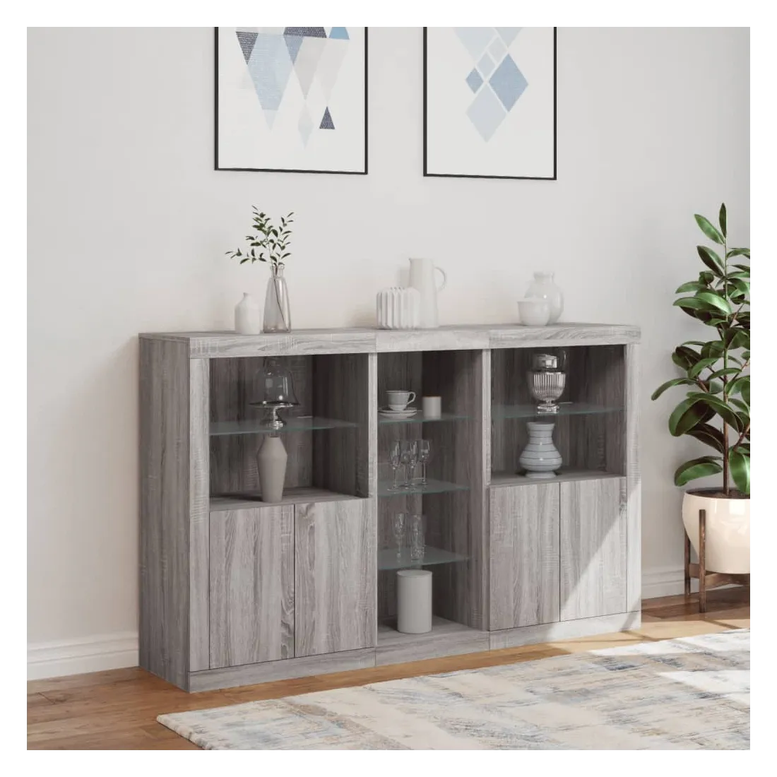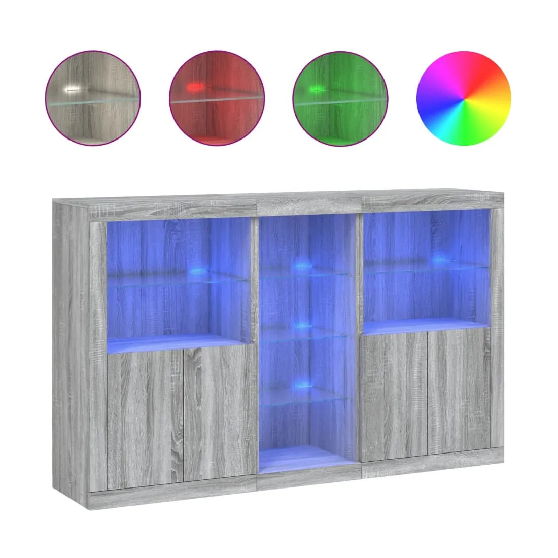 Décorez votre pièce avec ce buffet moderne avec éclairage LED, il s'harmonise facilement avec les meubles de tout style de votre maison. Matériau durable : le bois d'ingénierie est d'une qualité exceptionnelle avec une surface lisse et présente également résistance, stabilité et résistance à l'humidité.Lumières LED RVB : le buffet est équipé de lumières LED RVB vibrantes. Avec divers menus personnalisables, vous pouvez changer sans effort la couleur des lumières et même les régler automatiquement. Ces lumières LED renforcent non seulement l'aspect contemporain du buffet, mais aussi son attrait pour la mode.Grand espace de rangement : l'armoire de rangement offre beaucoup d'espace pour garder vos objets du quotidien bien rangés et facilement accessibles.Fonction d'exposition : la partie supérieure robuste de l'armoire d'entrée est idéale pour exposer des objets décoratifs, des cadres photo ou des plantes en pot.Porte pratiques : gardez vos essentiels à l'abri de la poussière en les cachant derrière les portes de l'armoire latérale. Bon à savoir :Ce produit est doté d'un connecteur USB qui nécessite une source d'alimentation USB de 5V certifiée (non incluse). Attention :Pour éviter qu'il ne soit renversé, ce produit doit être utilisé avec le dispositif de fixation au mur fourni.