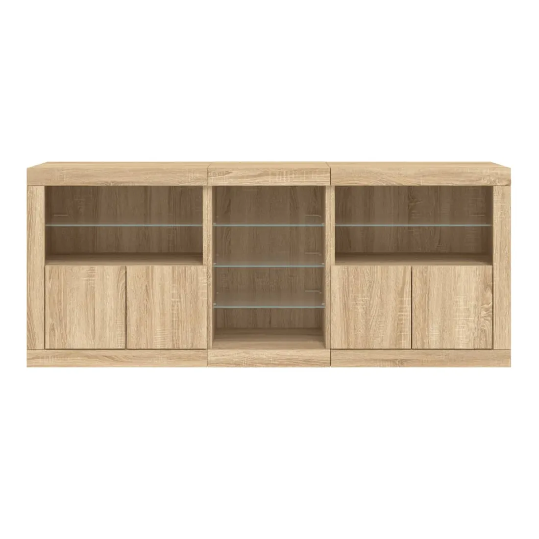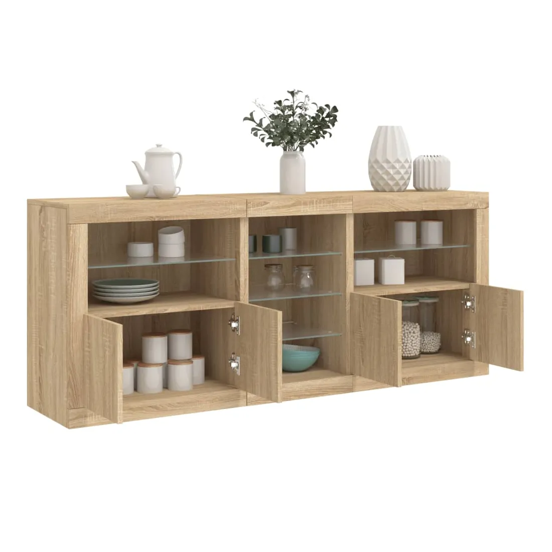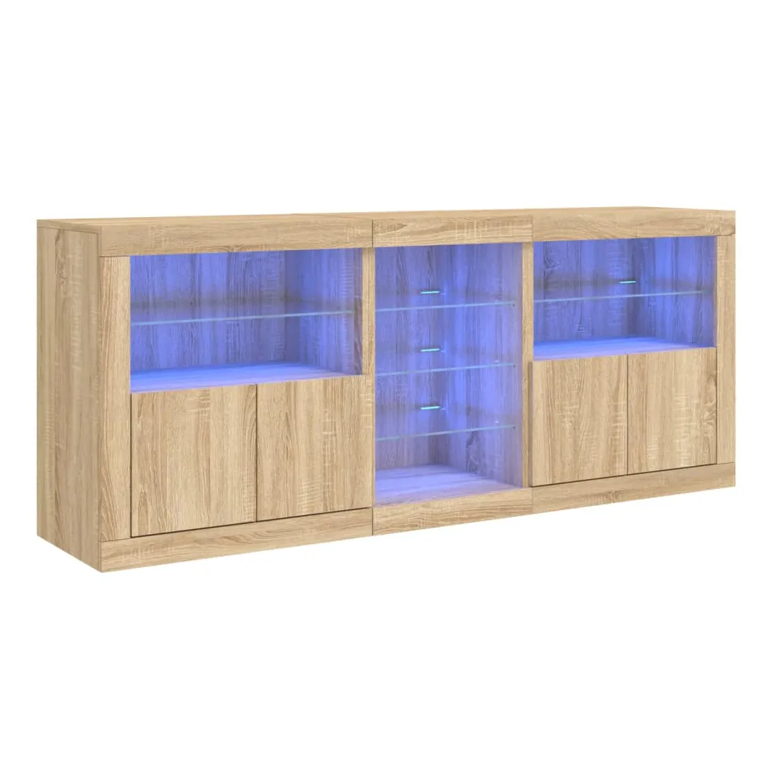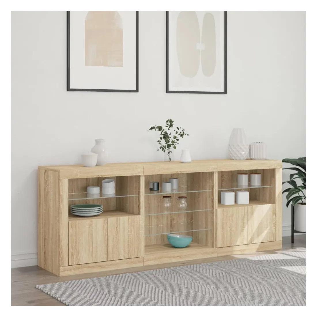 Décorez votre pièce avec ce buffet moderne avec éclairage LED, il s'harmonise facilement avec les meubles de tout style de votre maison. Matériau durable : le bois d'ingénierie est d'une qualité exceptionnelle avec une surface lisse et présente également résistance, stabilité et résistance à l'humidité.Lumières LED RVB : le buffet est équipé de lumières LED RVB vibrantes. Avec divers menus personnalisables, vous pouvez changer sans effort la couleur des lumières et même les régler automatiquement. Ces lumières LED renforcent non seulement l'aspect contemporain du buffet, mais aussi son attrait pour la mode.Grand espace de rangement : l'armoire de rangement offre beaucoup d'espace pour garder vos objets du quotidien bien rangés et facilement accessibles.Fonction d'exposition : la partie supérieure robuste de l'armoire d'entrée est idéale pour exposer des objets décoratifs, des cadres photo ou des plantes en pot.Porte pratiques : gardez vos essentiels à l'abri de la poussière en les cachant derrière les portes de l'armoire latérale. Bon à savoir :Ce produit est doté d'un connecteur USB qui nécessite une source d'alimentation USB de 5V certifiée (non incluse). Attention :Pour éviter qu'il ne soit renversé, ce produit doit être utilisé avec le dispositif de fixation au mur fourni.