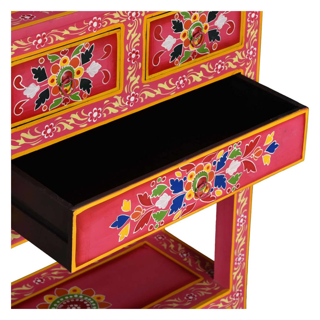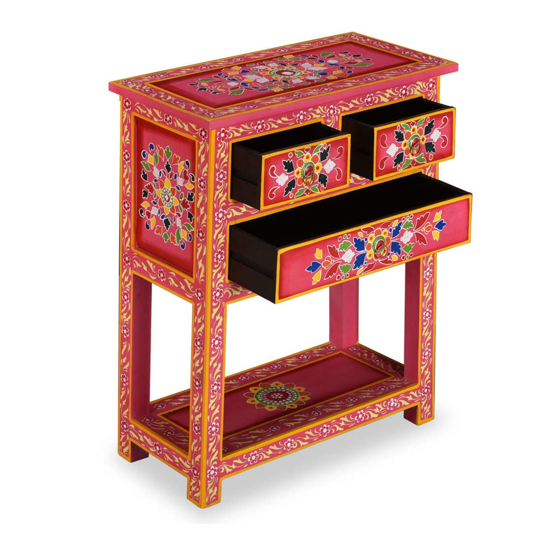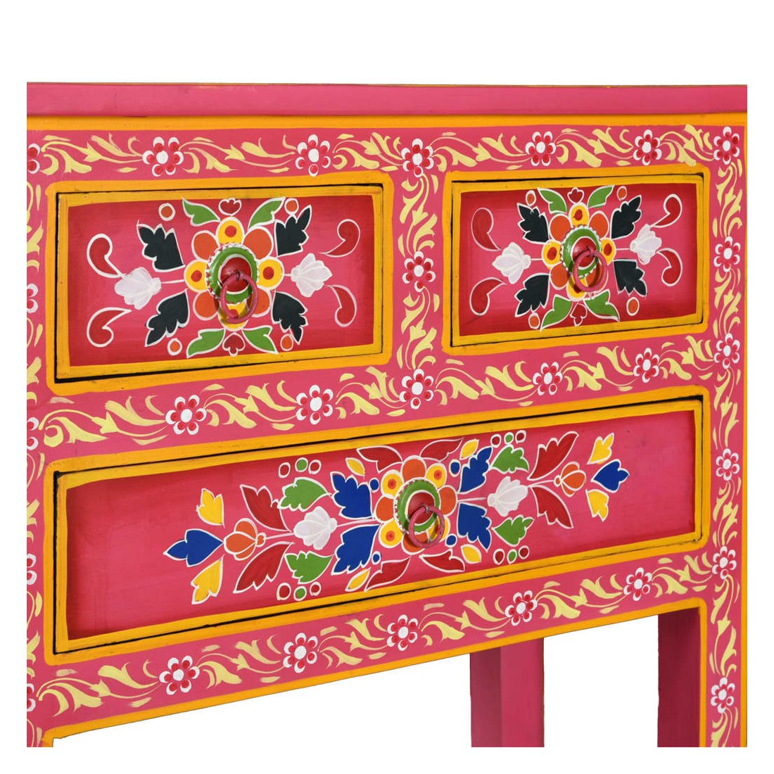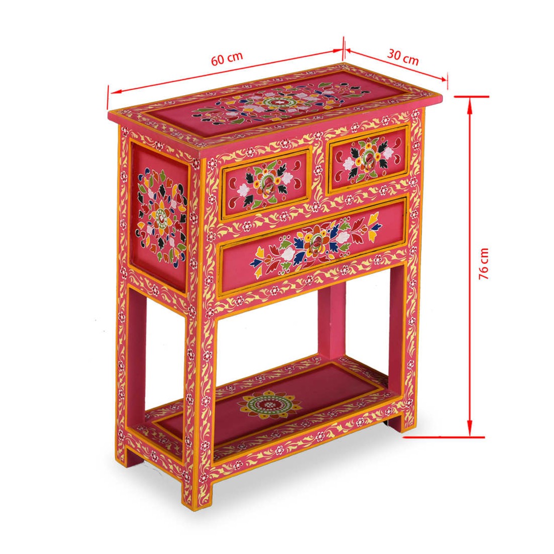 Ce buffet unique ajoutera une touche de couleur qui rendra le décor de votre salon vraiment joli. Le buffet est fabriqué à la main en bois de manguier qui est à la fois durable et beau et l'artisanat ajoute à son style rétro spectaculaire. Chaque étape du processus est réalisée avec le plus grand soin, que ce soit le polissage, la peinture ou le laquage. Le buffet comporte de nombreux détails décoratifs peints à la main, ce qui crée un effet chaleureux et riche. Ce buffet a 3 tiroirs et 1 étagère pour garder toutes sortes de petits objets organisés et à portée de main et ses boutons de poignées distinctifs facilitent l'ouverture des tiroirs. L'article est déjà assemblé ; aucun assemblage n'est requis.
