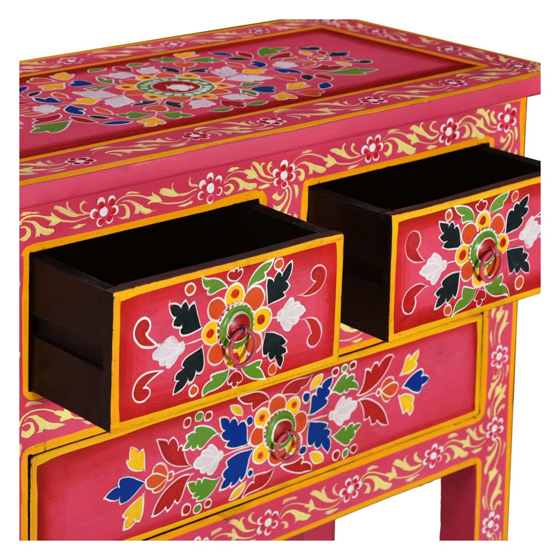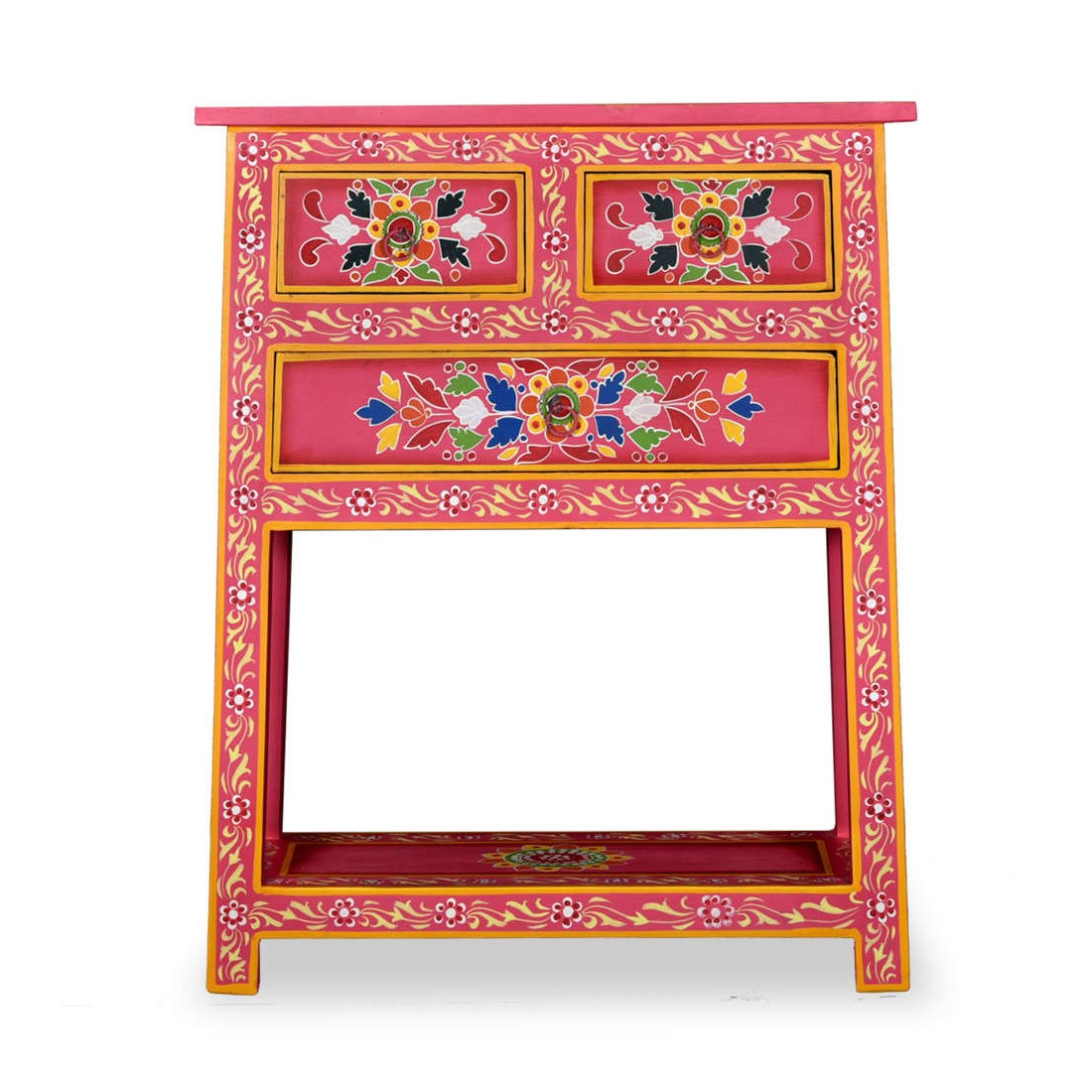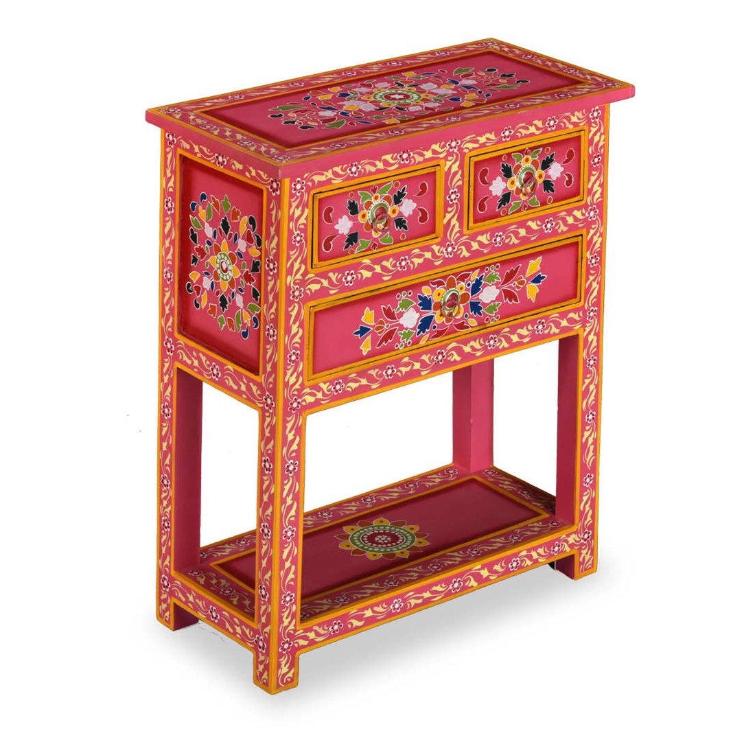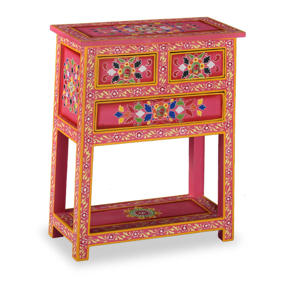 Ce buffet unique ajoutera une touche de couleur qui rendra le décor de votre salon vraiment joli. Le buffet est fabriqué à la main en bois de manguier qui est à la fois durable et beau et l'artisanat ajoute à son style rétro spectaculaire. Chaque étape du processus est réalisée avec le plus grand soin, que ce soit le polissage, la peinture ou le laquage. Le buffet comporte de nombreux détails décoratifs peints à la main, ce qui crée un effet chaleureux et riche. Ce buffet a 3 tiroirs et 1 étagère pour garder toutes sortes de petits objets organisés et à portée de main et ses boutons de poignées distinctifs facilitent l'ouverture des tiroirs. L'article est déjà assemblé ; aucun assemblage n'est requis.