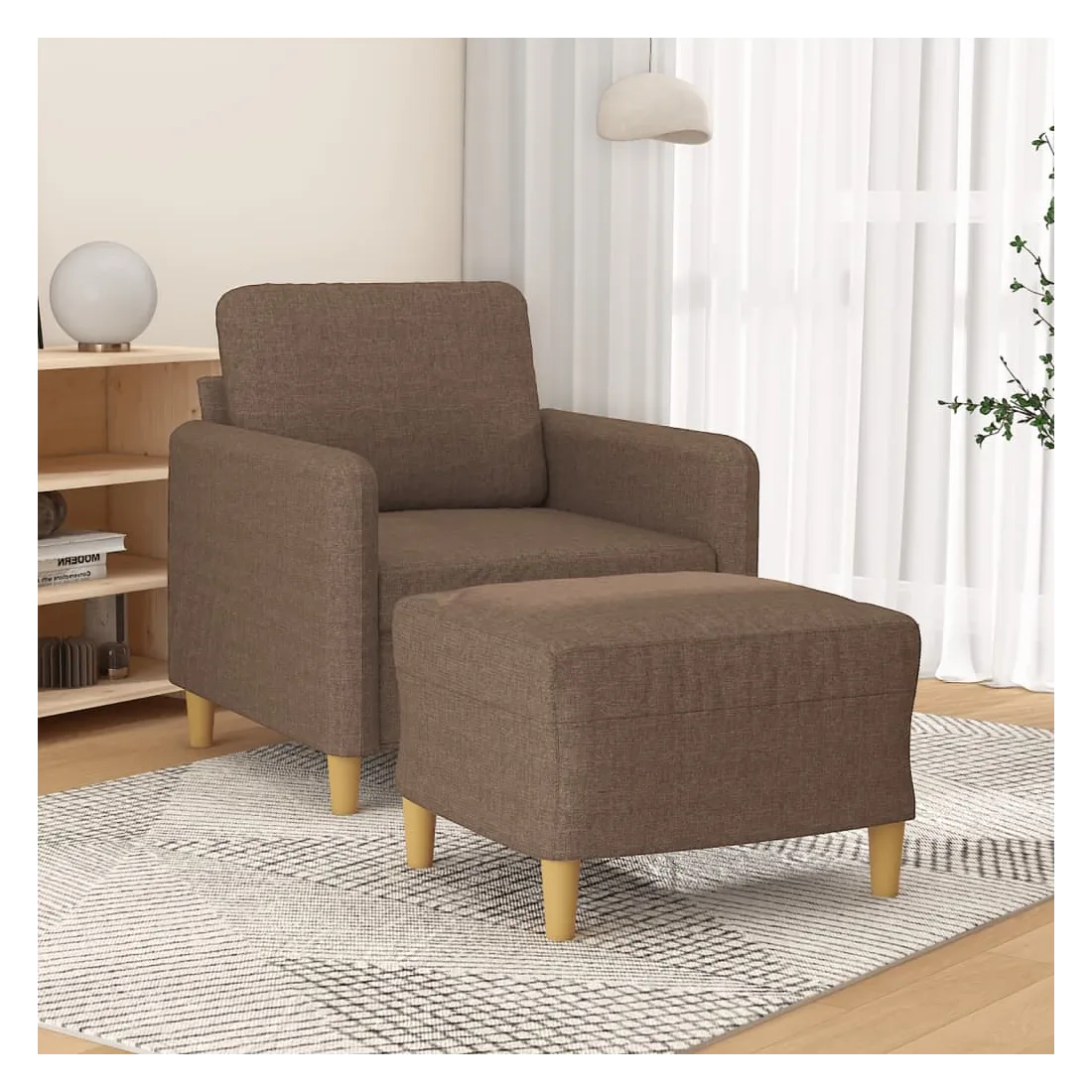 Ce fauteuil avec repose-pied est un excellent endroit pour discuter, lire, regarder la télévision ou simplement vous détendre. Il est destiné à être un point central de votre maison. Tissu durable : le tissu présente un aspect simple et épuré tout en restant respirant et durable.Structure robuste et stable : la structure en contreplaqué et en métal du canapé avec repose-pieds assure robustesse et stabilité.Expérience d'assise confortable : le fauteuil est très confortable avec le siège, les accoudoirs et le coussin de dossier bien rembourrés.Repose-pied polyvalent : ce repose-pied convient pour reposer vos pieds lorsque vous êtes allongé dans un canapé ou un fauteuil inclinable, ou pour vous offrir un siège supplémentaire dans votre pièce. De plus, le design simple et la taille compacte le rendent idéal pour presque tous vos espaces de vie.Design accrocheur : doté d'un design simple mais moderne, ce canapé avec repose-pied est destiné à attirer l'attention dans votre pièce.