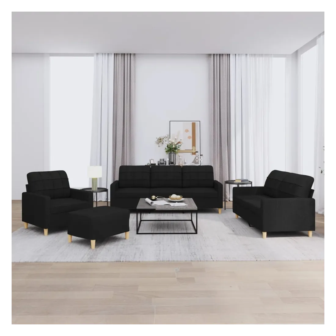 Cet ensemble de canapés est un excellent endroit pour discuter, lire, regarder la télévision ou simplement vous détendre. Il est destiné à être un point central de votre maison. Tissu durable : le tissu présente un aspect simple et épuré tout en restant respirant et durable.Structure robuste et stable : la structure en contreplaqué et en métal du canapé assure robustesse et stabilité.Expérience d'assise confortable : le canapé est très confortable avec le siège, les accoudoirs et les oreillers de dossier bien rembourrés.Pouf polyvalent : ce repose-pied convient pour reposer vos pieds lorsque vous êtes allongé dans un canapé, ou pour vous offrir un siège supplémentaire dans votre pièce. De plus, le design simple et la taille compacte le rendent idéal pour presque tous vos espaces de vie.