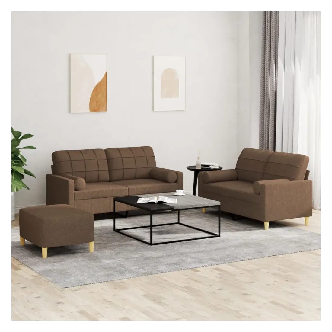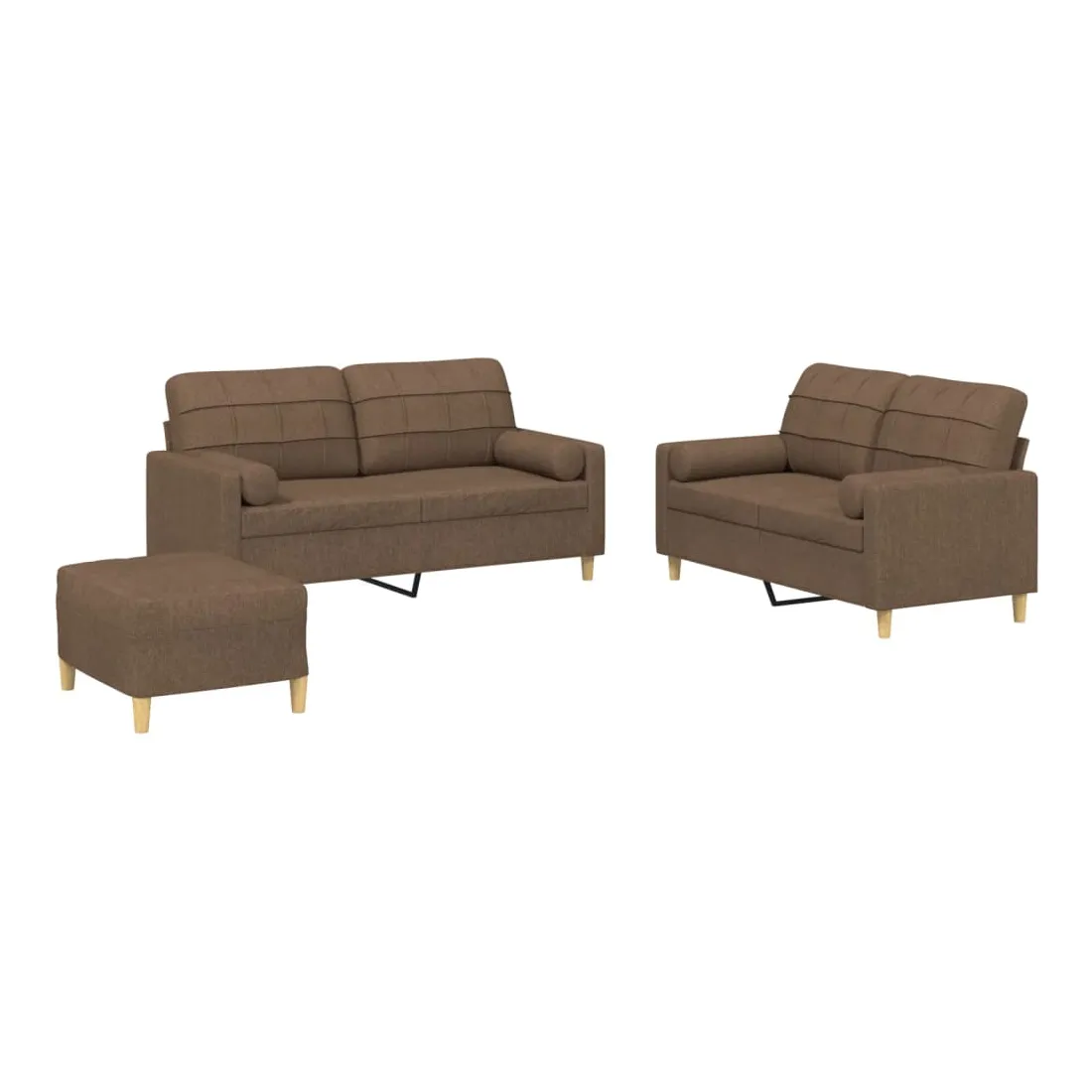 Cet ensemble de canapés est un excellent endroit pour discuter, lire, regarder la télévision ou simplement vous détendre. Il est destiné à être un point central de votre maison. Tissu durable : le tissu présente un aspect simple et épuré tout en restant respirant et durable.Structure robuste et stable : la structure en contreplaqué et en métal du canapé assure robustesse et stabilité.Expérience d'assise confortable : le canapé est très confortable avec le siège, les accoudoirs et les oreillers de dossier bien rembourrés.Oreillers cylindriques pratiques : ces oreillers cylindriques non seulement embellissent votre décor, mais ils peuvent également apporter un confort supplémentaire lorsque vous êtes assis ou allongé.Pouf polyvalent : ce repose-pied convient pour reposer vos pieds lorsque vous êtes allongé dans un canapé, ou pour vous offrir un siège supplémentaire dans votre pièce. De plus, le design simple et la taille compacte le rendent idéal pour presque tous vos espaces de vie.