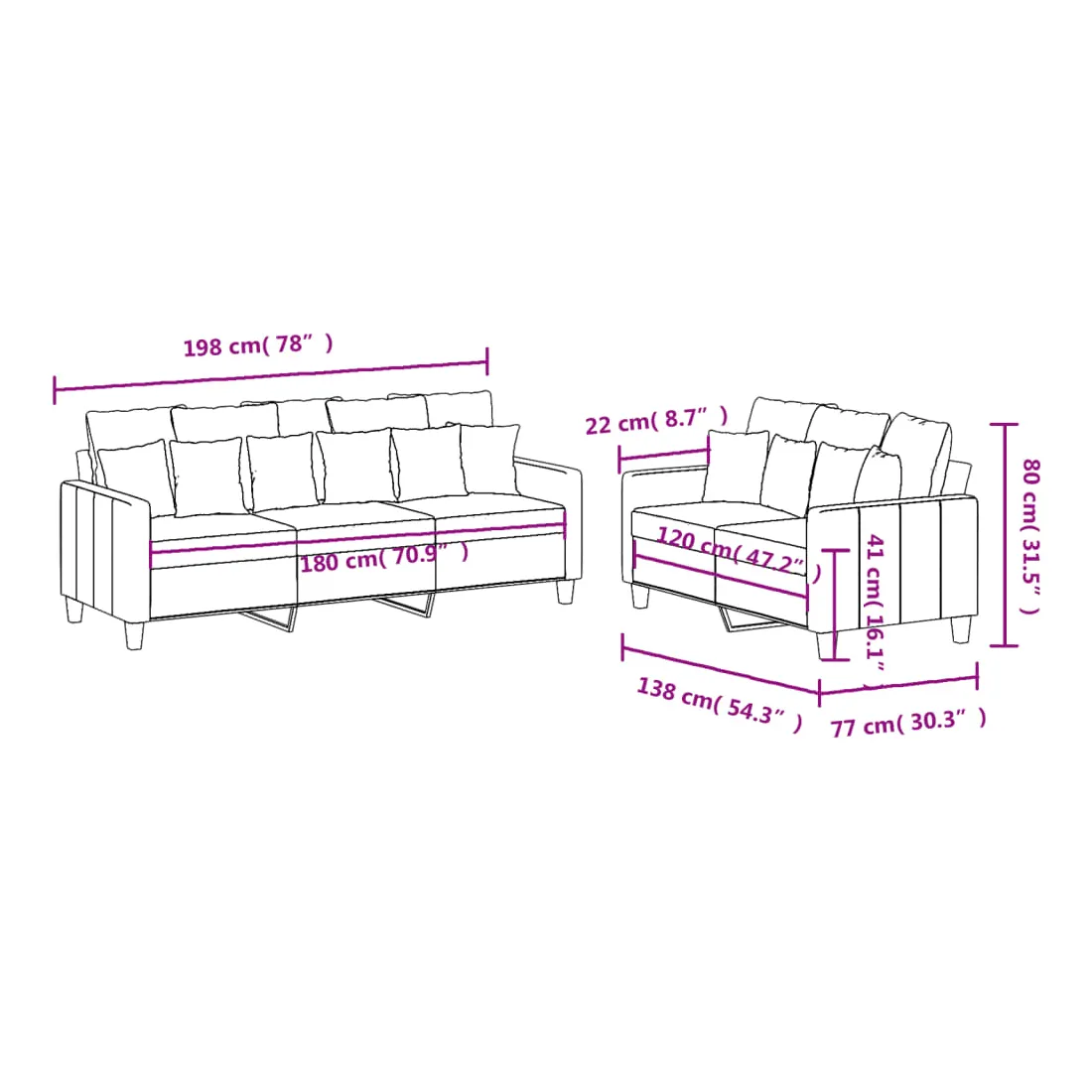 Cet ensemble de canapés est un excellent endroit pour discuter, lire, regarder la télévision ou simplement vous détendre. Il est destiné à être un point central de votre maison. Tissu durable : le tissu présente un aspect simple et épuré tout en restant respirant et durable. Structure robuste et stable : la structure en contreplaqué et en métal du canapé assure robustesse et stabilité. Expérience d'assise confortable : le canapé est très confortable avec le siège, les accoudoirs et les oreillers de dossier bien rembourrés.