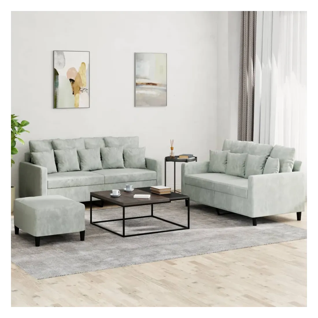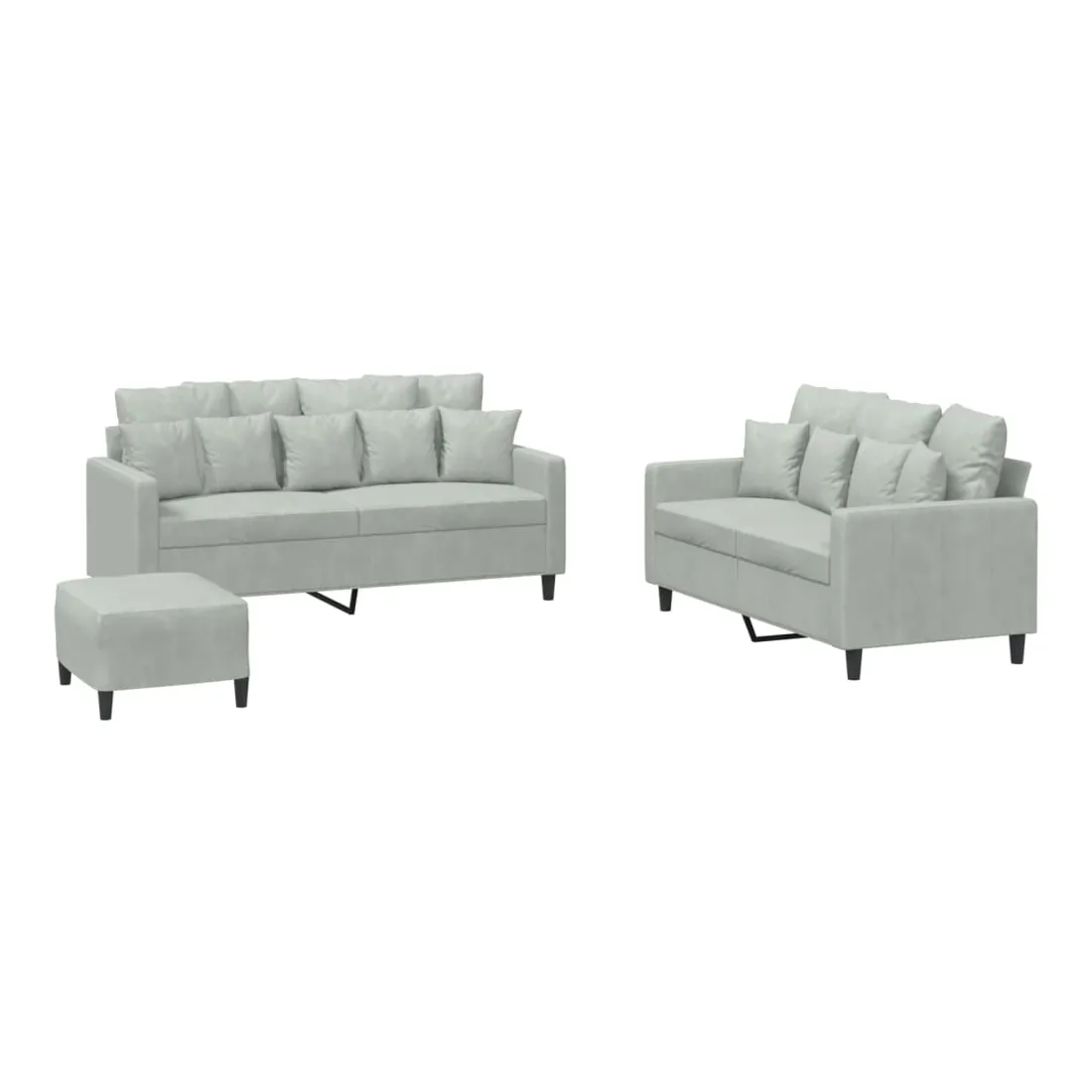 Cet ensemble de canapés est un excellent endroit pour discuter, lire, regarder la télévision ou simplement vous détendre. Il est destiné à être un point central de votre maison. Velours doux : le velours est un tissu doux et confortable, agréable au toucher.Structure robuste et stable : la structure en contreplaqué et en métal du canapé assure robustesse et stabilité. Expérience d'assise confortable : le canapé est très confortable avec le siège, les accoudoirs et les oreillers de dossier bien rembourrés.Pouf polyvalent : ce repose-pied convient pour reposer vos pieds lorsque vous êtes allongé dans un canapé ou pour vous offrir un siège supplémentaire dans votre pièce. De plus, le design simple et la taille compacte le rendent idéal pour presque tous vos espaces de vie.