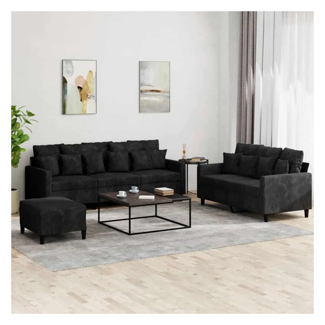 Cet ensemble de canapés est un excellent endroit pour discuter, lire, regarder la télévision ou simplement vous détendre. Il est destiné à être un point central de votre maison. Velours doux : le velours est un tissu doux et confortable, agréable au toucher.Structure robuste et stable : la structure en contreplaqué et en métal du canapé assure robustesse et stabilité. Expérience d'assise confortable : le canapé est très confortable avec le siège, les accoudoirs et les oreillers de dossier bien rembourrés.Pouf polyvalent : ce repose-pied convient pour reposer vos pieds lorsque vous êtes allongé dans un canapé ou pour vous offrir un siège supplémentaire dans votre pièce. De plus, le design simple et la taille compacte le rendent idéal pour presque tous vos espaces de vie.