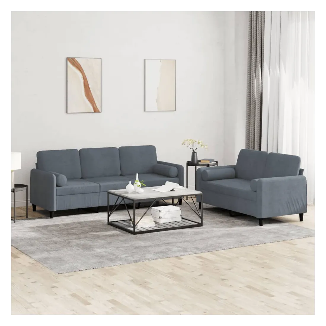 Cet ensemble de canapés est un excellent endroit pour discuter, lire, regarder la télévision ou simplement vous détendre. Il est destiné à être un point central de votre maison. Velours doux : le velours est un tissu doux et confortable, agréable au toucher.Structure robuste et stable : la structure en contreplaqué et en métal du canapé assure robustesse et stabilité.Expérience d'assise confortable : le canapé est très confortable avec le siège, les accoudoirs et les oreillers de dossier bien rembourrés.Oreillers cylindriques pratiques : ces oreillers cylindriques non seulement embellissent votre décor mais ils peuvent également apporter un confort supplémentaire lorsque vous êtes assis ou allongé.