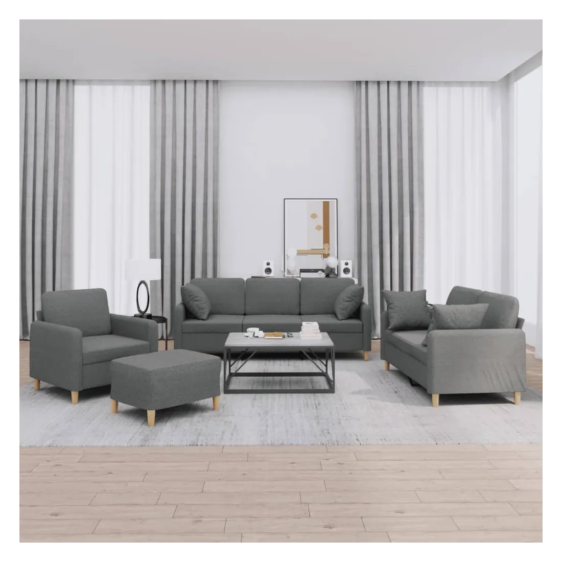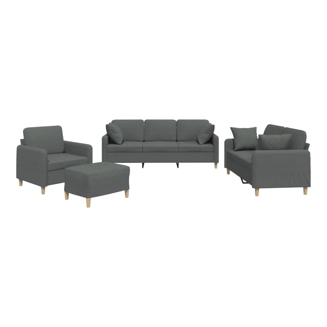 Cet ensemble de canapés est un excellent endroit pour discuter, lire, regarder la télévision ou simplement vous détendre. Il est destiné à être un point central de votre maison. Tissu durable : le tissu présente un aspect simple et épuré tout en restant respirant et durable.Structure robuste et stable : la structure en contreplaqué et en métal du canapé assure robustesse et stabilité.Expérience d'assise confortable : le canapé est très confortable avec le siège, les accoudoirs et les coussins de dossier bien rembourrés.Oreillers de canapé pratiques : ces oreillers décoratifs carrés non seulement embellissent votre décor mais ils peuvent également apporter un confort supplémentaire lorsque vous êtes assis ou allongé.Pouf polyvalent : ce repose-pied convient pour reposer vos pieds lorsque vous êtes allongé dans un canapé ou pour vous offrir un siège supplémentaire dans votre pièce. De plus, le design simple et la taille compacte le rendent idéal pour presque tous vos espaces de vie.