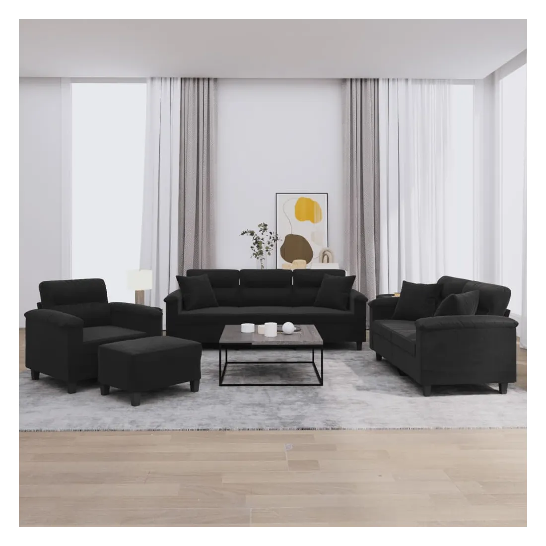 Cet ensemble de canapés est un excellent endroit pour discuter, lire, regarder la télévision ou simplement vous détendre. Il est destiné à être un point central de votre maison. Microfibre résistant : le microfibre est un tissu synthétique composé de fibres ultra-fines, particulièrement résistantes aux taches. Le tissu en microfibre est un excellent choix pour le rembourrage des meubles en raison de sa durabilité et de son nettoyage facile.Structure robuste et stable : la structure en contreplaqué et en métal du canapé assure robustesse et stabilité.Expérience d'assise confortable : le canapé est très confortable avec le siège, les accoudoirs et les oreillers de dossier bien rembourrés.Oreillers de canapé pratiques : ces oreillers décoratifs carrés non seulement embellissent votre décor mais ils peuvent également apporter un confort supplémentaire lorsque vous êtes assis ou allongé.Pouf polyvalent : ce repose-pied convient pour reposer vos pieds lorsque vous êtes allongé dans un canapé, ou pour vous offrir un siège supplémentaire dans votre pièce. De plus, le design simple et la taille compacte le rendent idéal pour presque tous vos espaces de vie.