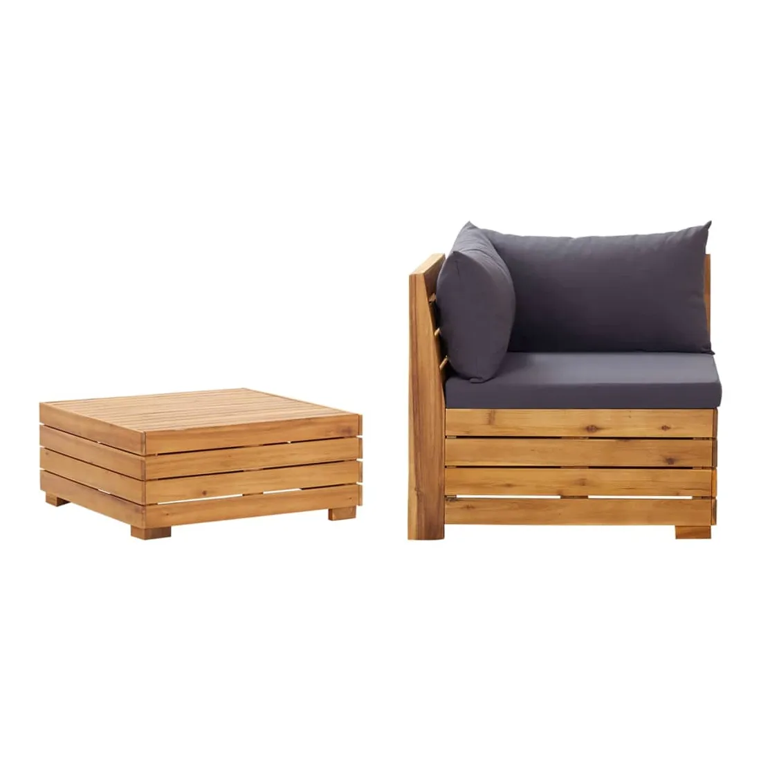 Cet ensemble de salon de jardin est un excellent choix pour vous détendre et profiter du temps, faire une sieste ou discuter avec votre famille ou vos amis. Avec un design à lattes intemporel, l’ensemble de salon en bois ajoute une touche de charme rustique à votre patio, terrasse ou jardin. Fabriqué en bois d’acacia massif, l’ensemble de meubles d’extérieur est résistant aux intempéries et hautement durable. Combiné avec les coussins bien rembourrés, cet ensemble de canapé offre le plus grand confort. Vous pouvez le combiner avec d’autres segments modulaires pour créer vos propres configurations de salon de jardin ! Remarque : Afin de prolonger la durée de vie de vos meubles d'extérieur, nous vous recommandons de les nettoyer régulièrement et de ne pas les laisser à l'extérieur sans protection inutilement.Nettoyage : Utiliser une solution savonneuse douceStockage : Si possible, stockez dans un endroit frais et sec à l'intérieur. Si le produit est stocké à l'extérieur, protégez-le avec une housse imperméable. Essuyez et séchez l'excès d'eau ou de neige des surfaces planes après la pluie ou une chute de neige. Permettez une circulation d'air suffisante afin d'éviter les dommages liés à l'humidité.