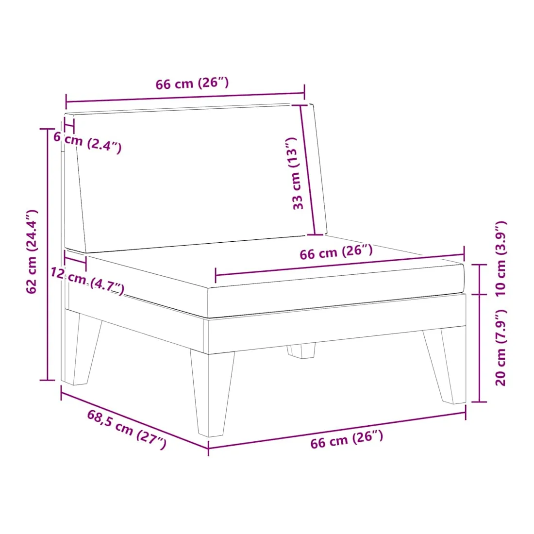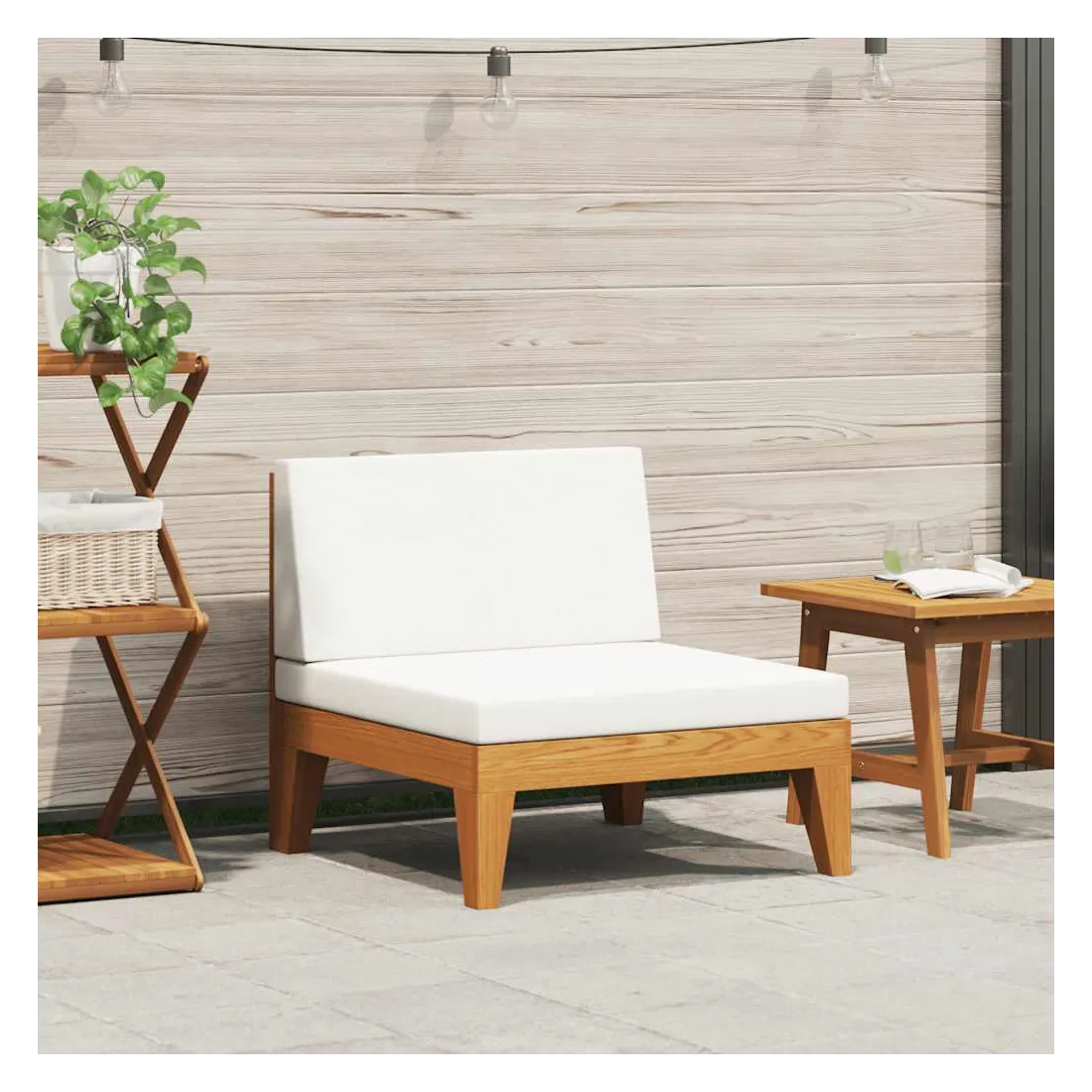 vidaXLCe canapé central en bois est un choix idéal pour vous détendre, profiter du beau temps, faire une sieste ou discuter en famille ou entre amis. Avec son design indémodable, cette chaise centrale ajoute une touche de charme rustique à votre espace de vie. Le siège central est fabriqué en bois d’acacia massif, un bois dur tropical, qui est résistant aux intempéries et très durable. Il a une construction solide et nécessite peu d’entretien. Combiné avec des coussins bien rembourrés, ce canapé offre le plus grand confort. Le canapé en bois est spécialement conçu pour faire partie d'un ensemble de salon et peut également être utilisé comme un canapé simple. Vous pouvez le combiner avec d’autres segments modulaires comme table basse, repose-pied et canapé d'angle pour créer vos propres configurations de salon de jardin ! Remarque : afin de prolonger la durée de vie de vos meubles d'extérieur, nous vous recommandons de les nettoyer régulièrement et de ne pas les laisser à l'extérieur sans protection inutilement.Nettoyage : Utiliser une solution savonneuse douce.Stockage : si possible, stockez dans un endroit frais et sec à l'intérieur. Si le produit est stocké à l'extérieur, protégez-le avec une housse imperméable. Essuyez et séchez l'excès d'eau ou de neige des surfaces planes après la pluie ou une chute de neige. Permettez une circulation d'air suffisante afin d'éviter les dommages liés à l'humidité.