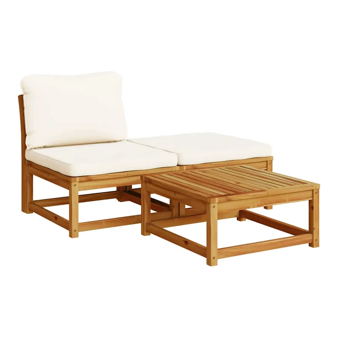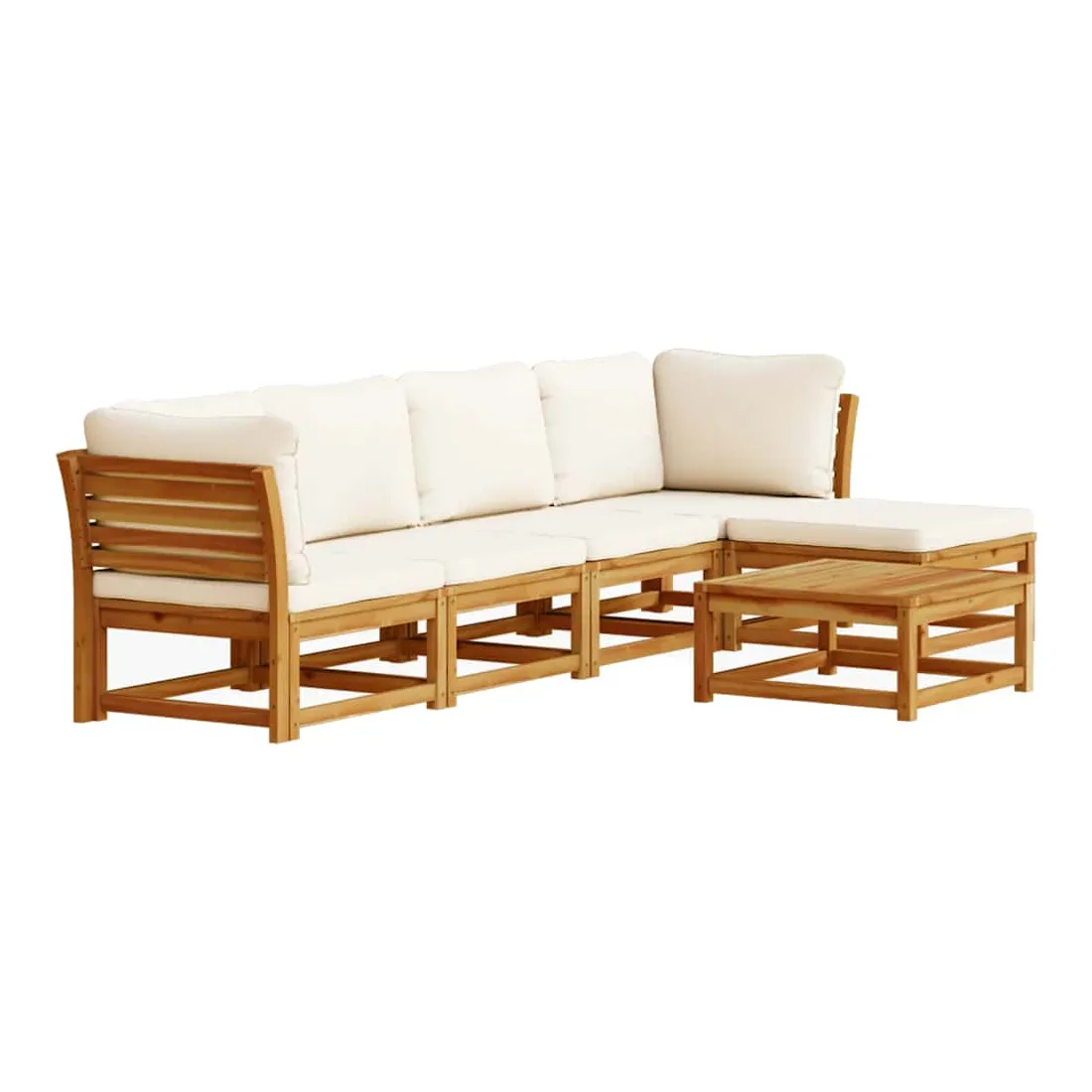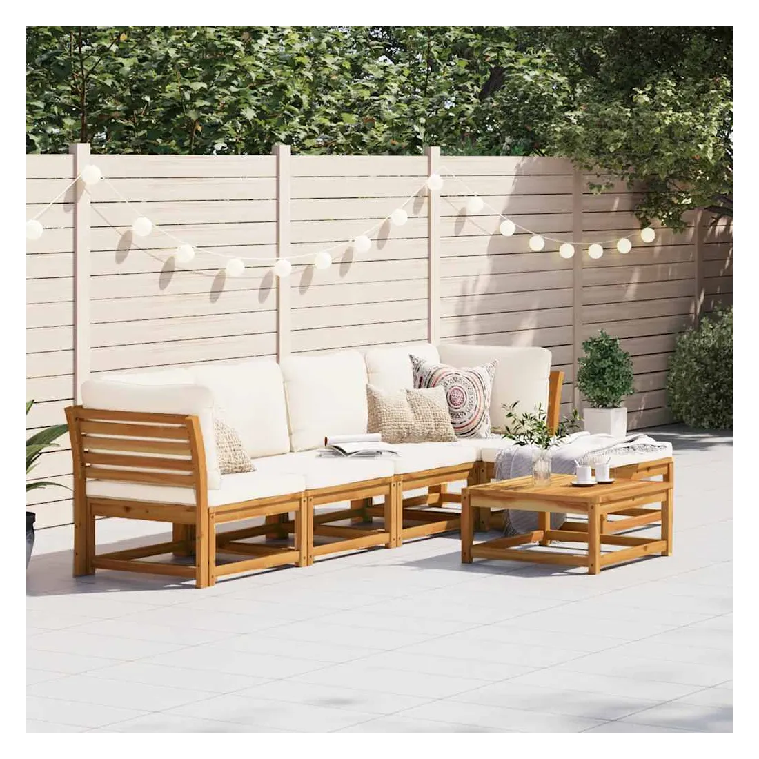 Cet ensemble de salon de jardin en bois avec coussins a un design élégant et constitue un excellent choix pour vous détendre et profiter du jardin ou du patio. Bois d'acacia massif : le bois d'acacia massif est un matériau naturel magnifique. Le bois d'acacia un bois dur tropical, qui est dense, robuste et durable.Expérience d'assise confortable : le dossier et les coussins rembourrés rendent l’ensemble de canapé de jardin plus confortable pour s'asseoir.Conception à lattes : la conception à lattes de l’ensemble de meubles en bois empêche efficacement l'eau de s'accumuler, ce qui garantit que l'assise reste sèche et exempte de tout risque de pourriture.Conception modulaire : cet ensemble de meubles d'extérieur a une conception modulaire, ce qui le rend complètement flexible et facile à déplacer, afin que vous puissiez créer un agencement de meubles d'extérieur personnalisé. Bon à savoir :Pour que vos meubles d'extérieur restent beaux, nous vous recommandons de les protéger avec une housse imperméable.