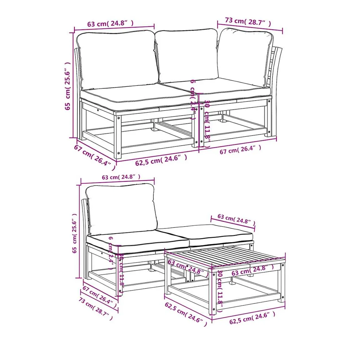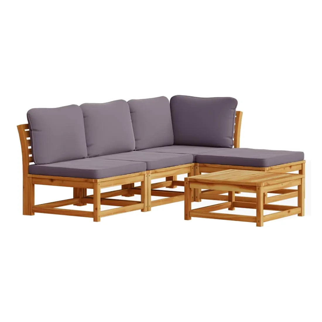 Cet ensemble de salon de jardin en bois avec coussins a un design élégant et constitue un excellent choix pour vous détendre et profiter du jardin ou du patio. Bois d'acacia massif : le bois d'acacia massif est un matériau naturel magnifique. Le bois d'acacia un bois dur tropical, qui est dense, robuste et durable.Expérience d'assise confortable : le dossier et les coussins rembourrés rendent l’ensemble de canapé de jardin plus confortable pour s'asseoir.Conception à lattes : la conception à lattes de l’ensemble de meubles en bois empêche efficacement l'eau de s'accumuler, ce qui garantit que l'assise reste sèche et exempte de tout risque de pourriture.Conception modulaire : cet ensemble de meubles d'extérieur a une conception modulaire, ce qui le rend complètement flexible et facile à déplacer, afin que vous puissiez créer un agencement de meubles d'extérieur personnalisé. Bon à savoir :Pour que vos meubles d'extérieur restent beaux, nous vous recommandons de les protéger avec une housse imperméable.