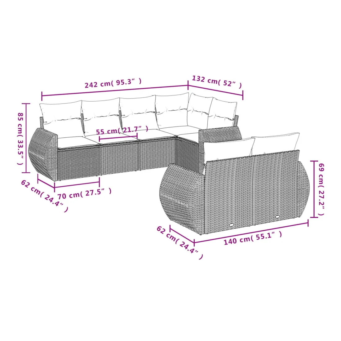 Cet ensemble de canapés de jardin est le complément parfait de votre arrière-cour, terrasse ou patio, offrant un espace confortable et accueillant pour discuter avec la famille et les amis ou simplement se détendre et profiter de l'extérieur. Matériau durable : la résine tressée, également connue sous le nom de poly rotin, est un matériau synthétique solide et nécessitant peu d'entretien qui ressemble au rotin naturel. Il est léger, facile à nettoyer et couramment utilisé pour les meubles d'extérieur en raison de sa durabilité et de ses propriétés de résistance aux intempéries.Expérience d'assise confortable : ce mobilier d'extérieur, doté de coussins épais, offre une expérience d'assise confortable.Housse amovible et lavable : ces coussins de siège sont dotés de housses amovibles pour un lavage et un entretien faciles.Conception modulaire : cet ensemble de meubles d'extérieur a une conception modulaire, ce qui le rend complètement flexible et facile à déplacer, afin que vous puissiez créer un agencement de meubles d'extérieur personnalisé. Bon à savoir :Pour que vos meubles d'extérieur restent beaux, nous vous recommandons de les protéger avec une housse imperméable.