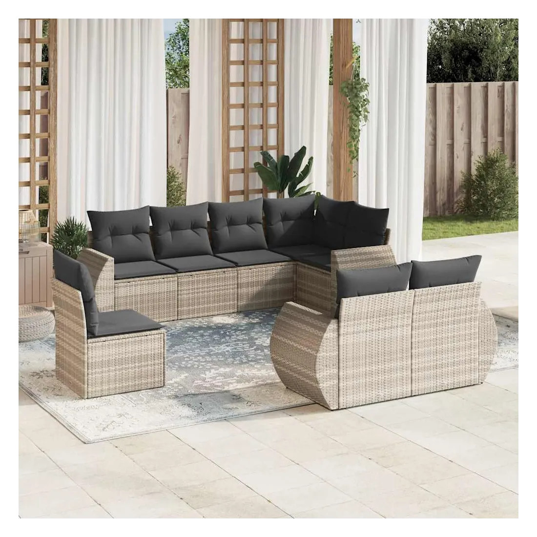 Cet ensemble de canapés de jardin est le complément parfait de votre arrière-cour, terrasse ou patio, offrant un espace confortable et accueillant pour discuter avec la famille et les amis ou simplement se détendre et profiter de l'extérieur. Matériau durable : la résine tressée, également connue sous le nom de poly rotin, est un matériau synthétique solide et nécessitant peu d'entretien qui ressemble au rotin naturel. Il est léger, facile à nettoyer et couramment utilisé pour les meubles d'extérieur en raison de sa durabilité et de ses propriétés de résistance aux intempéries.Expérience d'assise confortable : ce mobilier d'extérieur, doté de coussins épais, offre une expérience d'assise confortable.Housse amovible et lavable : ces coussins de siège sont dotés de housses amovibles pour un lavage et un entretien faciles.Conception modulaire : cet ensemble de meubles d'extérieur a une conception modulaire, ce qui le rend complètement flexible et facile à déplacer, afin que vous puissiez créer un agencement de meubles d'extérieur personnalisé. Bon à savoir :Pour que vos meubles d'extérieur restent beaux, nous vous recommandons de les protéger avec une housse imperméable.