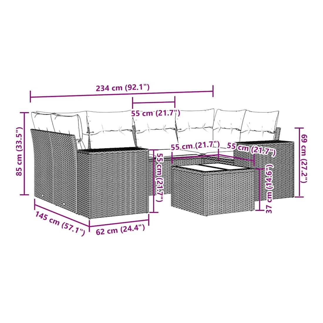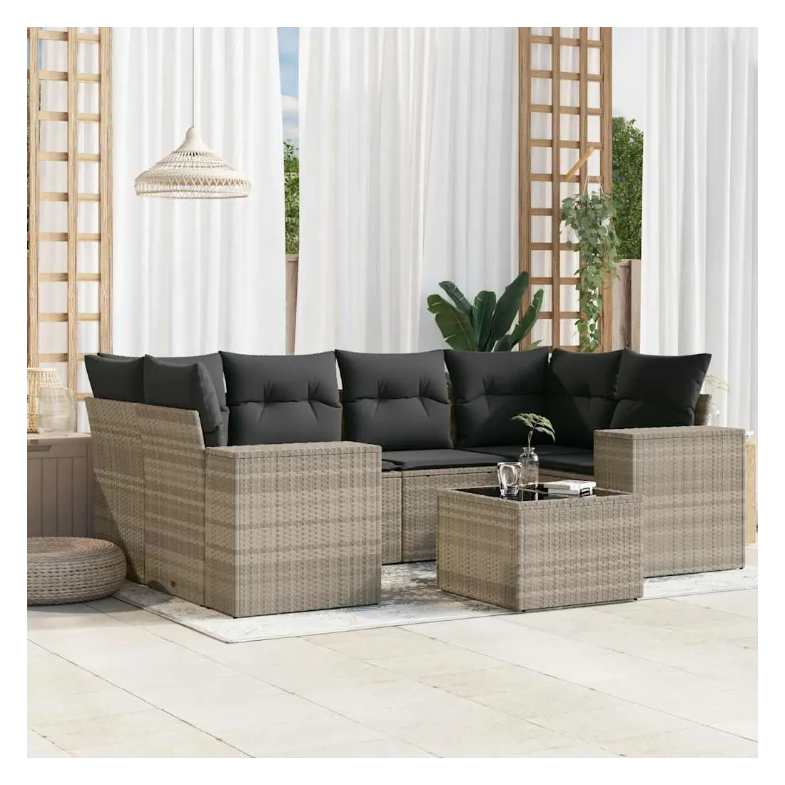 Cet ensemble de canapés de jardin est le complément parfait de votre arrière-cour, terrasse ou patio, offrant un espace confortable et accueillant pour discuter avec la famille et les amis ou simplement se détendre et profiter de l'extérieur. Matériau durable : la résine tressée, également connue sous le nom de poly rotin, est un matériau synthétique solide et nécessitant peu d'entretien qui ressemble au rotin naturel. Il est léger, facile à nettoyer et couramment utilisé pour les meubles d'extérieur en raison de sa durabilité et de ses propriétés de résistance aux intempéries.Dessus en verre : le dessus de la table d'extérieur est fabriqué en verre trempé solide et durable, ce qui le rend facile à nettoyer avec un chiffon humide et ajoute une touche d'élégance à votre espace extérieur.Expérience d'assise confortable : ce mobilier d'extérieur, doté de coussins épais, offre une expérience d'assise confortable.Housse amovible et lavable : ces coussins de siège sont dotés de housses amovibles pour un lavage et un entretien faciles.Conception modulaire : cet ensemble de meubles d'extérieur a une conception modulaire, ce qui le rend complètement flexible et facile à déplacer, afin que vous puissiez créer un agencement de meubles d'extérieur personnalisé. Bon à savoir :Pour que vos meubles d'extérieur restent beaux, nous vous recommandons de les protéger avec une housse imperméable.