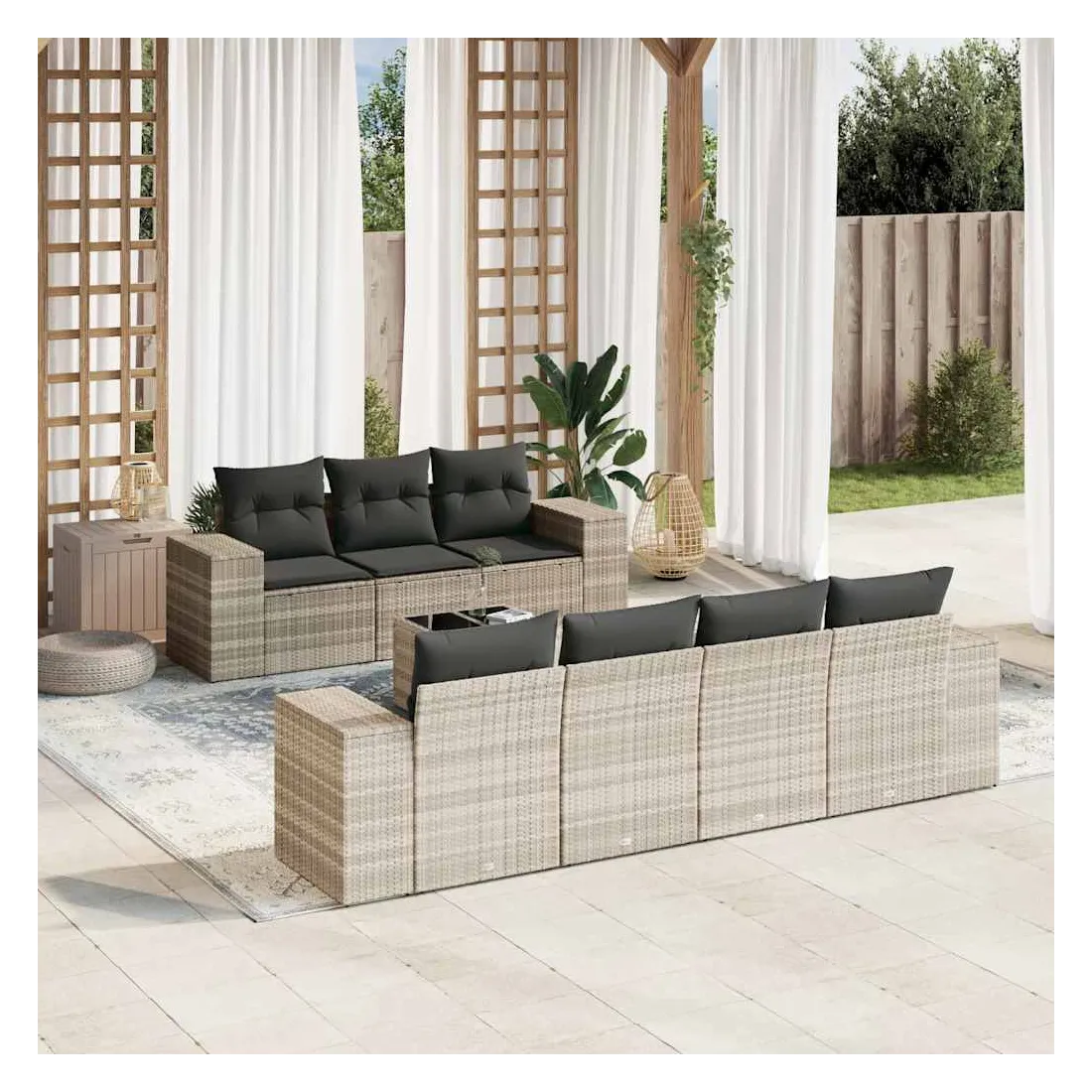 Cet ensemble de canapés de jardin est le complément parfait de votre arrière-cour, terrasse ou patio, offrant un espace confortable et accueillant pour discuter avec la famille et les amis ou simplement se détendre et profiter de l'extérieur. Matériau durable : la résine tressée, également connue sous le nom de poly rotin, est un matériau synthétique solide et nécessitant peu d'entretien qui ressemble au rotin naturel. Il est léger, facile à nettoyer et couramment utilisé pour les meubles d'extérieur en raison de sa durabilité et de ses propriétés de résistance aux intempéries.Dessus en verre : le dessus de la table d'extérieur est fabriqué en verre trempé solide et durable, ce qui le rend facile à nettoyer avec un chiffon humide et ajoute une touche d'élégance à votre espace extérieur.Expérience d'assise confortable : ce mobilier d'extérieur, doté de coussins épais, offre une expérience d'assise confortable.Housse amovible et lavable : ces coussins de siège sont dotés de housses amovibles pour un lavage et un entretien faciles.Conception modulaire : cet ensemble de meubles d'extérieur a une conception modulaire, ce qui le rend complètement flexible et facile à déplacer, afin que vous puissiez créer un agencement de meubles d'extérieur personnalisé. Bon à savoir :Pour que vos meubles d'extérieur restent beaux, nous vous recommandons de les protéger avec une housse imperméable.