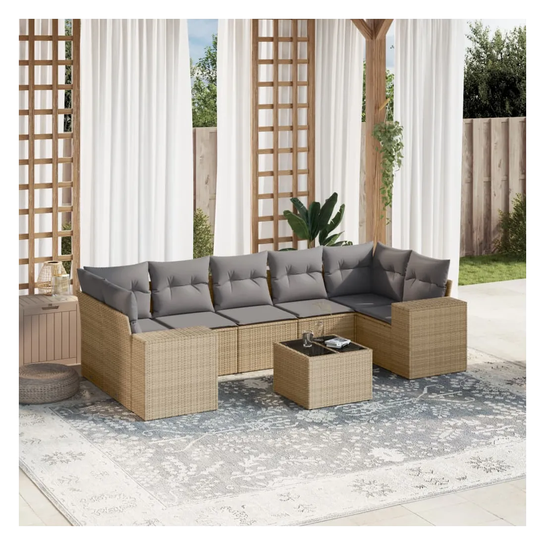 Cet ensemble de canapés de jardin est le complément parfait de votre arrière-cour, terrasse ou patio, offrant un espace confortable et accueillant pour discuter avec la famille et les amis ou simplement se détendre et profiter de l'extérieur. Matériau durable : la résine tressée, également connue sous le nom de poly rotin, est un matériau synthétique solide et nécessitant peu d'entretien qui ressemble au rotin naturel. Il est léger, facile à nettoyer et couramment utilisé pour les meubles d'extérieur en raison de sa durabilité et de ses propriétés de résistance aux intempéries.Dessus en verre : le dessus de la table d'extérieur est fabriqué en verre trempé solide et durable, ce qui le rend facile à nettoyer avec un chiffon humide et ajoute une touche d'élégance à votre espace extérieur.Expérience d'assise confortable : ce mobilier d'extérieur, doté de coussins épais, offre une expérience d'assise confortable.Housse amovible et lavable : ces coussins de siège sont dotés de housses amovibles pour un lavage et un entretien faciles.Conception modulaire : cet ensemble de meubles d'extérieur a une conception modulaire, ce qui le rend complètement flexible et facile à déplacer, afin que vous puissiez créer un agencement de meubles d'extérieur personnalisé. Bon à savoir :Pour que vos meubles d'extérieur restent beaux, nous vous recommandons de les protéger avec une housse imperméable.