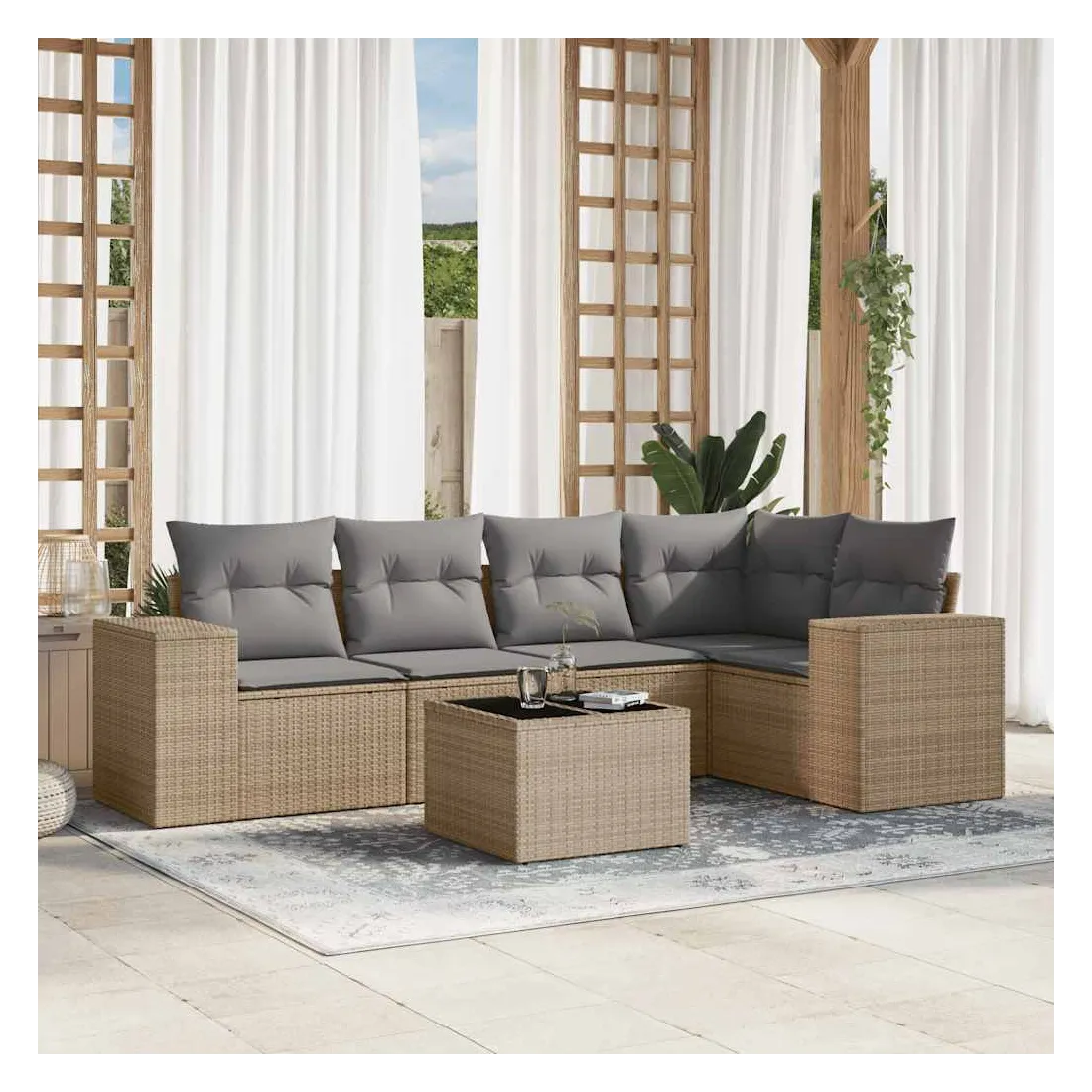 Cet ensemble de canapés de jardin est le complément parfait de votre arrière-cour, terrasse ou patio, offrant un espace confortable et accueillant pour discuter avec la famille et les amis ou simplement se détendre et profiter de l'extérieur. Matériau durable : la résine tressée, également connue sous le nom de poly rotin, est un matériau synthétique solide et nécessitant peu d'entretien qui ressemble au rotin naturel. Il est léger, facile à nettoyer et couramment utilisé pour les meubles d'extérieur en raison de sa durabilité et de ses propriétés de résistance aux intempéries.Dessus en verre : le dessus de la table d'extérieur est fabriqué en verre trempé solide et durable, ce qui le rend facile à nettoyer avec un chiffon humide et ajoute une touche d'élégance à votre espace extérieur.Expérience d'assise confortable : ce mobilier d'extérieur, doté de coussins épais, offre une expérience d'assise confortable.Housse amovible et lavable : ces coussins de siège sont dotés de housses amovibles pour un lavage et un entretien faciles.Conception modulaire : cet ensemble de meubles d'extérieur a une conception modulaire, ce qui le rend complètement flexible et facile à déplacer, afin que vous puissiez créer un agencement de meubles d'extérieur personnalisé. Bon à savoir :Pour que vos meubles d'extérieur restent beaux, nous vous recommandons de les protéger avec une housse imperméable.