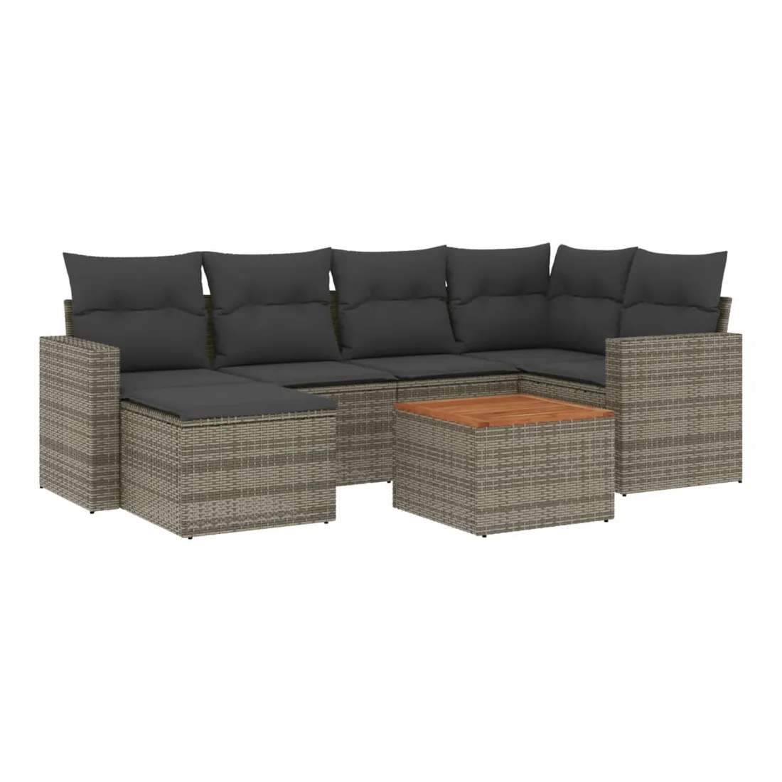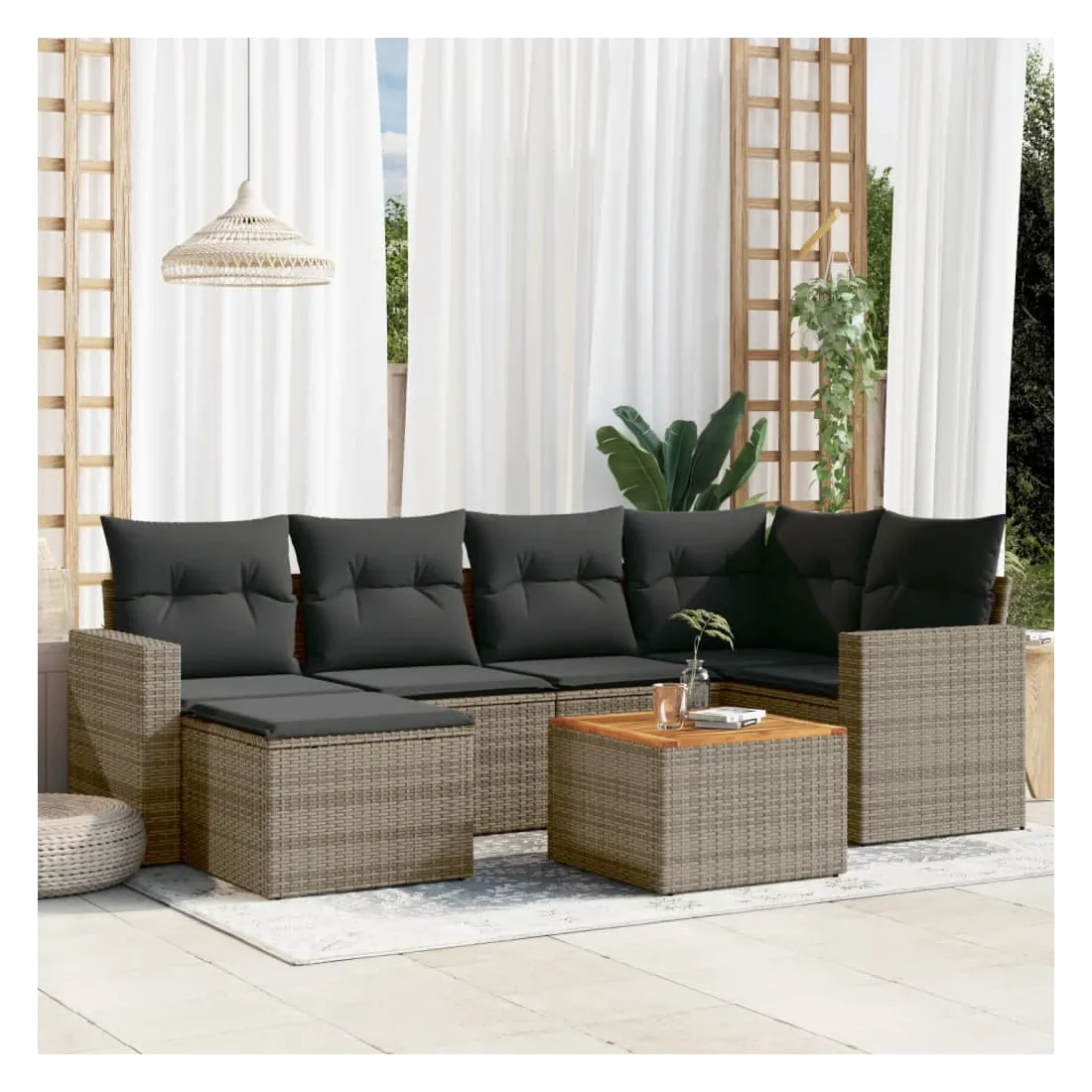 Cet ensemble de canapés de jardin est le complément parfait de votre arrière-cour, terrasse ou patio, offrant un espace confortable et accueillant pour discuter avec la famille et les amis ou simplement se détendre et profiter de l'extérieur. Matériau durable : la résine tressée, également connue sous le nom de poly rotin, est un matériau synthétique solide et nécessitant peu d'entretien qui ressemble au rotin naturel. Il est léger, facile à nettoyer et couramment utilisé pour les meubles d'extérieur en raison de sa durabilité et de ses propriétés de résistance aux intempéries.Dessus stable et facile à nettoyer : cette table de jardin a un dessus en bois d'acacia robuste, durable et facile à nettoyer avec un chiffon humide.Expérience d'assise confortable : ce mobilier d'extérieur, doté de coussins épais, offre une expérience d'assise confortable.Housse amovible et lavable : ces coussins de siège sont dotés de housses amovibles pour un lavage et un entretien faciles.Conception modulaire : cet ensemble de meubles d'extérieur a une conception modulaire, ce qui le rend complètement flexible et facile à déplacer, afin que vous puissiez créer un agencement de meubles d'extérieur personnalisé. Bon à savoir :Pour que vos meubles d'extérieur restent beaux, nous vous recommandons de les protéger avec une housse imperméable.