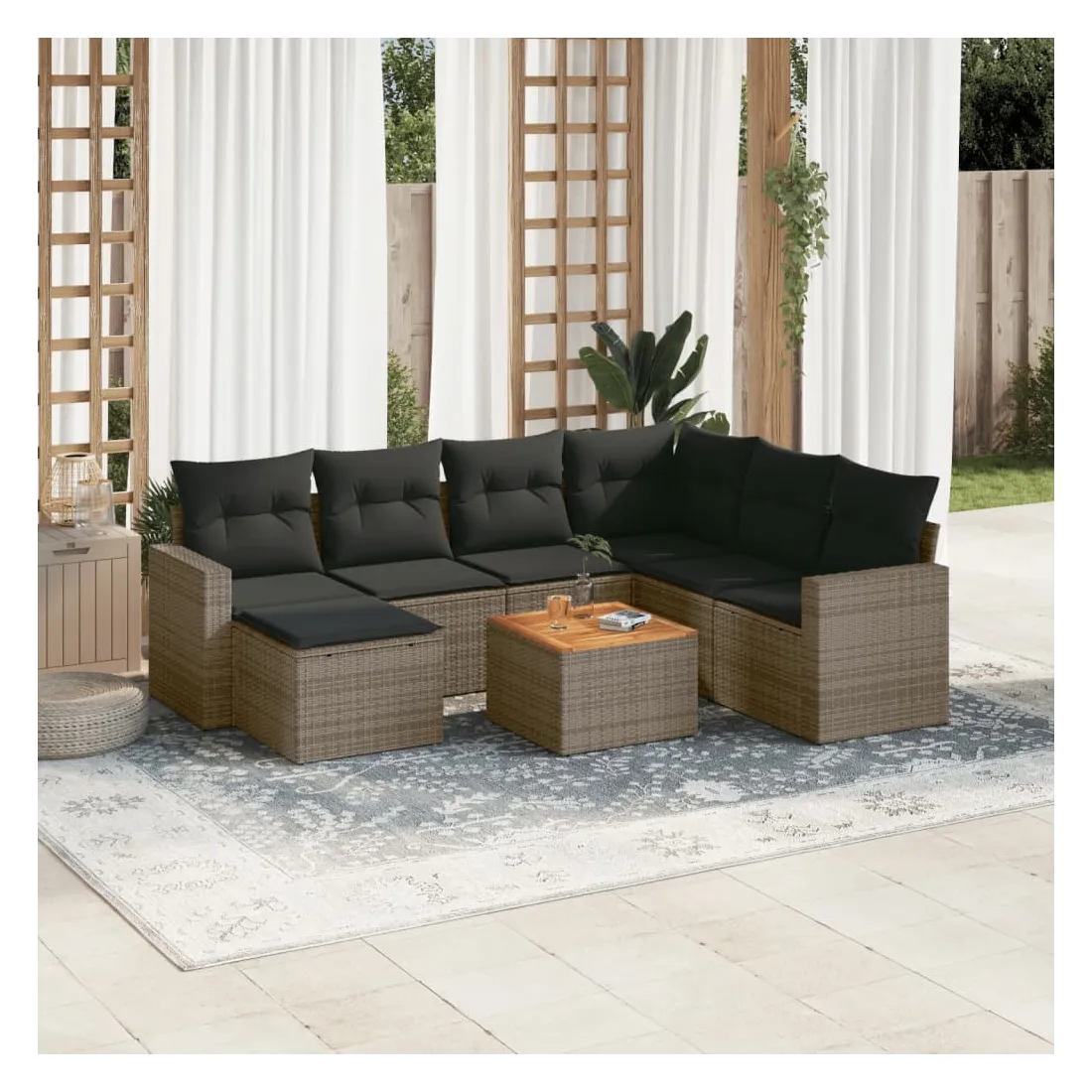 Cet ensemble de canapés de jardin est le complément parfait de votre arrière-cour, terrasse ou patio, offrant un espace confortable et accueillant pour discuter avec la famille et les amis ou simplement se détendre et profiter de l'extérieur. Matériau durable : la résine tressée, également connue sous le nom de poly rotin, est un matériau synthétique solide et nécessitant peu d'entretien qui ressemble au rotin naturel. Il est léger, facile à nettoyer et couramment utilisé pour les meubles d'extérieur en raison de sa durabilité et de ses propriétés de résistance aux intempéries.Dessus stable et facile à nettoyer : cette table de jardin a un dessus en bois d'acacia robuste, durable et facile à nettoyer avec un chiffon humide.Expérience d'assise confortable : ce mobilier d'extérieur, doté de coussins épais, offre une expérience d'assise confortable.Housse amovible et lavable : ces coussins de siège sont dotés de housses amovibles pour un lavage et un entretien faciles.Conception modulaire : cet ensemble de meubles d'extérieur a une conception modulaire, ce qui le rend complètement flexible et facile à déplacer, afin que vous puissiez créer un agencement de meubles d'extérieur personnalisé. Bon à savoir :Pour que vos meubles d'extérieur restent beaux, nous vous recommandons de les protéger avec une housse imperméable.